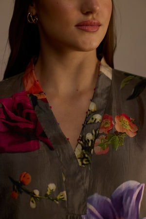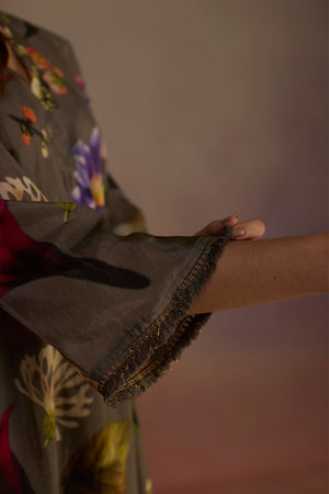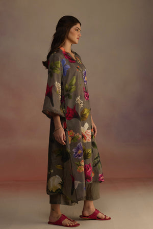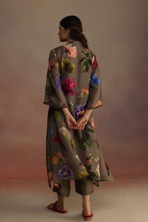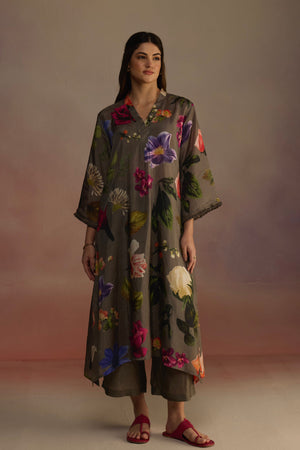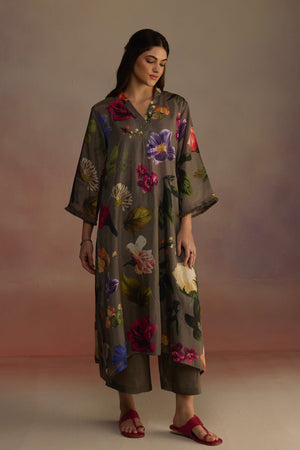 • A-line kurta with hand-drawn florals paired with wide-legged pants for a comfy yet chic festive look, featuring delicate dainty details on the neck and thread detailing on the sleeves.