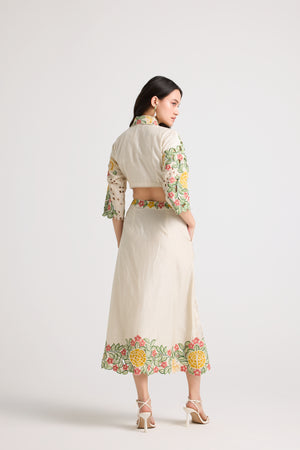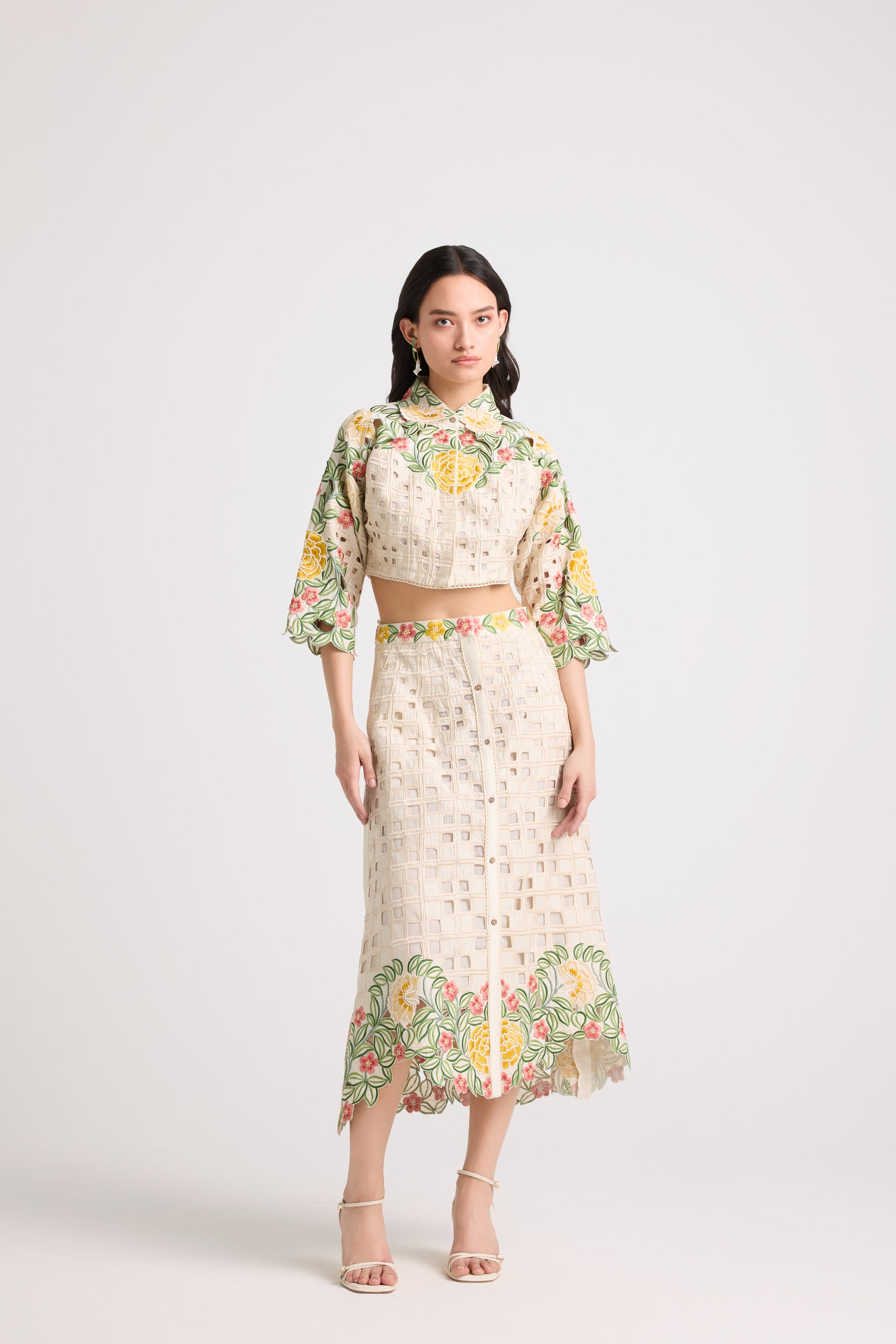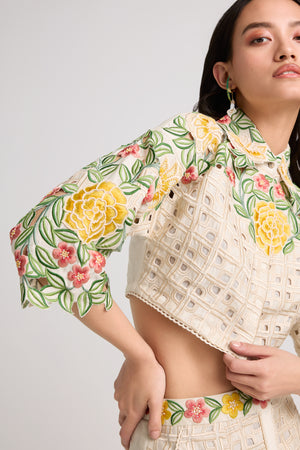 • Ivory chanderi floral threadwork, beadwork, checkered cutwork crop shirt.