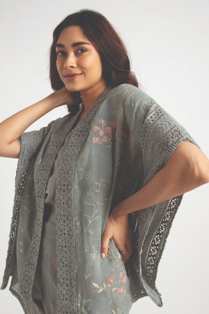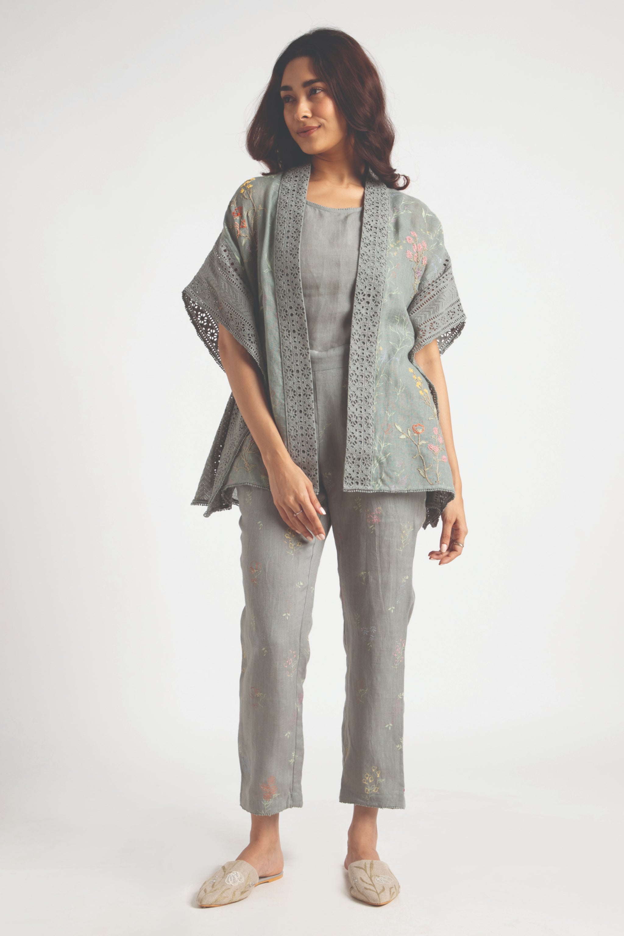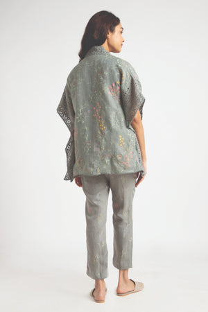 • We venture into the forest on luxurious linen and between the thickets, we witness exuberant blooms that are hand screen printed; accompanied by the sensuality of delicate lace and paired with the embroidered harmony of Hakoba fabric to let you commune with Mother Nature in style. Kaftan Length 28” / Pant Length 35" / Model height 5'8". A beautiful kaftan features delicate lace overlay and mesmerizing screen prints adorned with beautiful embroidery. Each bloom is meticulously crafted, evoking a sense of natural beauty and grace. Adorned with layers of hakoba fabric and hand screen printing with beautiful embroidery makes it more elegant. Comfort Fit