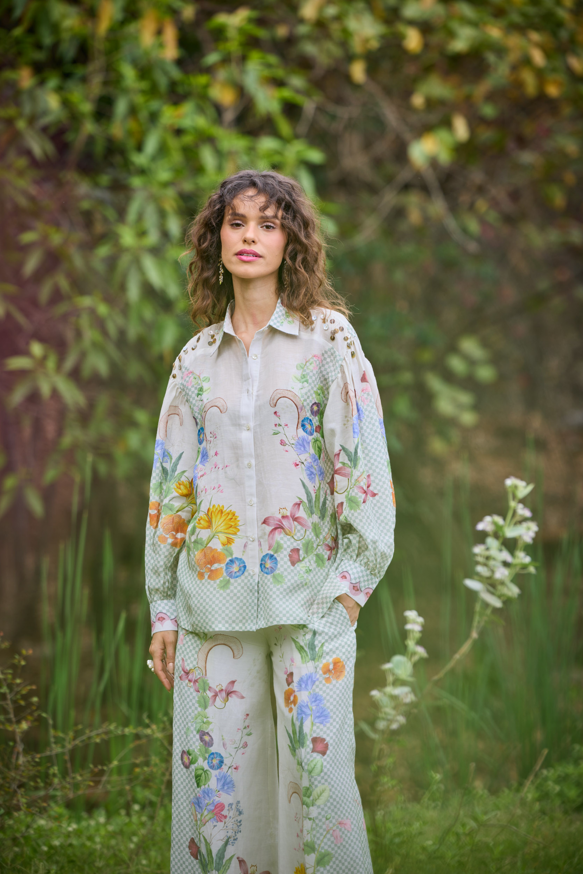 • Imbued with a contemporary feel, this dress is crafted a timeless, classic silhouettes. A three-quarter wide sleeves with a centre-front single inverted pleat. the front yoke is highlighted with lace inserta d hand ebroidery details. Pair it with matching trousers to give a cordinated look. Other attributes: Pure fine hemp Hand embroidered Standard length - 44" Digitally printed Primary color - light green