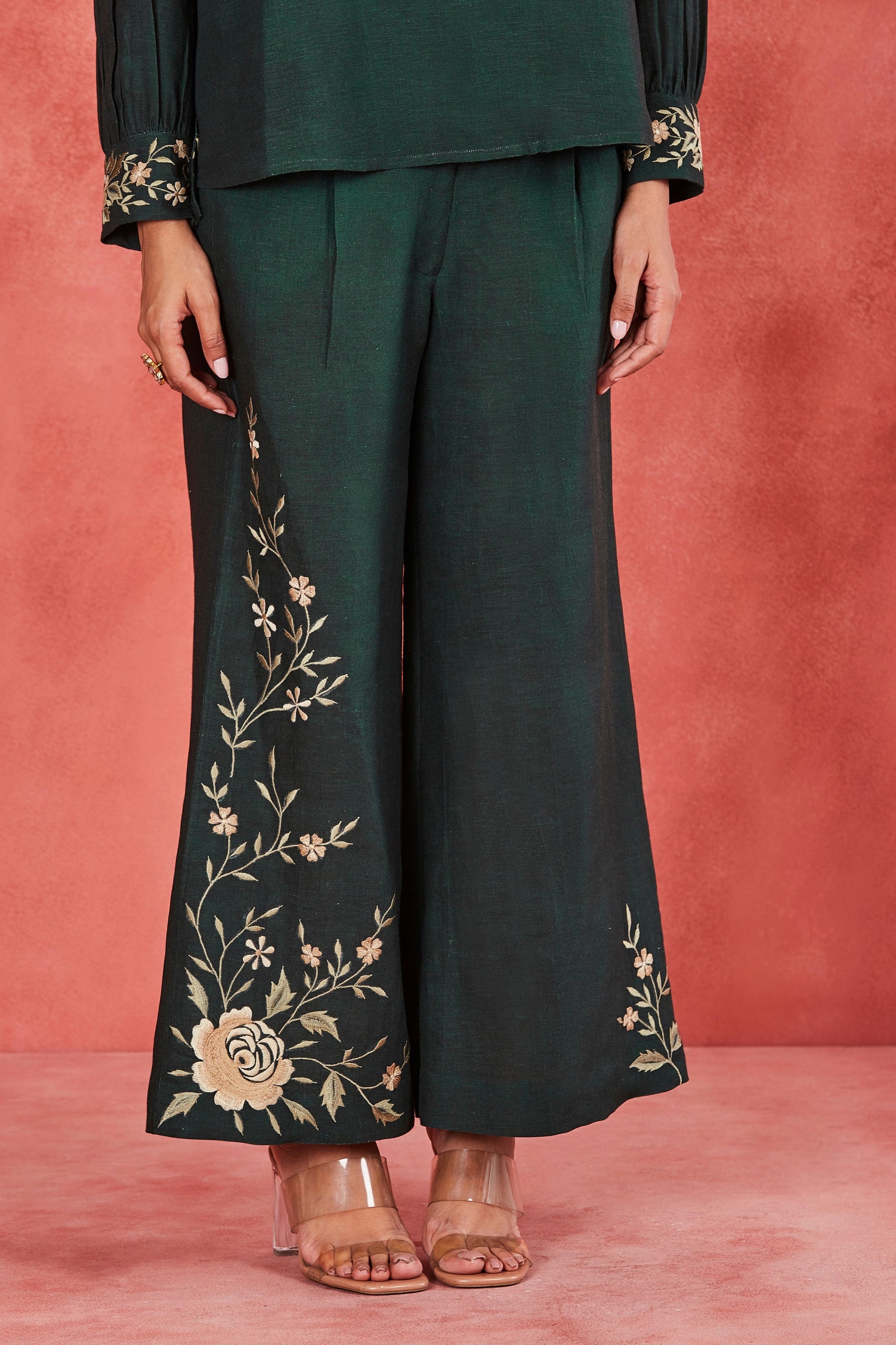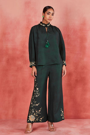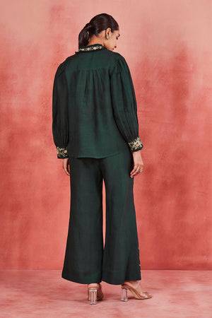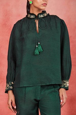 • This is a bottle green pure linen co-ordinate set features a top with stand collar, embellished with delicate lace and tassels, complemented by gathered sleeves and intricate gathers on the shoulders and yoke. It pairs with matching flared pants, adorned with vibrant multi-color silk thread embroidery on the cuffs and side pockets. This handcrafted ensemble showcases unique charm and character. It may have slight irregularities in pattern, colour, or texture, celebrating the craftsmanship and individuality of each piece. Embrace these variations as a part of the product's story, crafted with care and attention to detail.