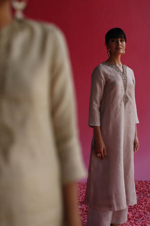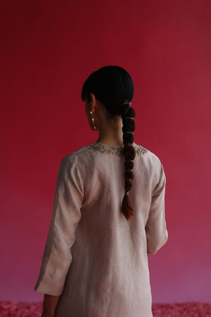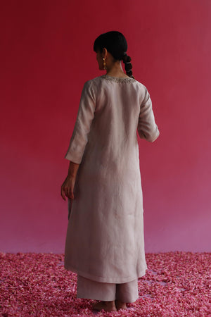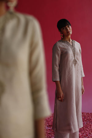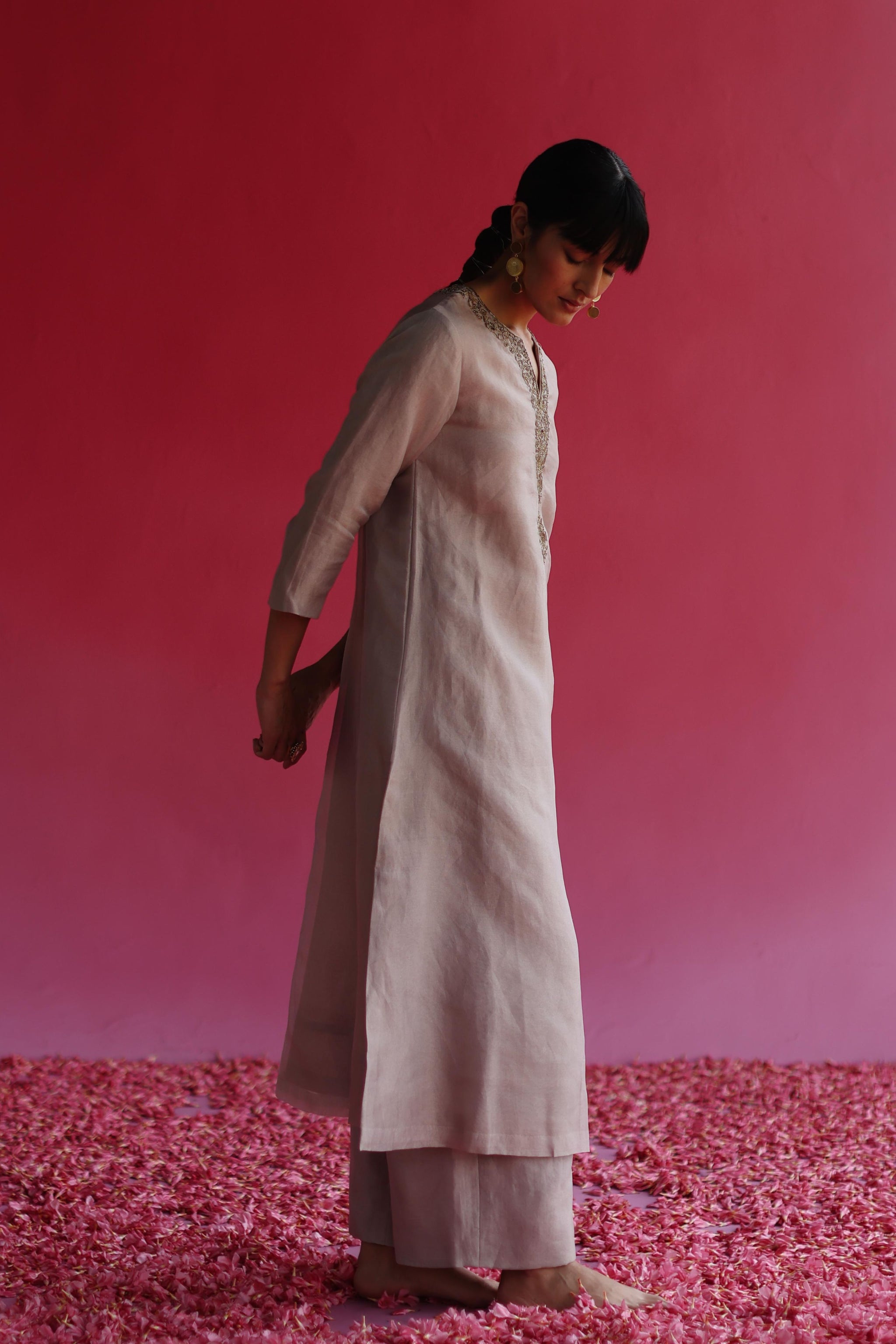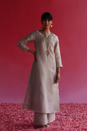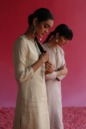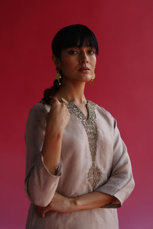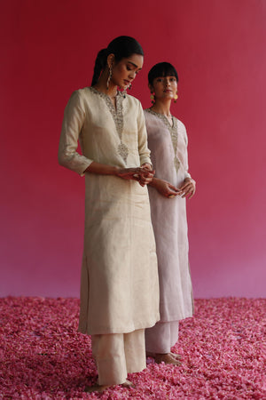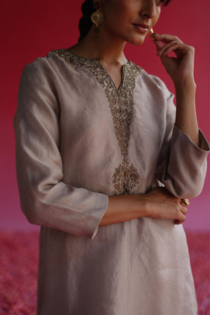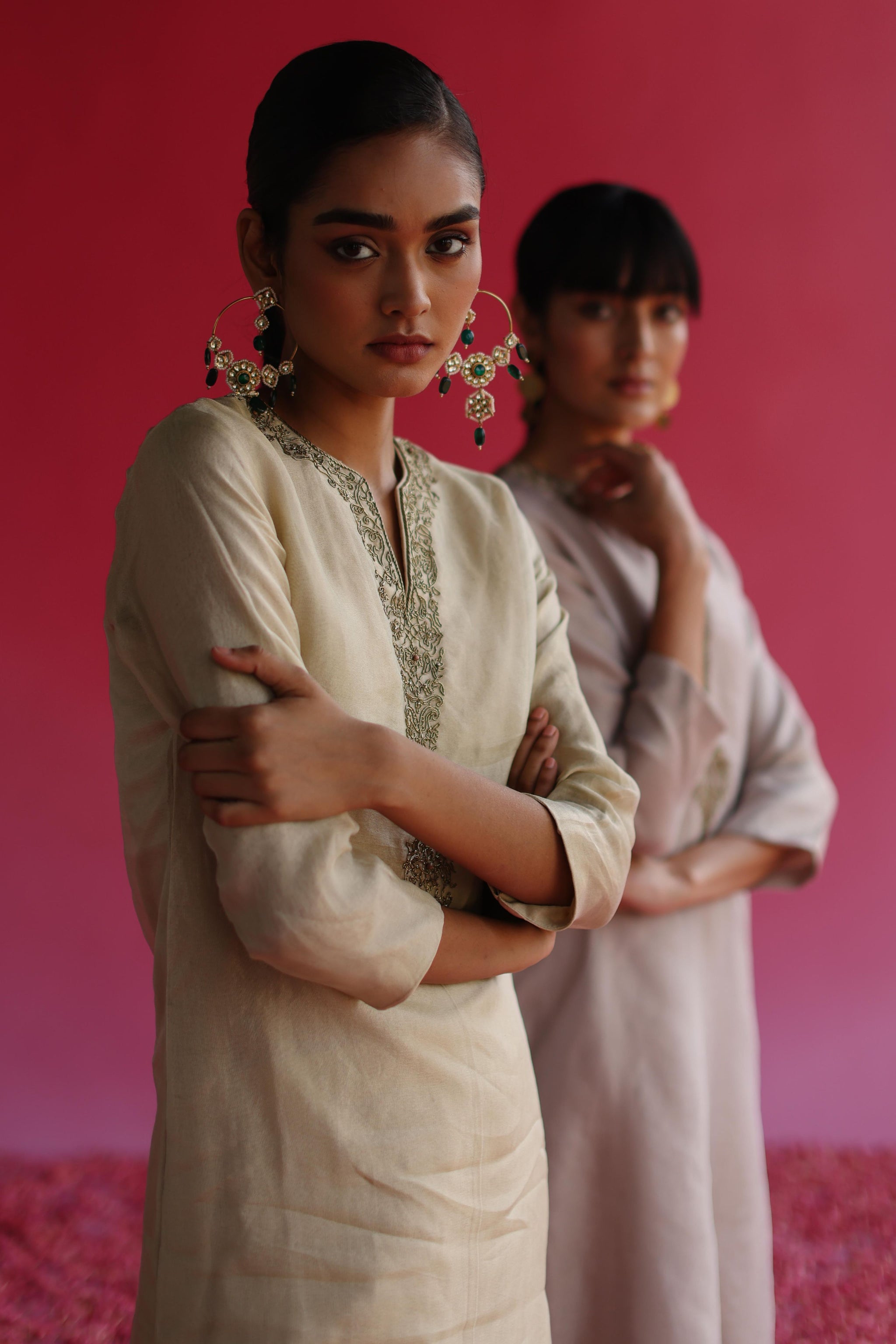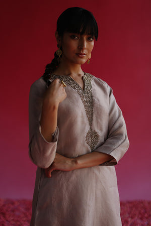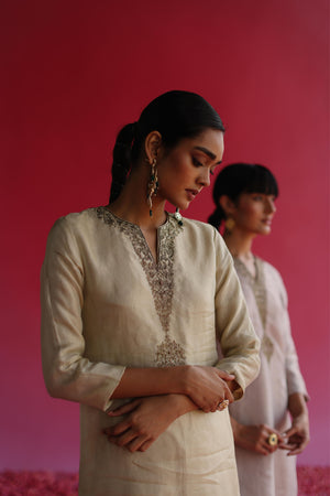 • A pure zari tissue silk long a-line kurta with quarter sleeves having an etherial antique zardozi hand embroidery along the neckline.