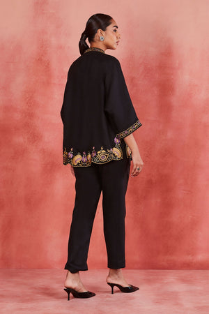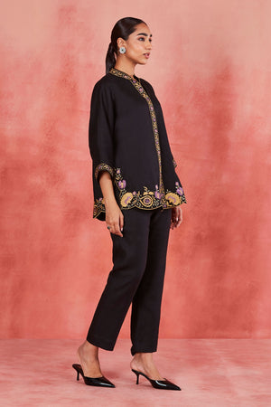 • This black pure linen co-ordinate set embodies timeless elegance. The shirt, with its refined mandarin collar and three-quarter sleeves, gracefully drapes with side slits, revealing intricate multi-color silk thread floral jaal embroidery. Scalloped borders and delicate embroidery on the placket add a touch of sophistication. Paired with matching straight-fit pants with side pockets. This handcrafted ensemble showcases unique charm and character. It may have slight irregularities in pattern, colour, or texture, celebrating the craftsmanship and individuality of each piece. Embrace these variations as a part of the product's story, crafted with care and attention to detail.