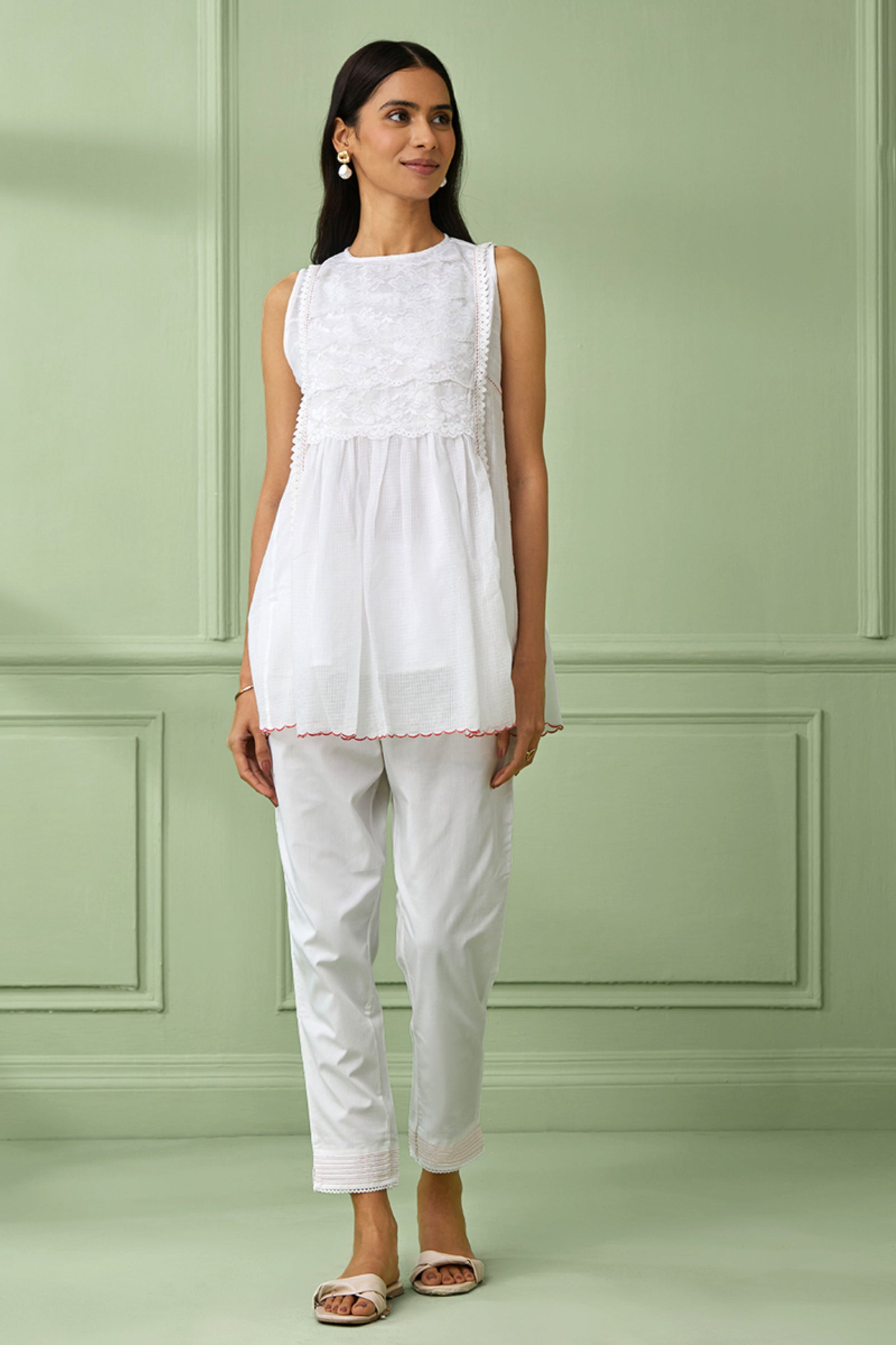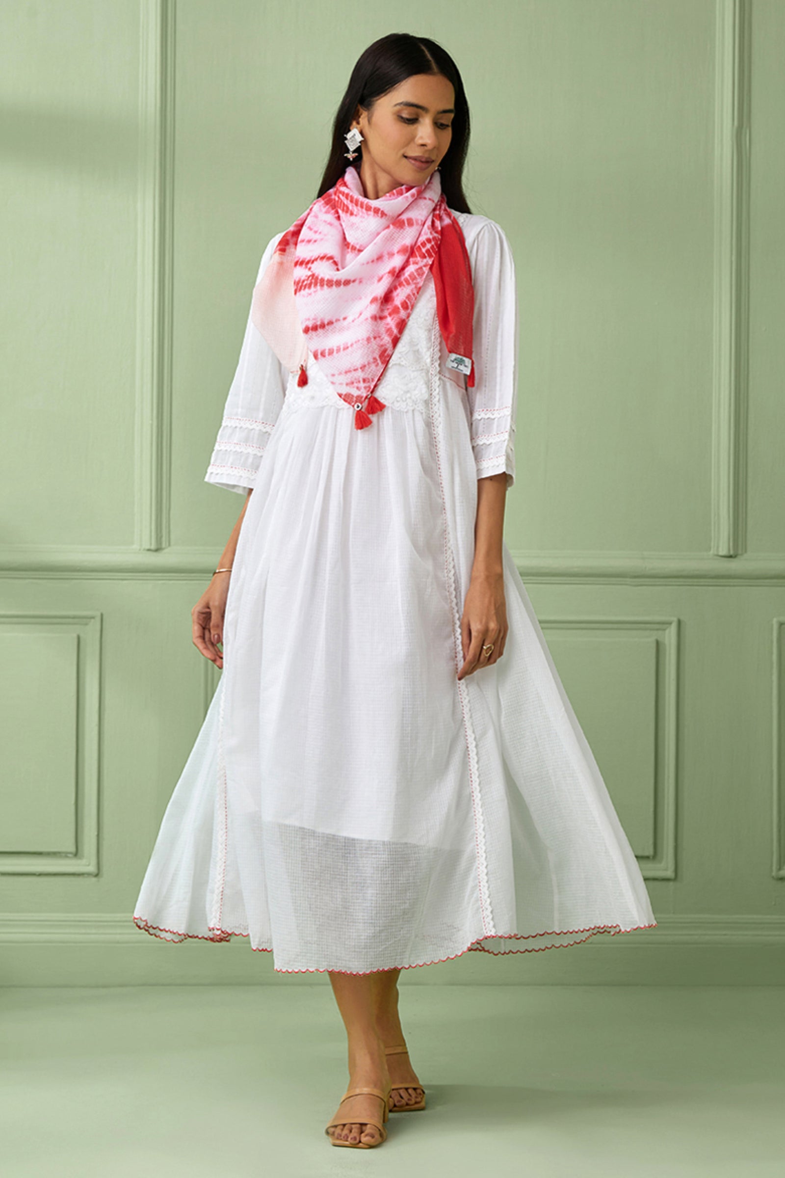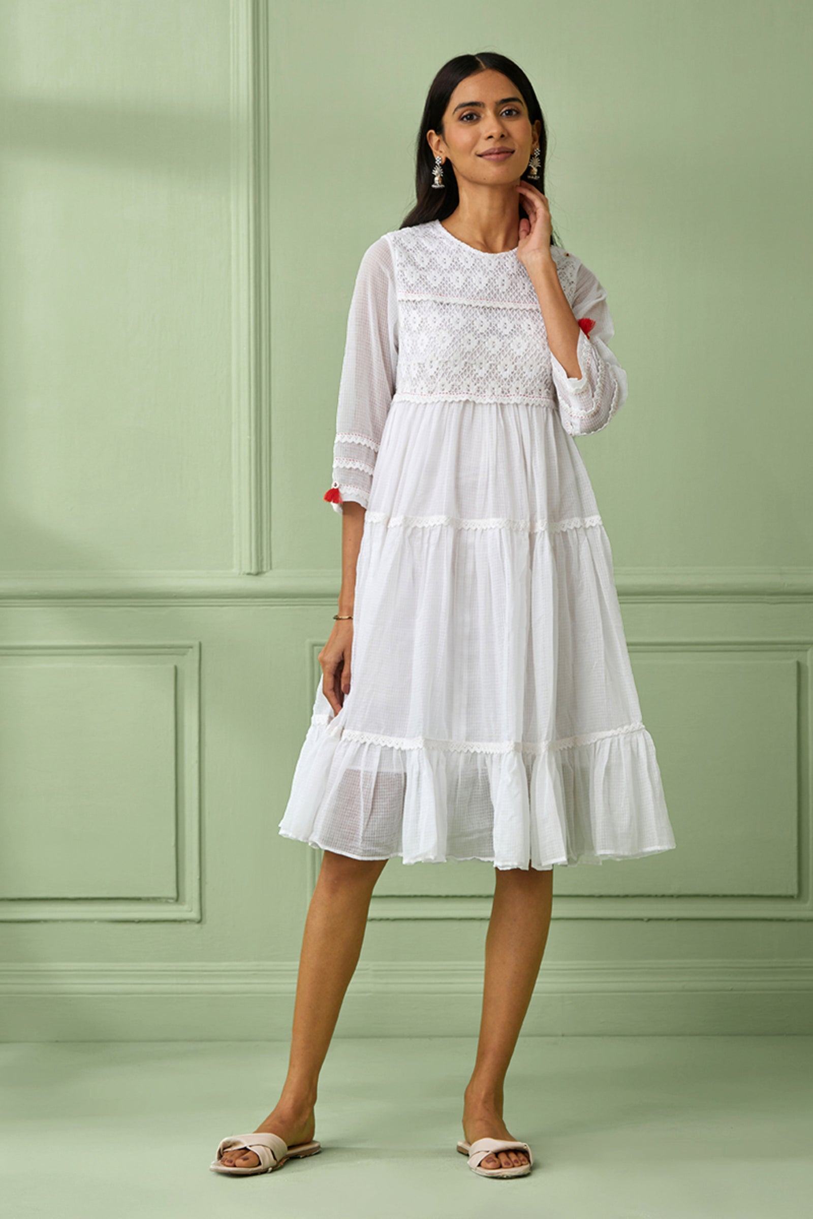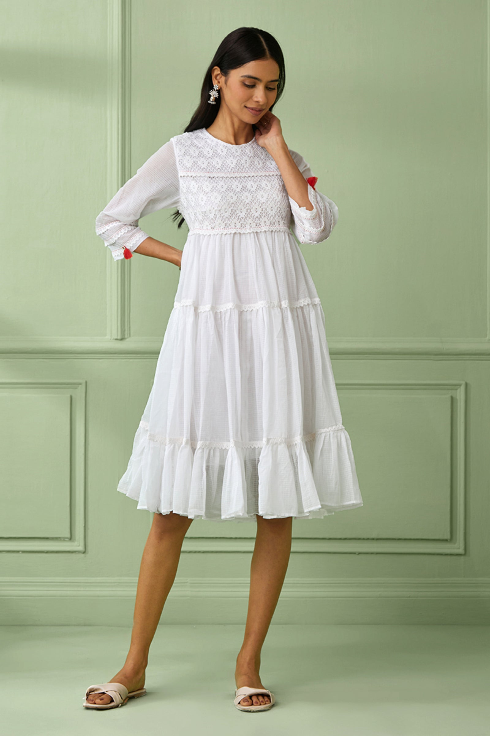 • A white lace dress with gathered body, sleeve and contrast highlights in red.