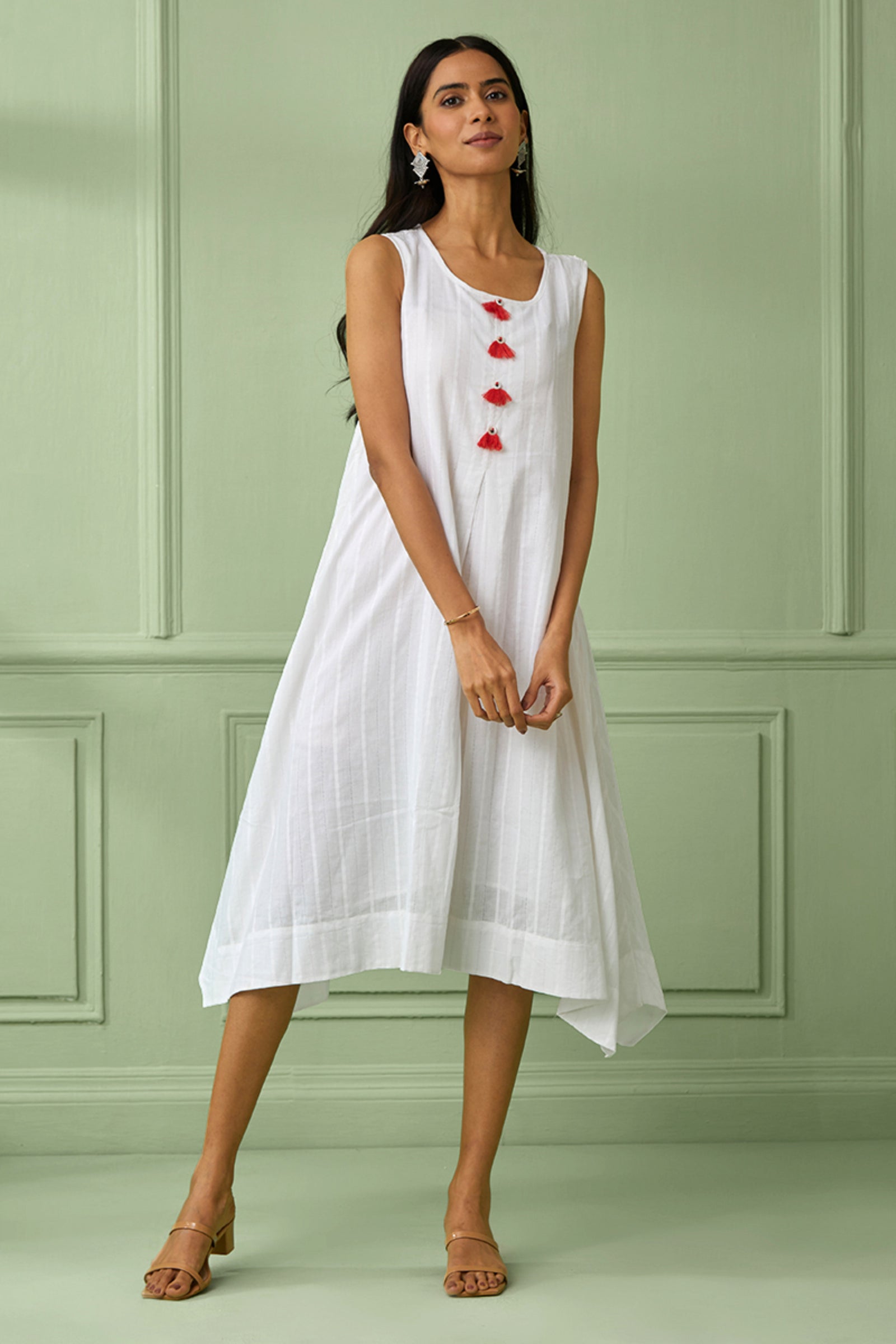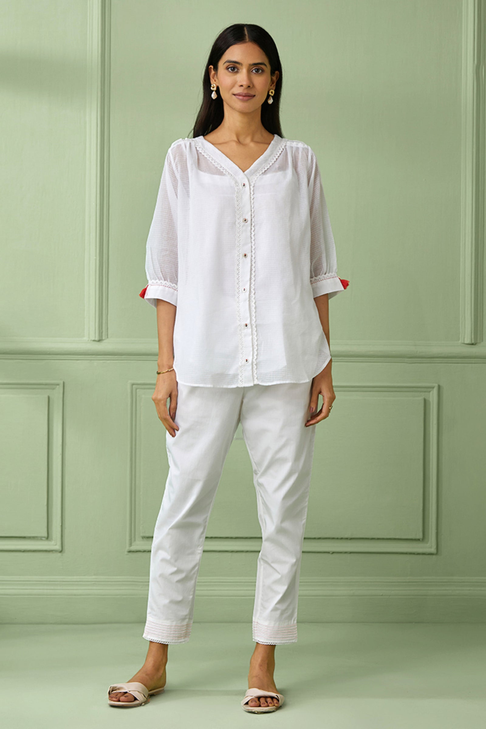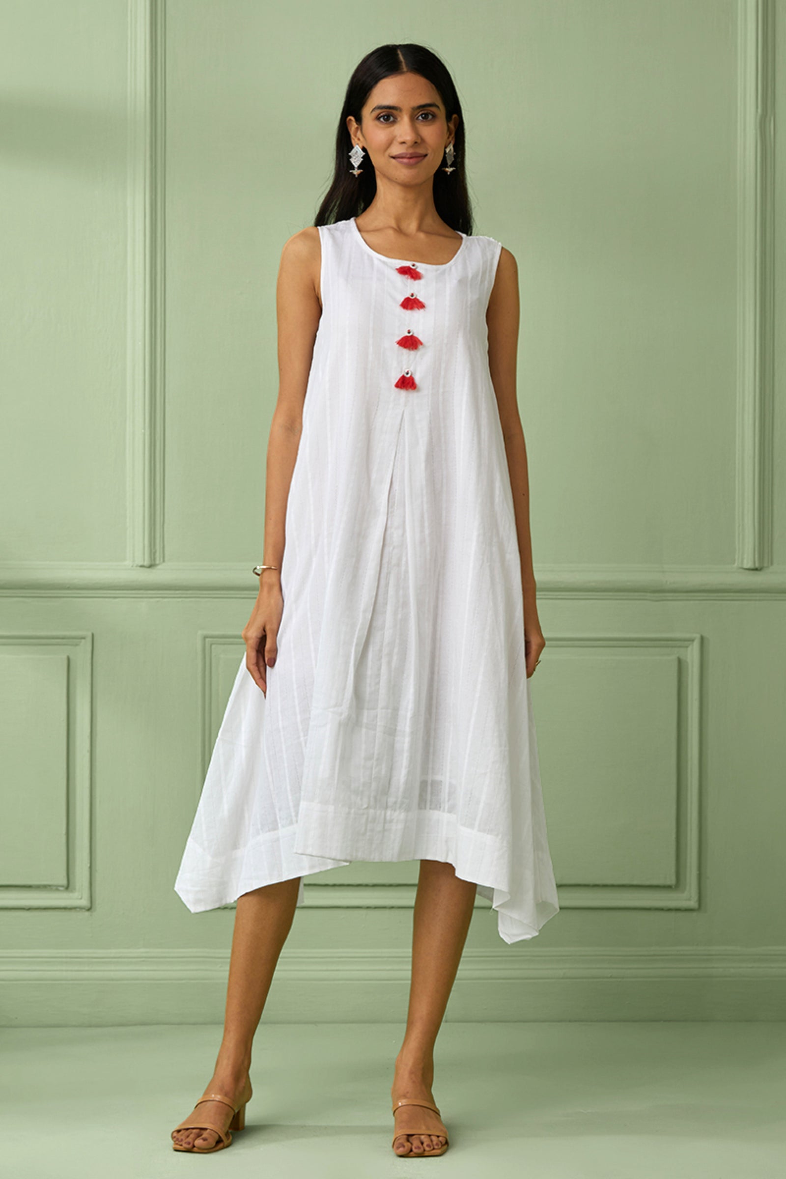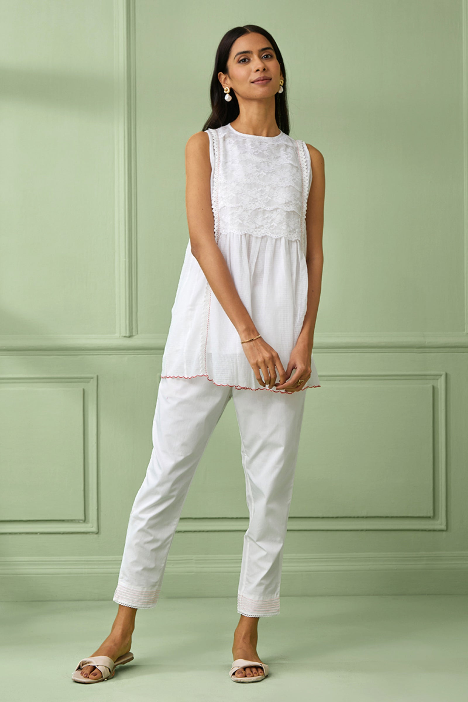 • A white lace dress with gathered body, sleeve and contrast highlights in red.