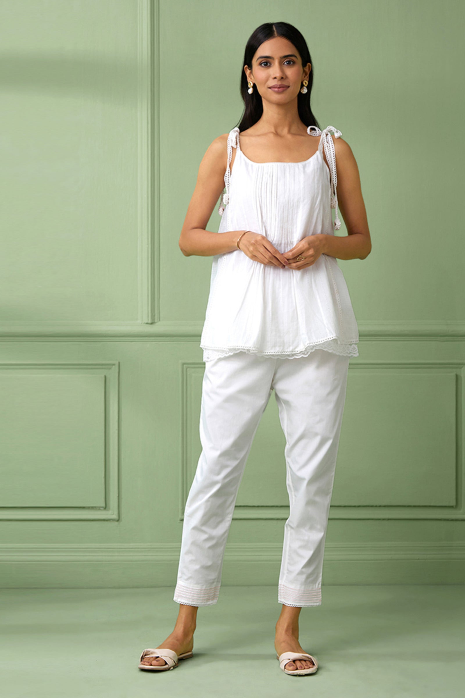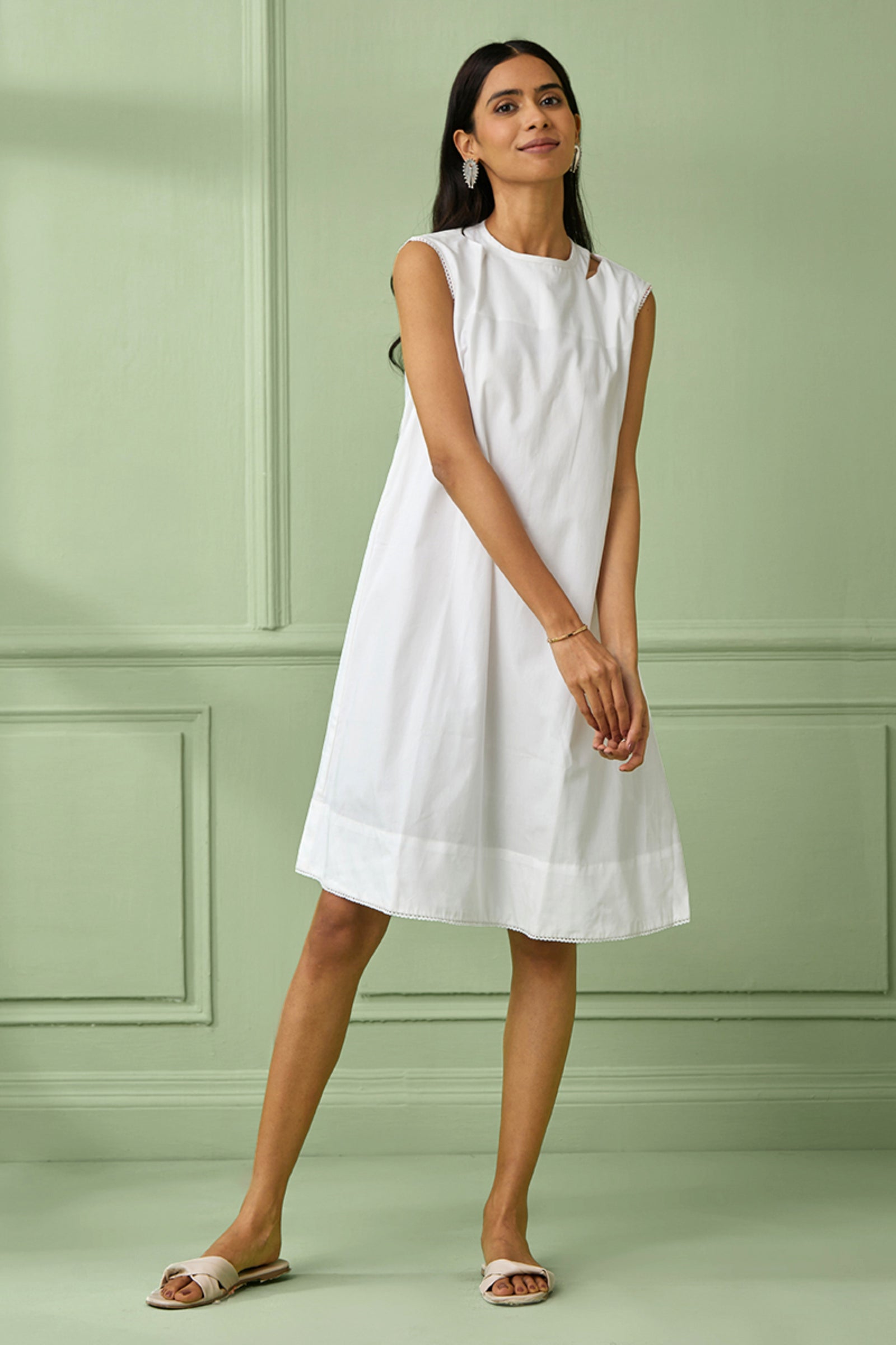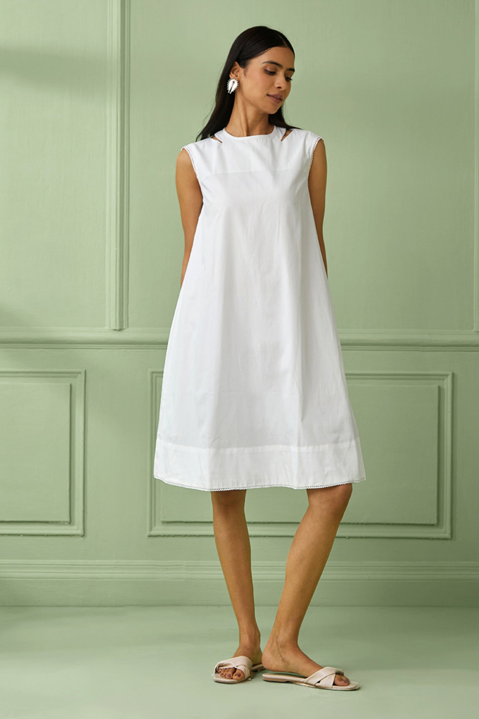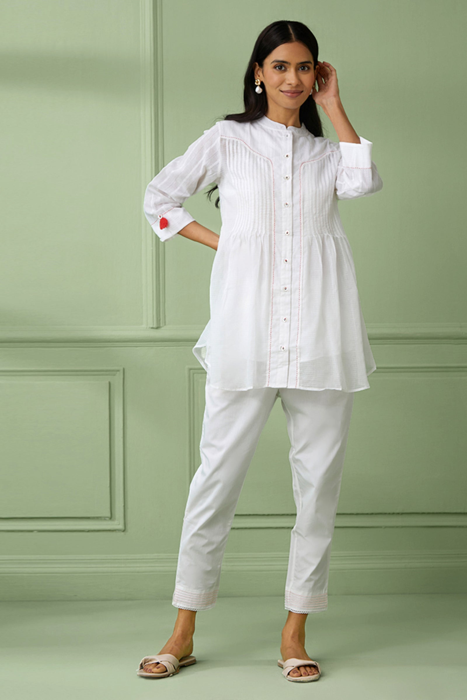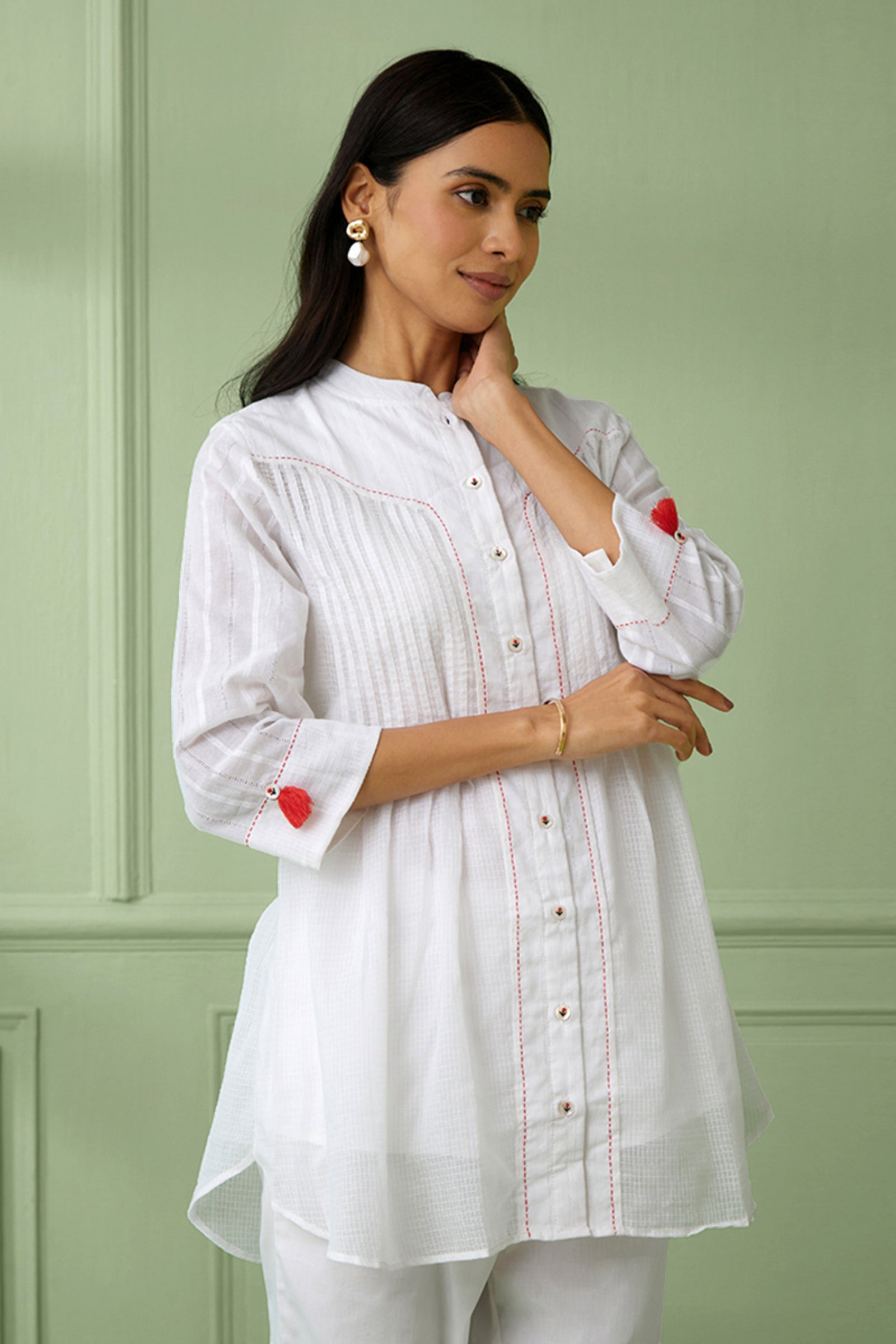 • A white lace dress with gathered body, sleeve and contrast highlights in red.