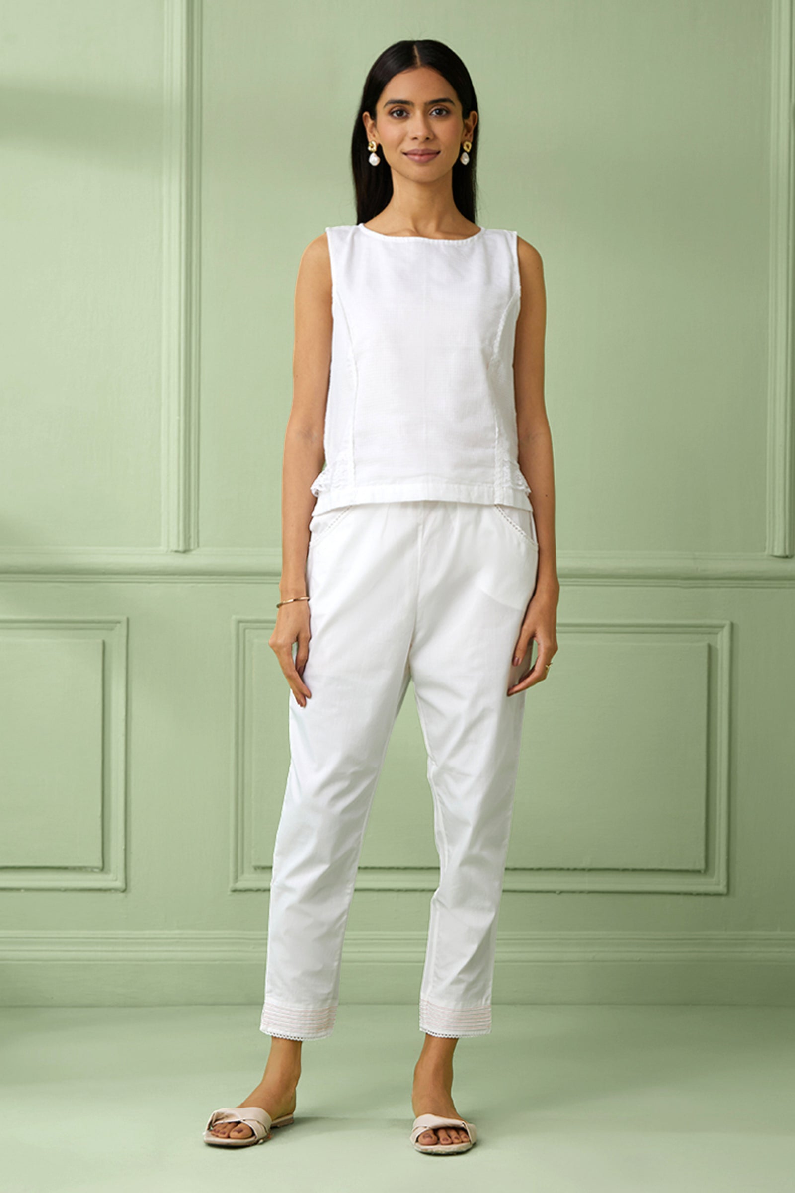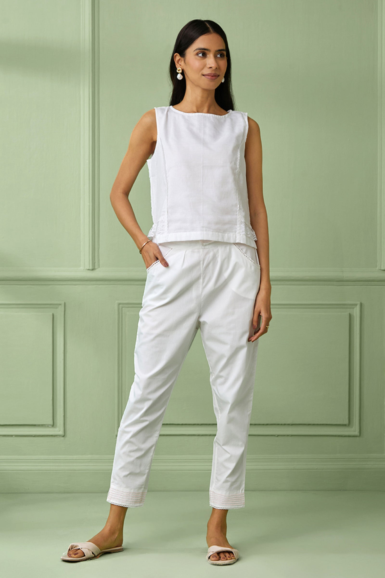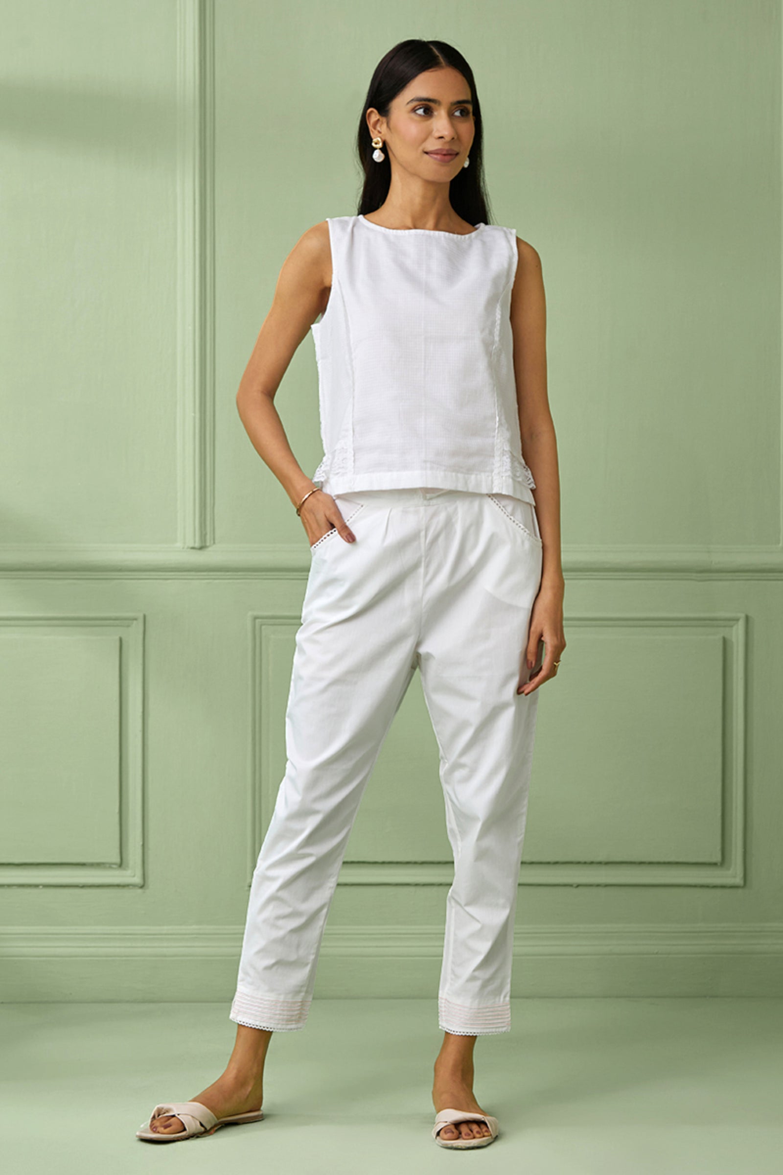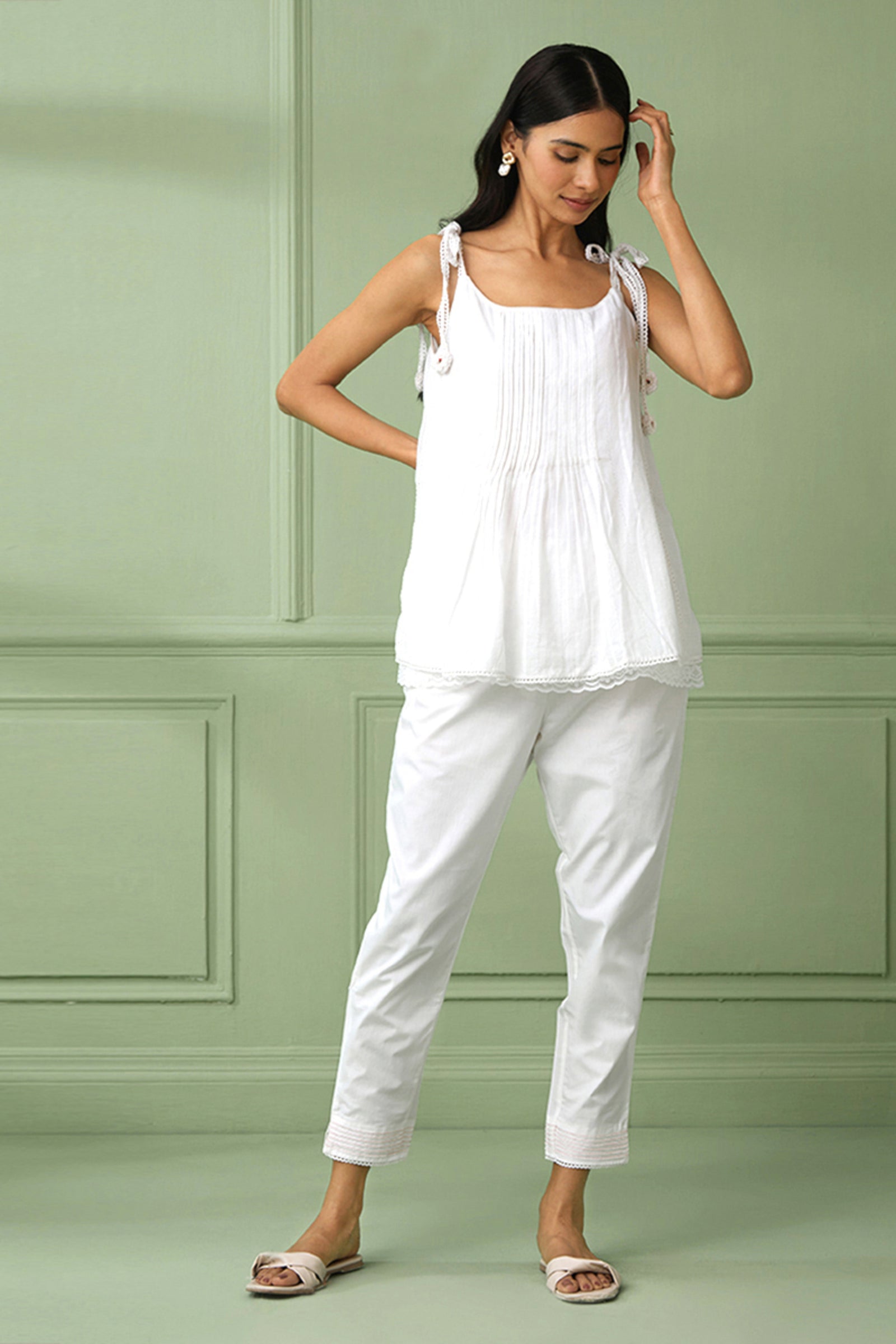 • A white lace dress with gathered body, sleeve and contrast highlights in red.