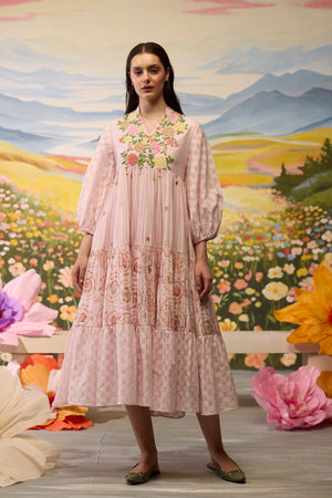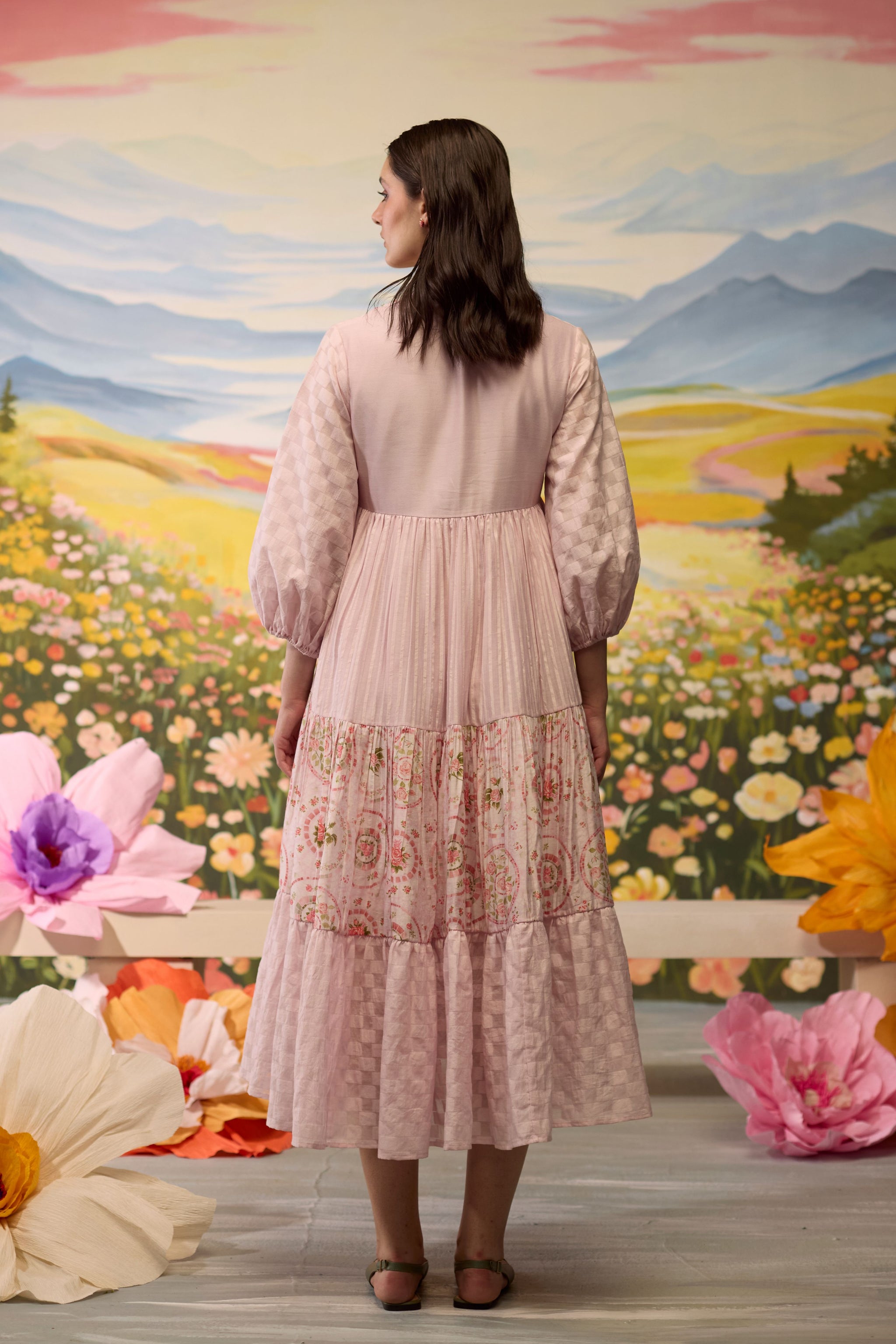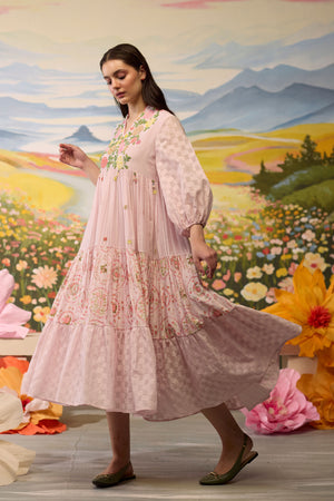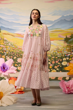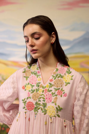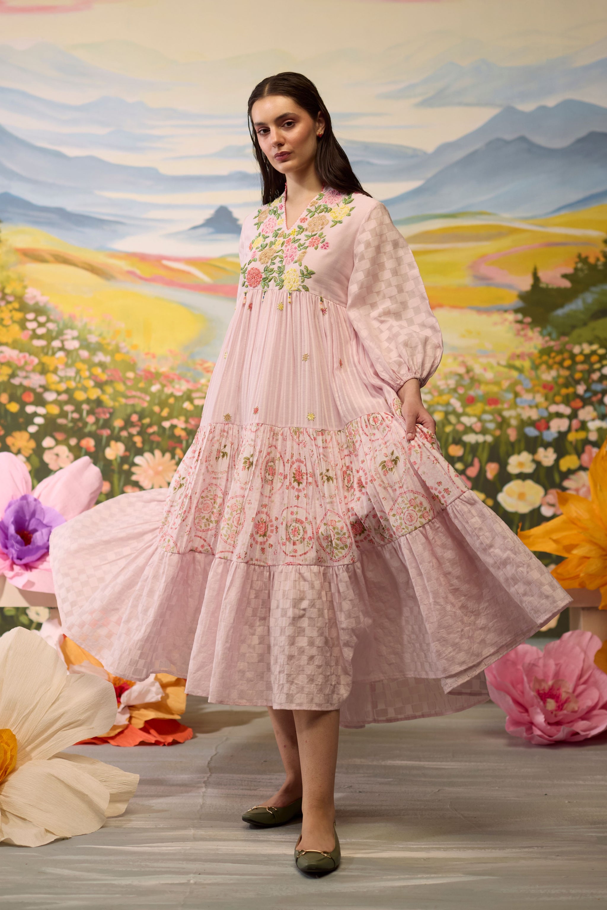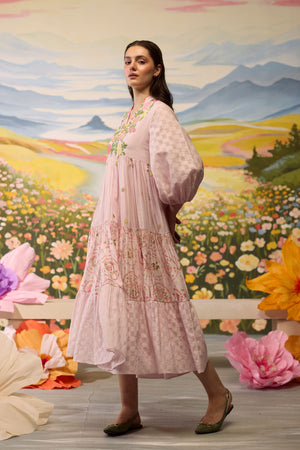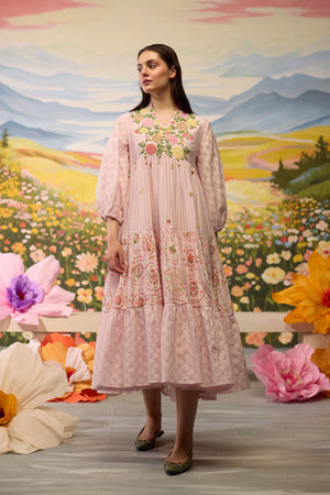 • Lavender floral dress, crafted in chanderi, blooms with intricate beaded floral details around the bodice. The skirt combines striped textures with playful printed florals and checkered patterns, creating a flowy, whimsical silhouette. The voluminous sleeves, adorned with checkered cuffs, add a charming touch to this airy, dreamlike piece.