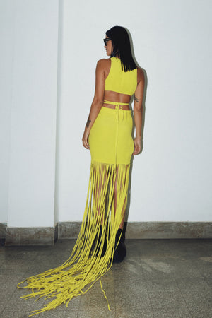 • Crepe tie up bustier. Fitted skirt with tassels at he hem.
