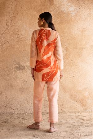 • A three piece co-ord set comprises of a collared shirt pattern with long cuff sleeves expressing abstract prints designed in-house, paired with pants and the cotton inner.