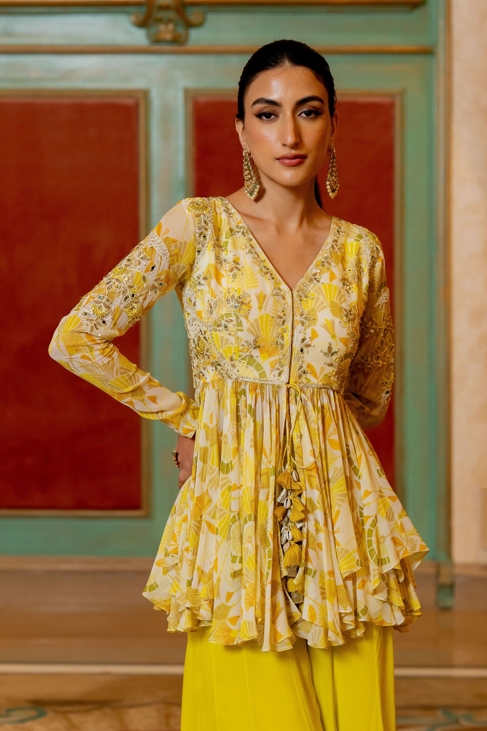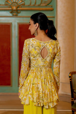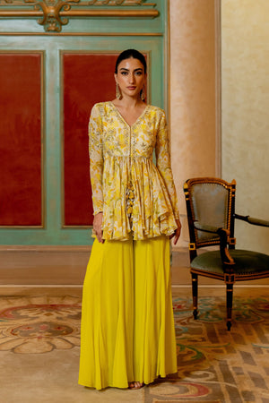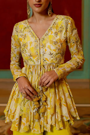 • Featuring the lime yellow geometric floral printed peplum set with antique gold dori, embellished hand work and beautifully adorned using tassels, it is paired with pallazoo pants