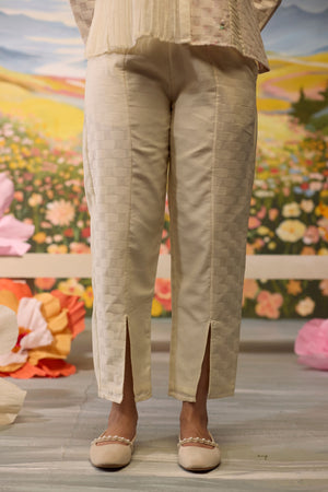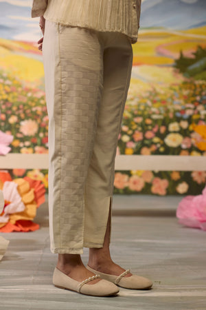 • Lumina checkered pants, crafted from fine chanderi, featuring a subtle checkered pattern that adds depth and texture. With their sleek straight fit, these pants offer effortless styling, perfect for a chic, easygoing look.