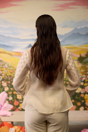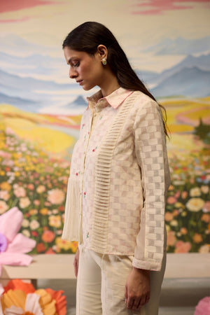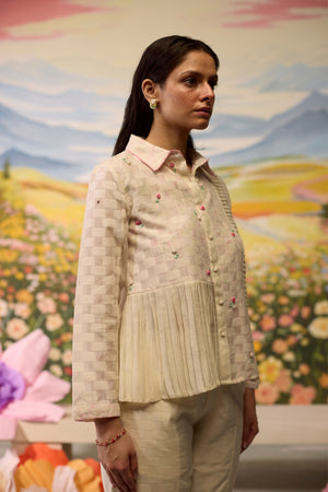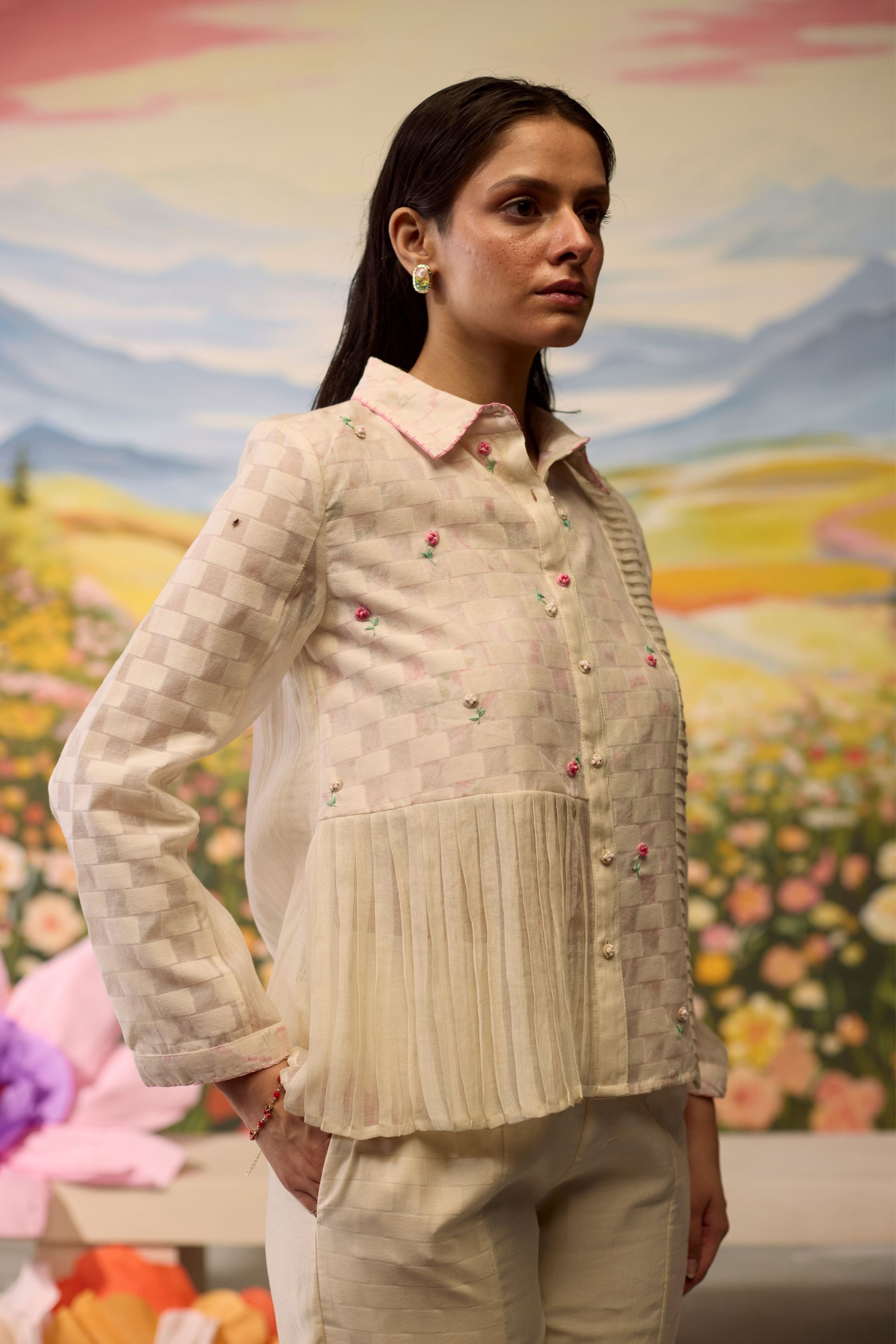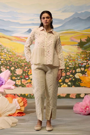 • Lumina checkered shirt, crafted in fine chanderi with textured checks, is adorned with delicate floral embroidery scattered across the fabric. A pleated detail on the side adds a subtle touch of elegance. Pair it with lumina checkered pants, crafted in chanderi, featuring checkered detailing for a refined yet effortless look.