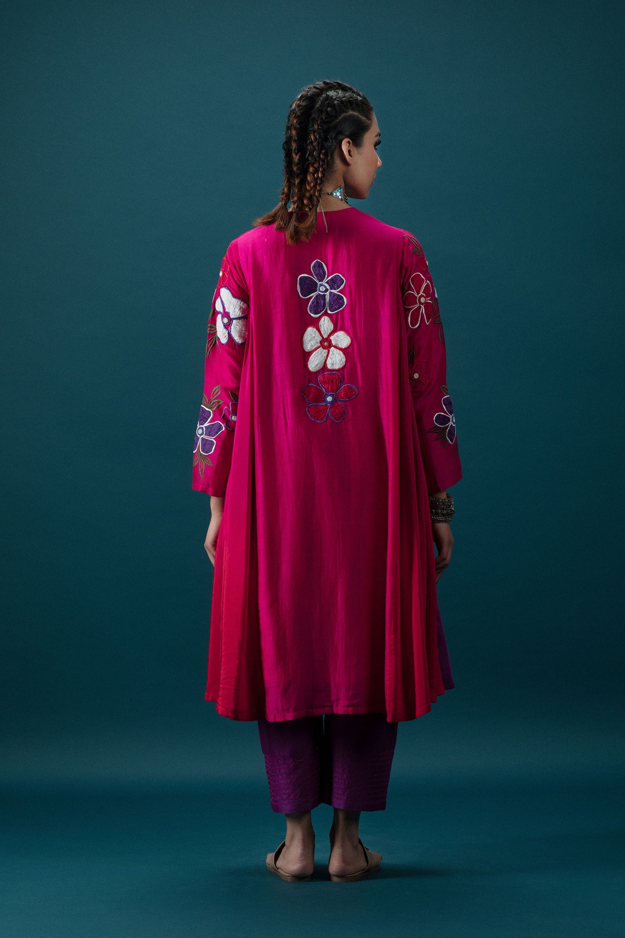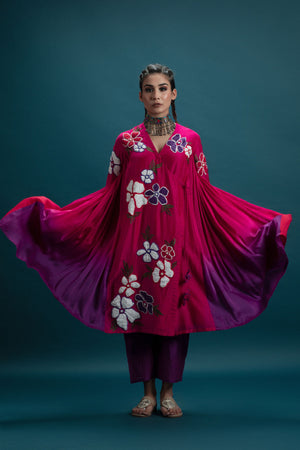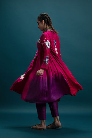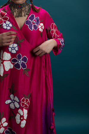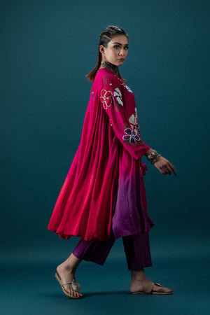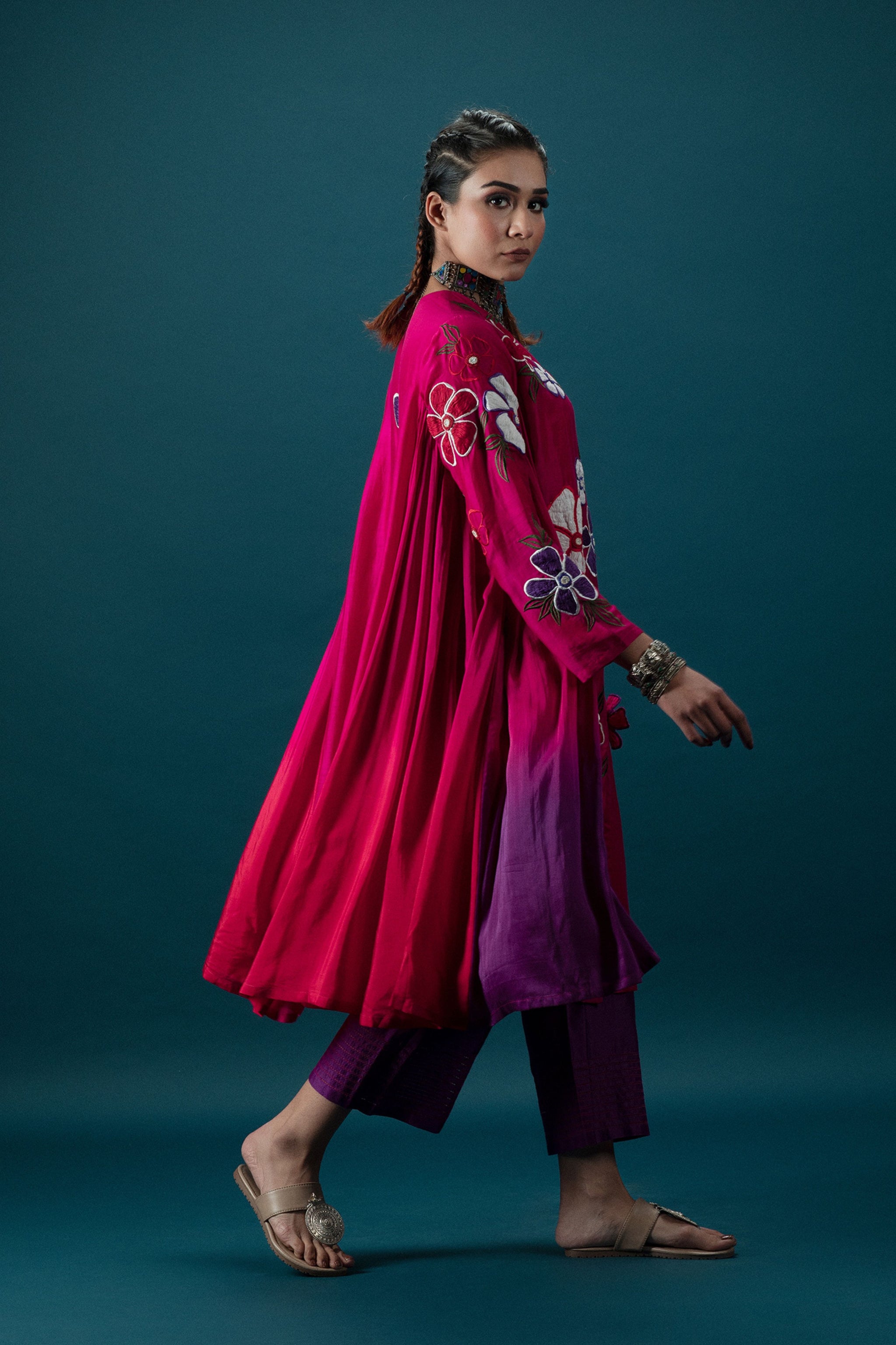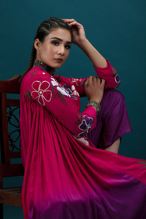 • Featuring Magenta overlapped gathered tunic with side tie up embroidered with 3-d floral motifs decorated with beads. It is paired with purple chanderi pants with horizontal fagoting details.