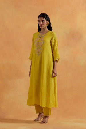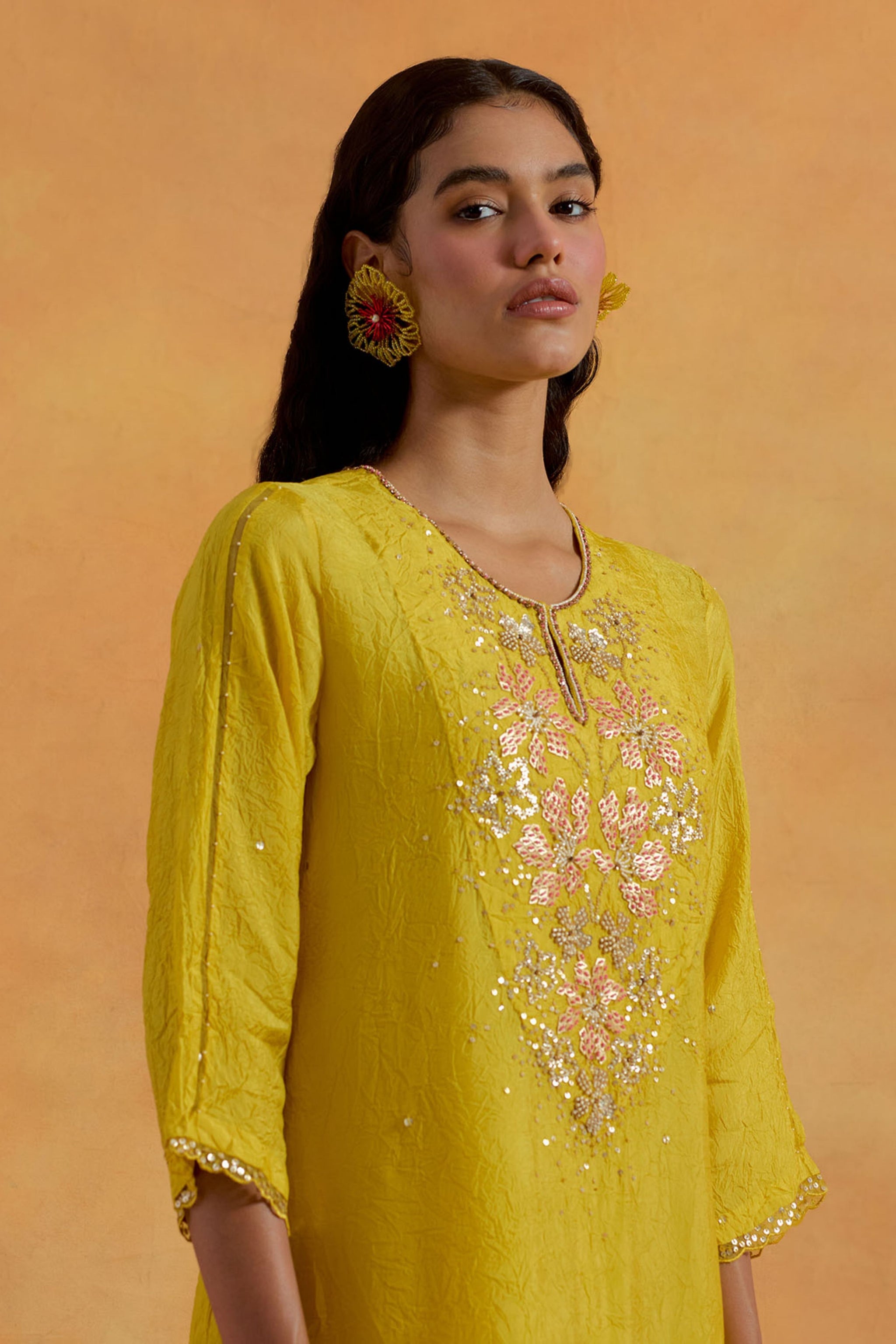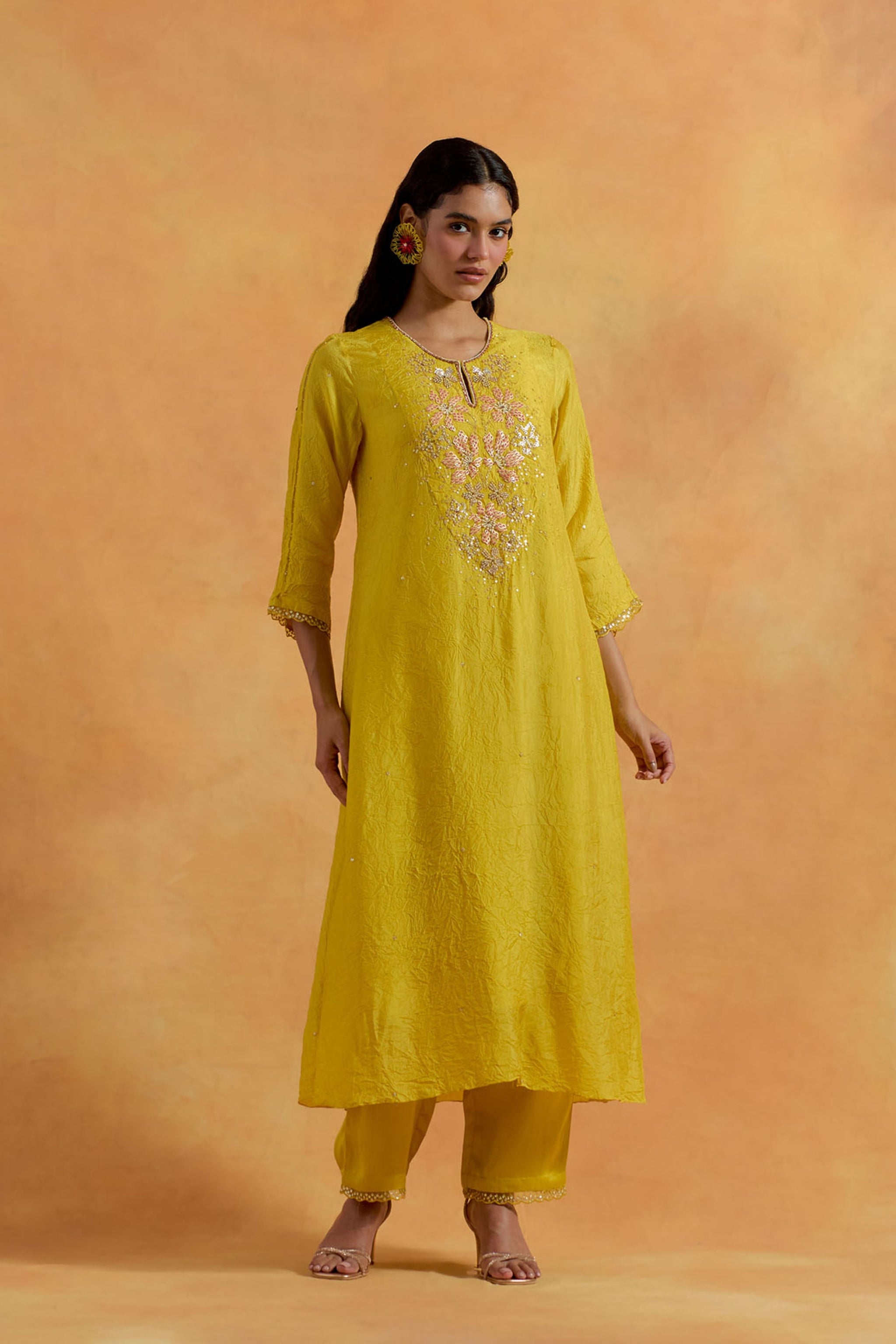 • Featuring a mango kurta set in crushed silk base with delicate hand embroidered yoke.