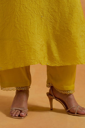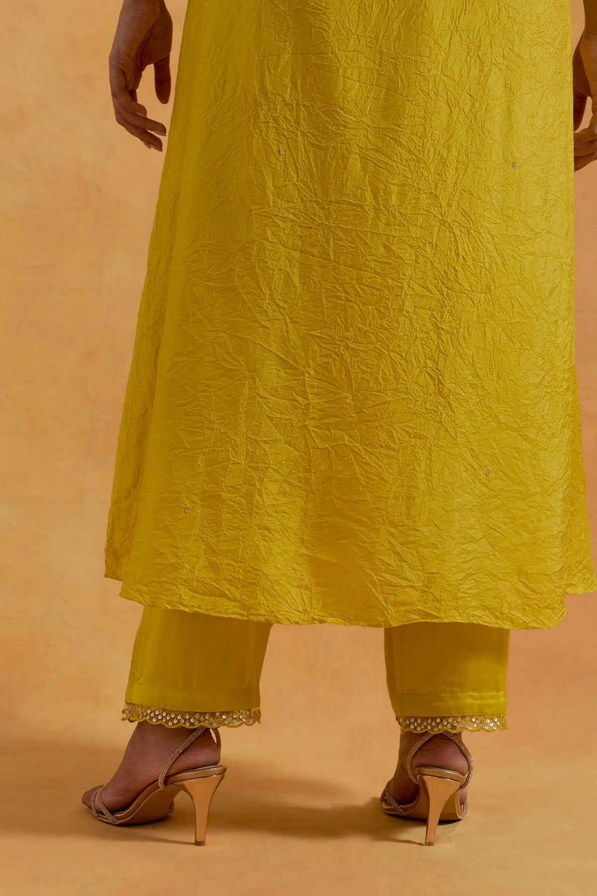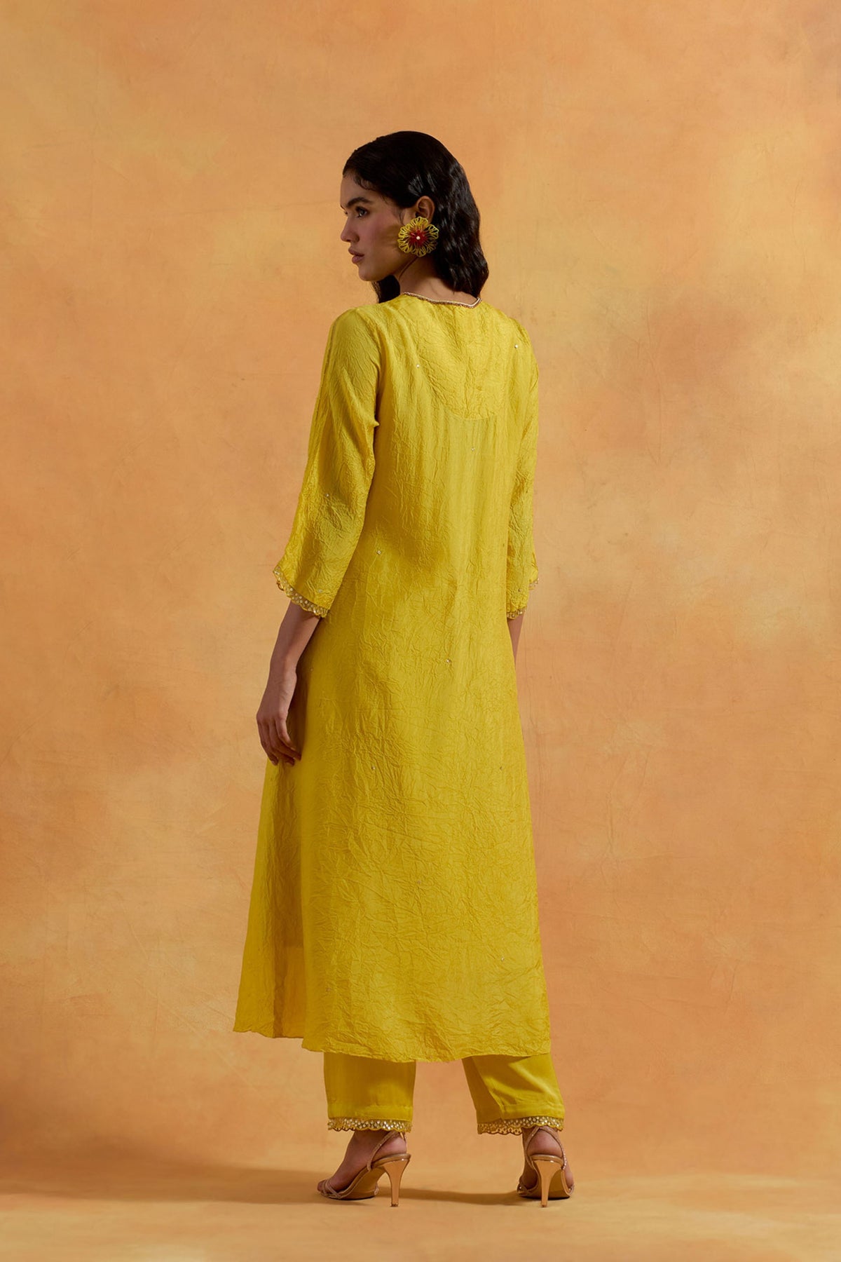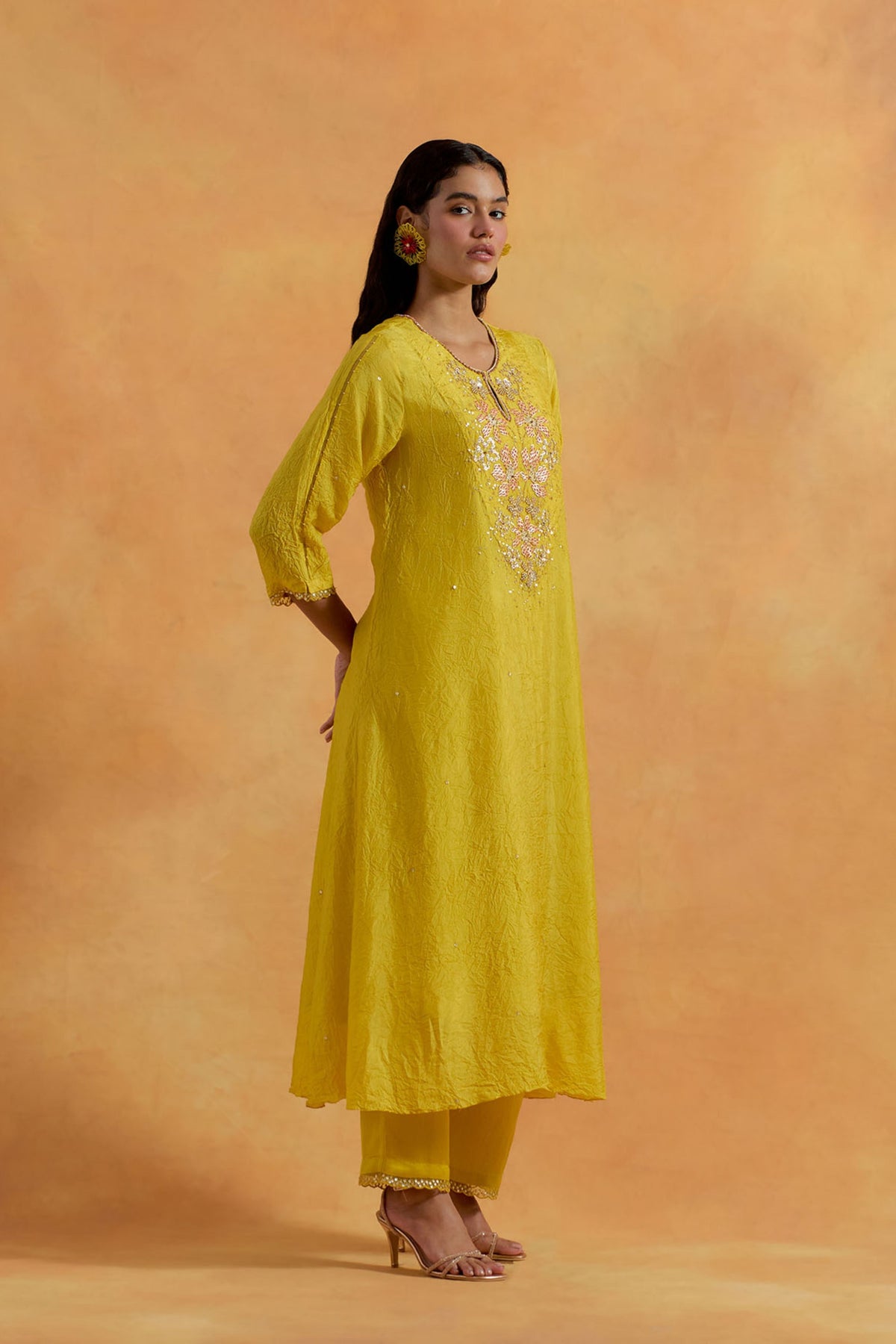 • Featuring a mango kurta set in crushed silk base with delicate hand embroidered yoke.