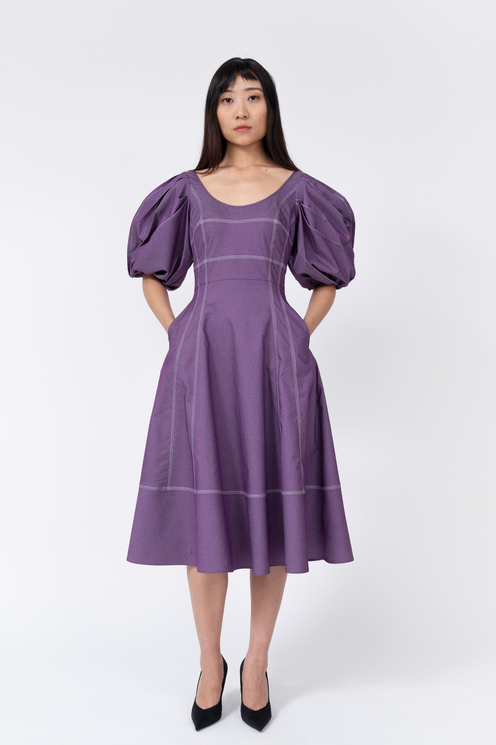 • This dress in cut in 100% cotton chambray featuring a scoop deep neck line and exxagerated sleeve detail featuring pin tuck pleates decorated with contrast stiches. Model wear size s model height is 5'10 , garment length is 52"