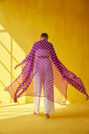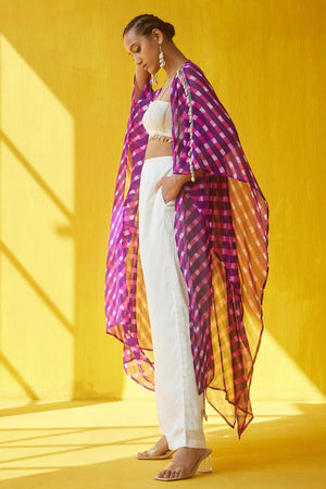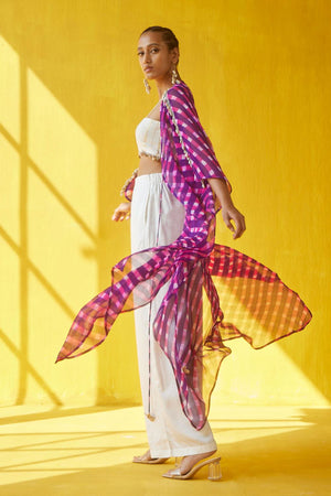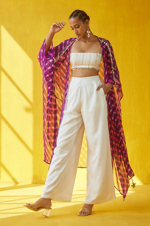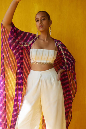 • If chic yet effortless dressing is your vibe, then our three piece set with handcrafted mothda kaftan is the perfect pick for you. Made in soft modal satin and pure silk georgette. Lurex bustier features an elasticated back, bust cups and side zipper for that added comfort. Bustier is highlighted with an interesting boho coin lace. Pants feature an elasticated back waist, side zipper and inseam pockets. Hand tied and dyed mothda kaftan is highlighted with cowrie shells and handmade tassels. It features a tie up detail, you can tie it in front for that sophisticated look or you can tie it at back for that fashion forward look. Styling tip- whether heading out for a day event or an intimate gathering, this breezy number is going to become your staple piece.