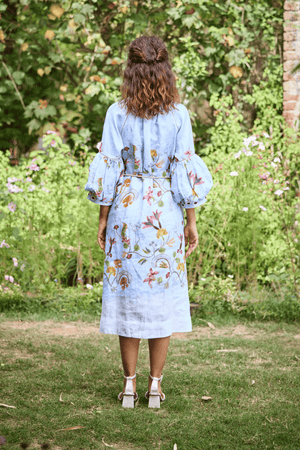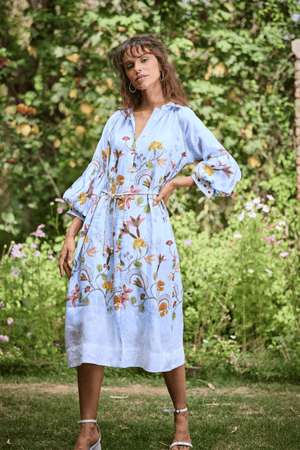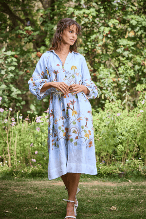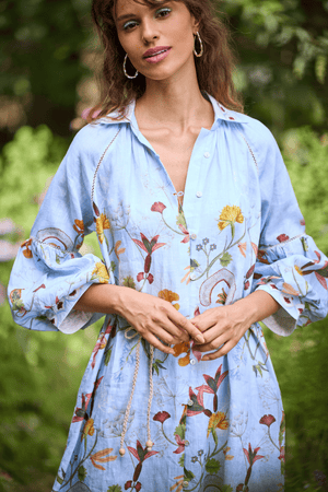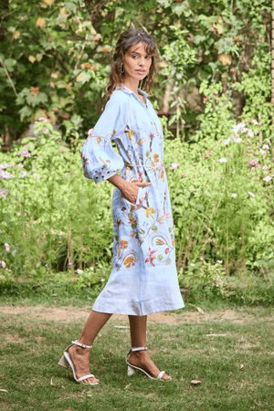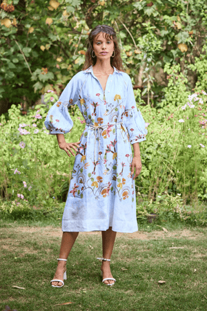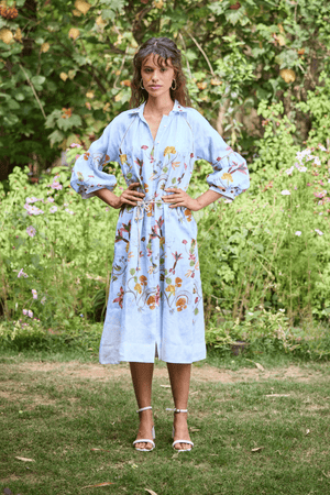 • A relaxed fit button down shirt dress that features baloon sleeves, side pockets and clinched waist through a belt. It has a perfect midi hem that will flatter any height. Style this dress with platform slides for your next party Standard dress length 44" Other attributes: Pure Fine Hemp Absorbs CO making it a cleaner, greener fabric Digitally printed Hand embroidery highlights on collar and sleeve Unlined Lace insert on sleevs and armhole Attached corded belt to fasten waist Color Sky blue