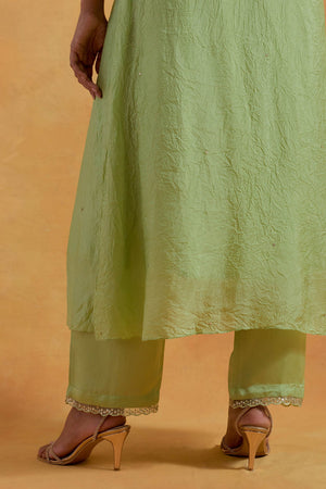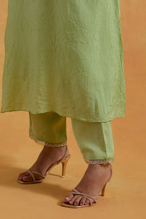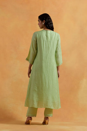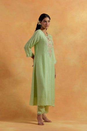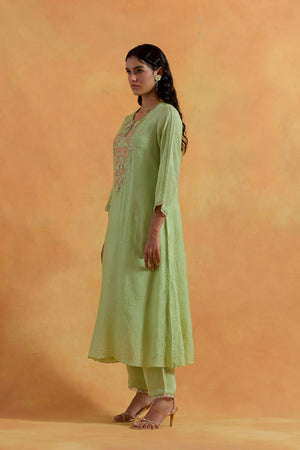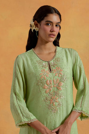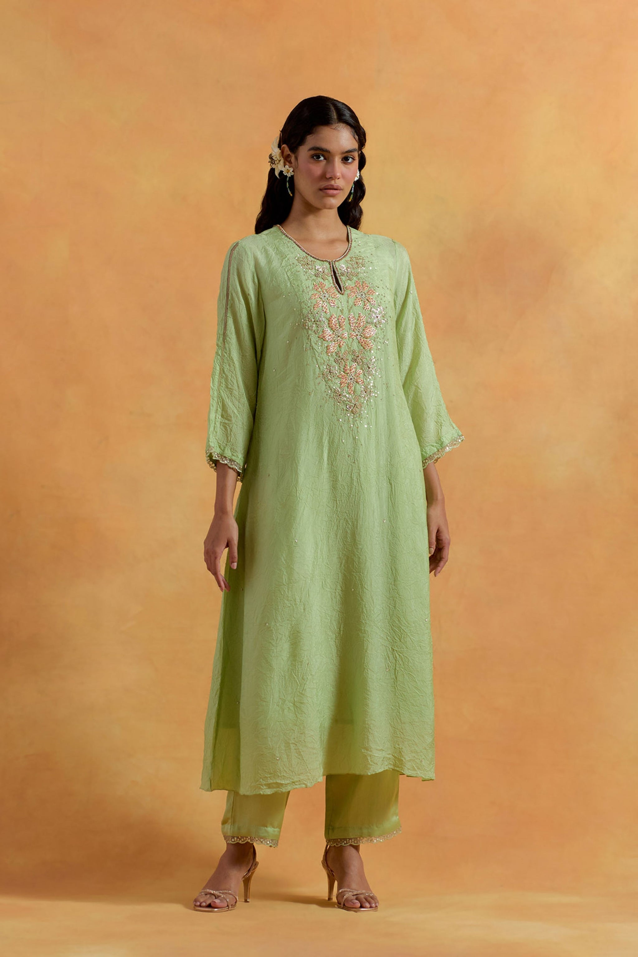 • Featuring a mist kurta set in crushed silk base with delicate hand embroidered yoke.