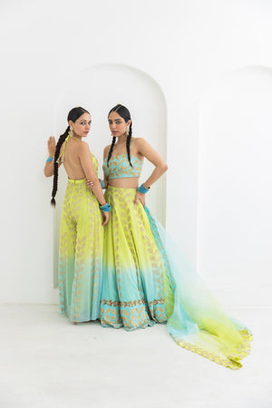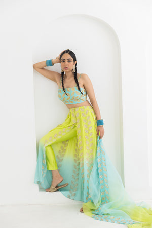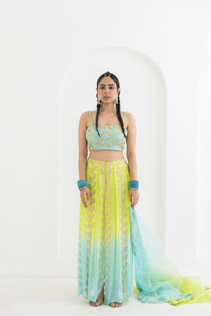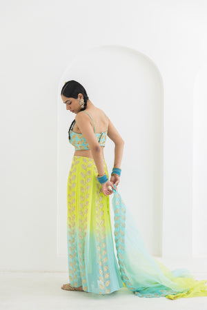 • This trouser drape set is made in a beautiful lime to aqua ombre georgette having leaf motifs which are hand embroiderd all over . Its combined with a hand embroidered bustier and organza dupatta.Model height 5'9 is wearing size M