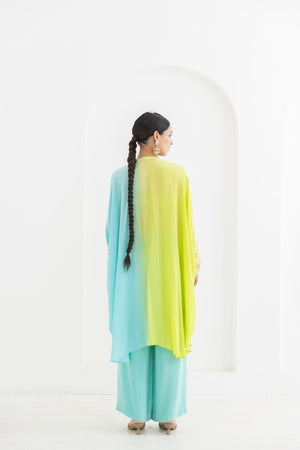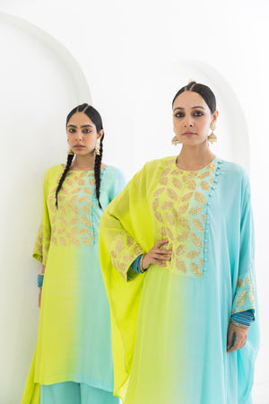 • This kaftaan is dyed in a beautiful lime to aqua ombre , having leaf motifs incrusted with gold sequin embroideryon the placket and cuffs.Model height 5'9 is wearing size M