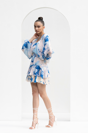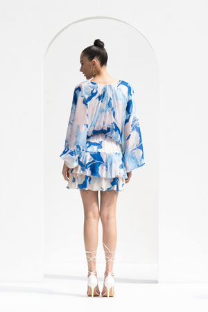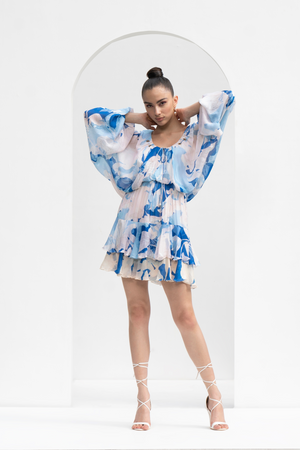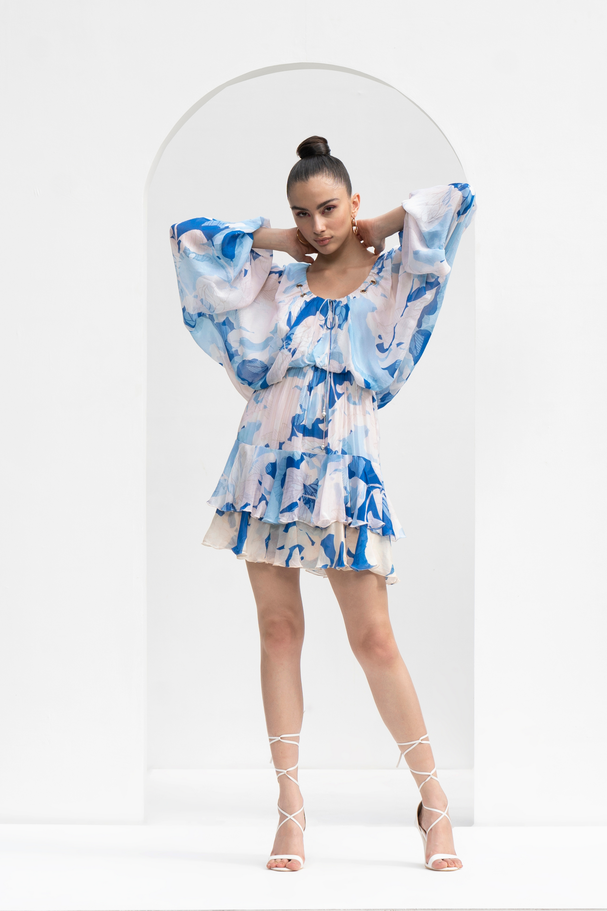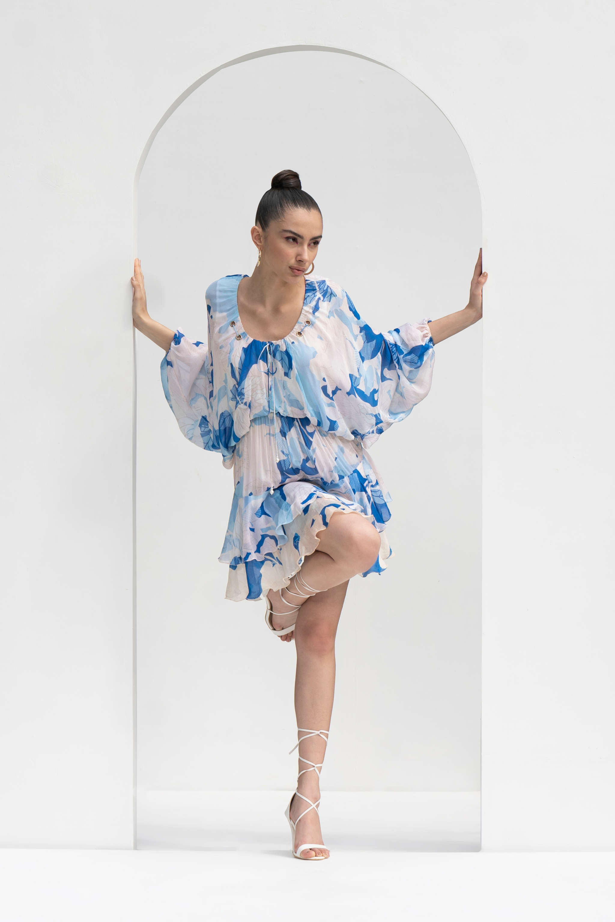 • Mystic blue printed dress cut from airy chiffon with batwing sleeves and gold eyelet detailing along the neckline