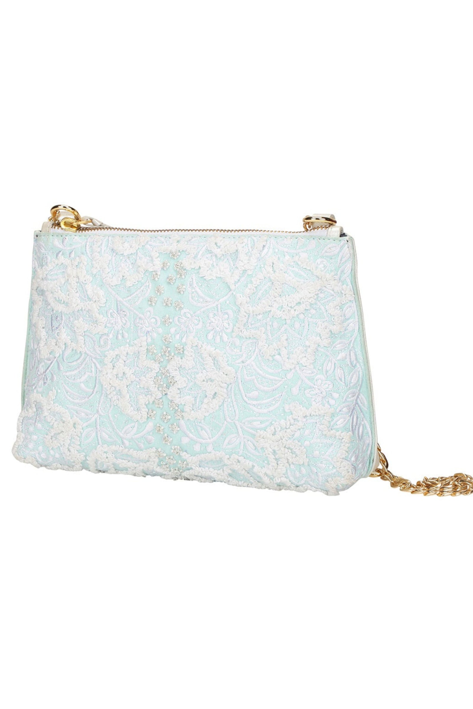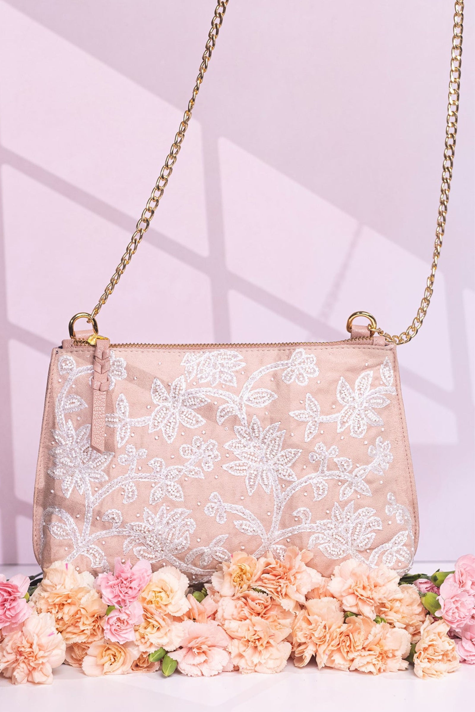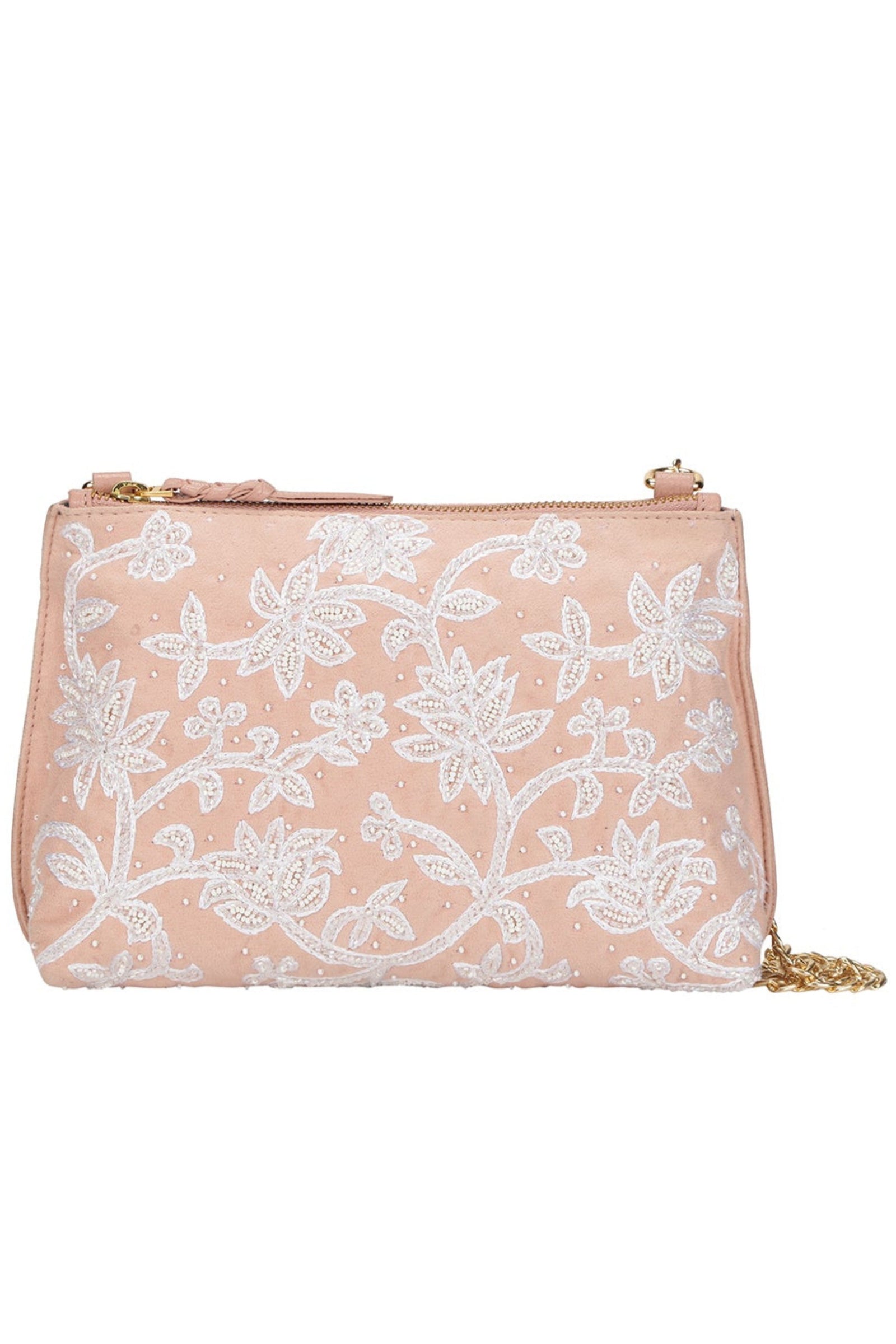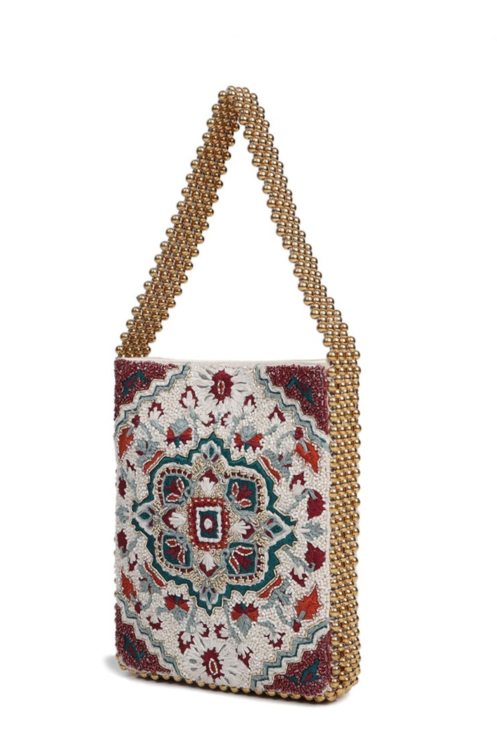 • Fall in love with this Ivory beauty Delicately handcrafted woven pearl ring handle Beautiful floral interiors Hand embroidered in hues of gold & ivory to create this statement piece Zip Closure