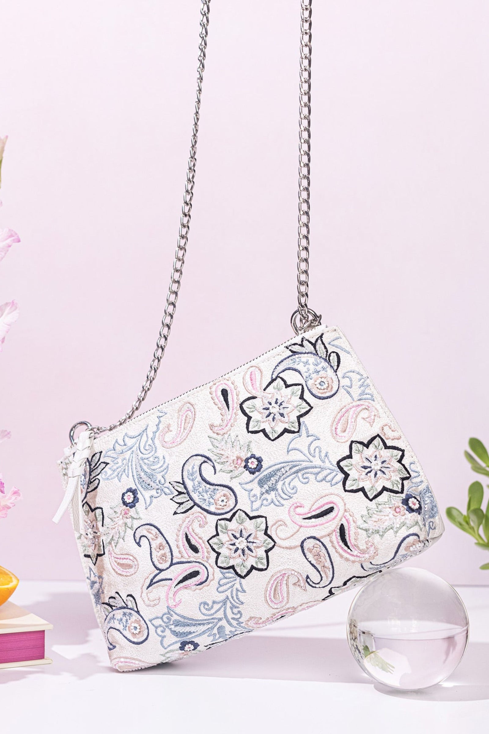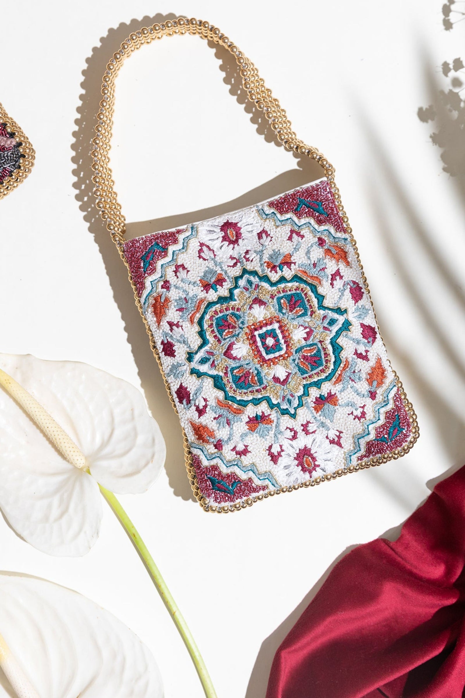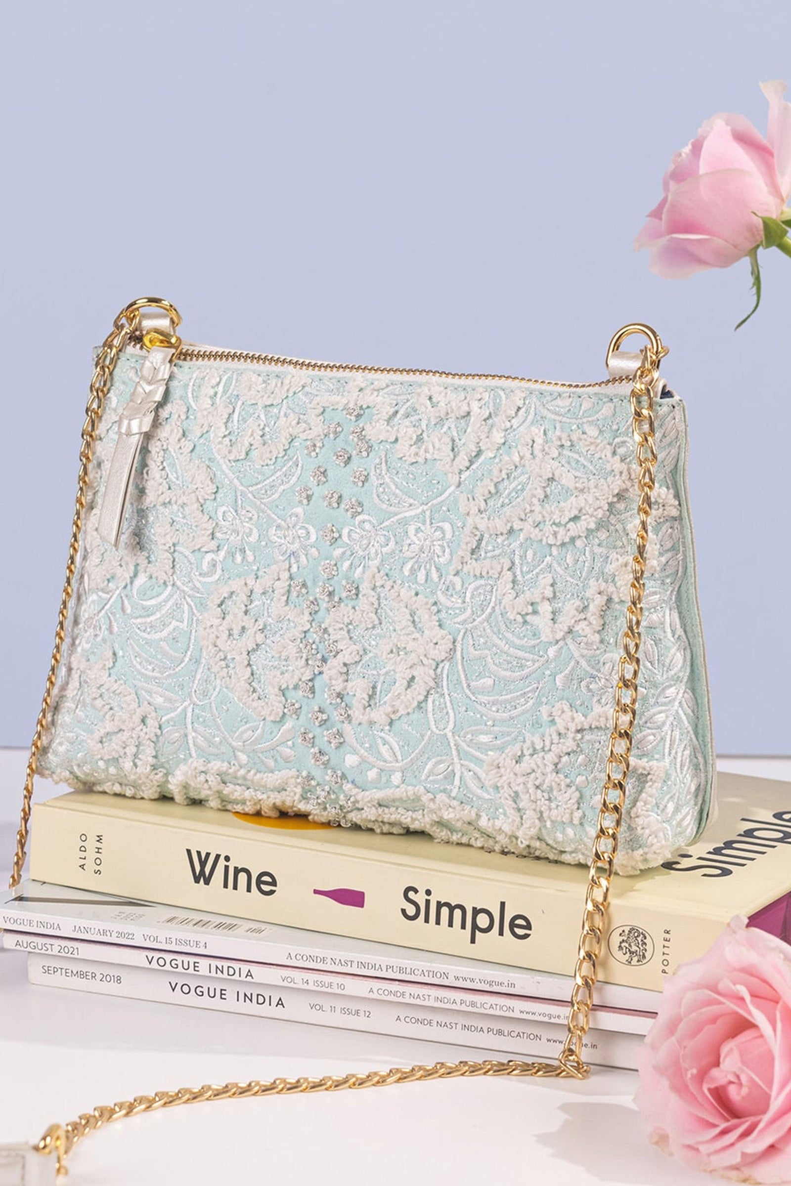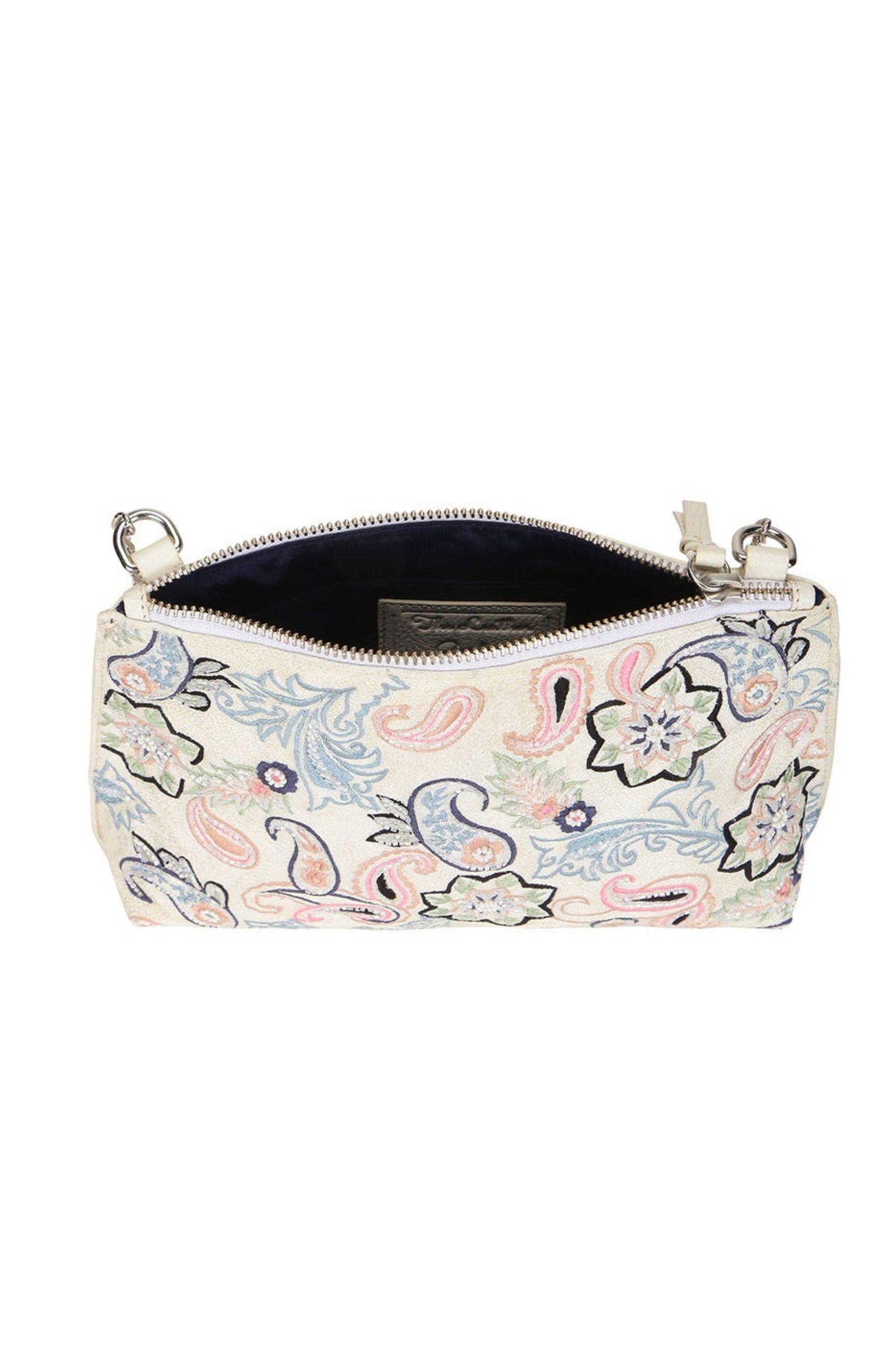 • Fall in love with this Ivory beauty Delicately handcrafted woven pearl ring handle Beautiful floral interiors Hand embroidered in hues of gold & ivory to create this statement piece Zip Closure