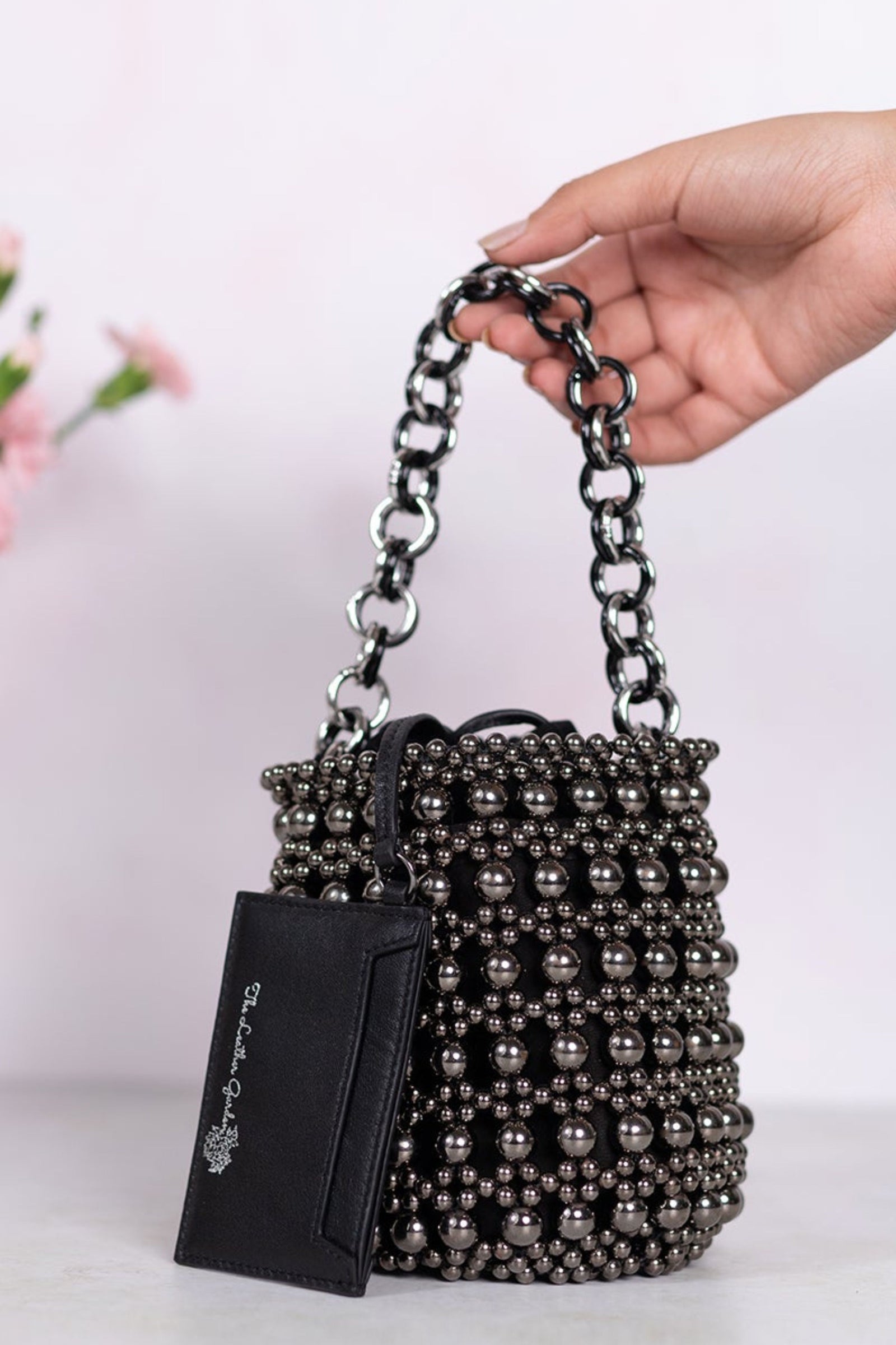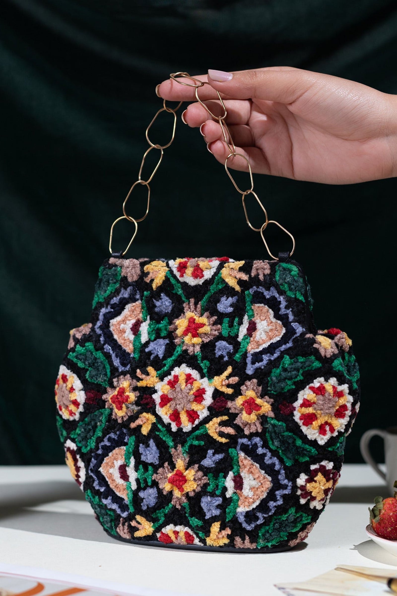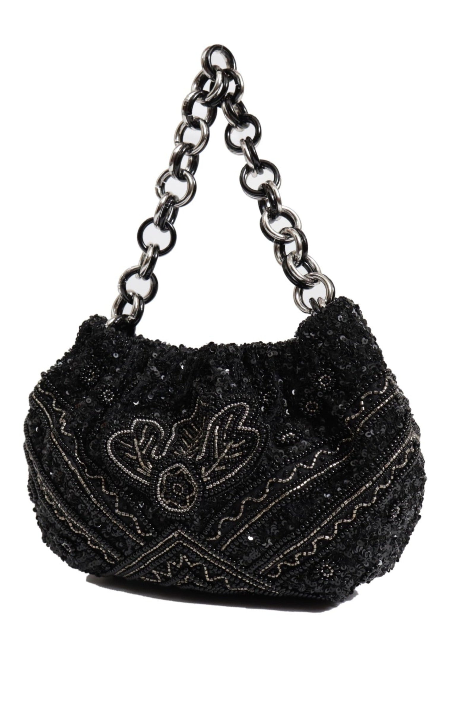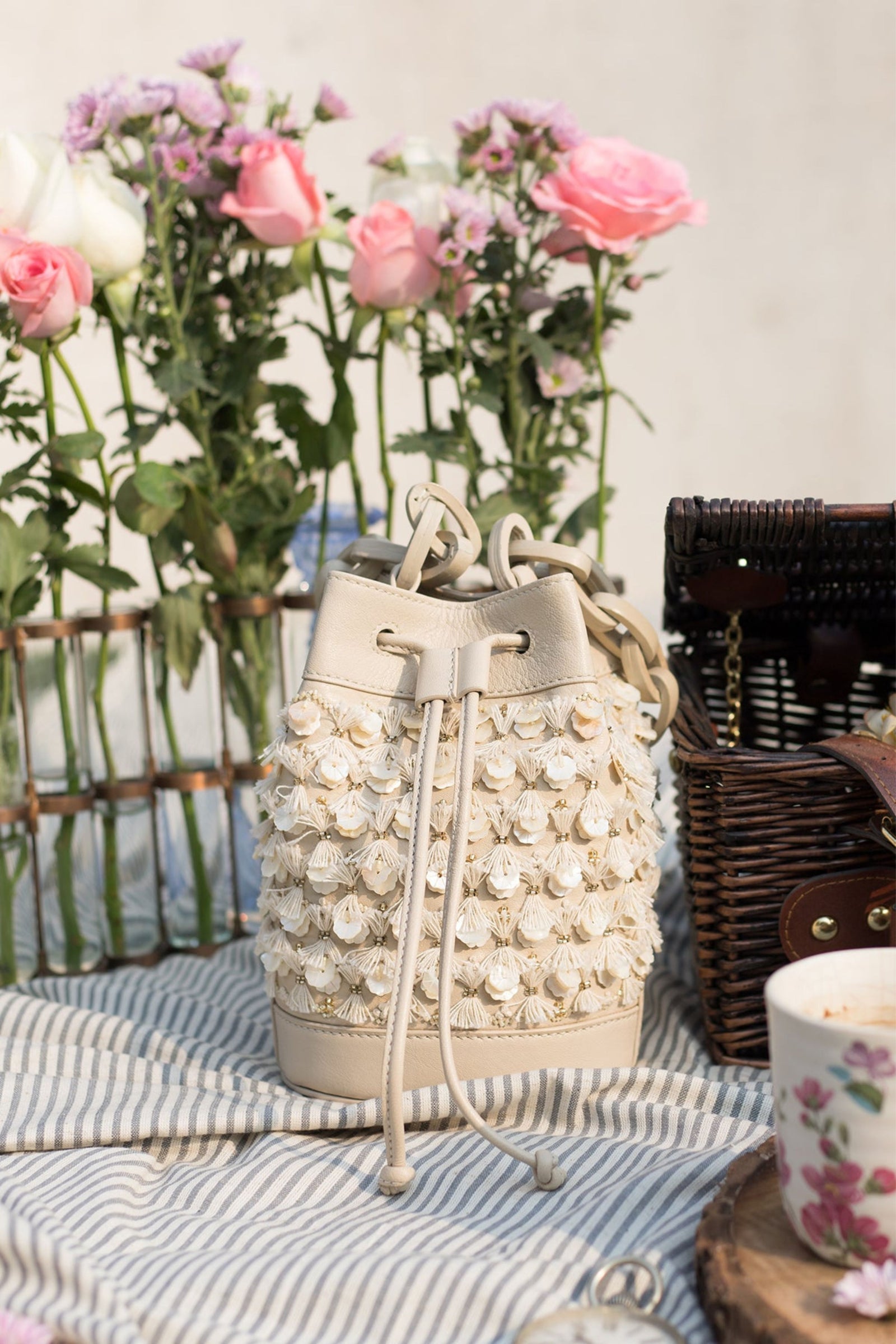 • Fall in love with this Ivory beauty Delicately handcrafted woven pearl ring handle Beautiful floral interiors Hand embroidered in hues of gold & ivory to create this statement piece Zip Closure