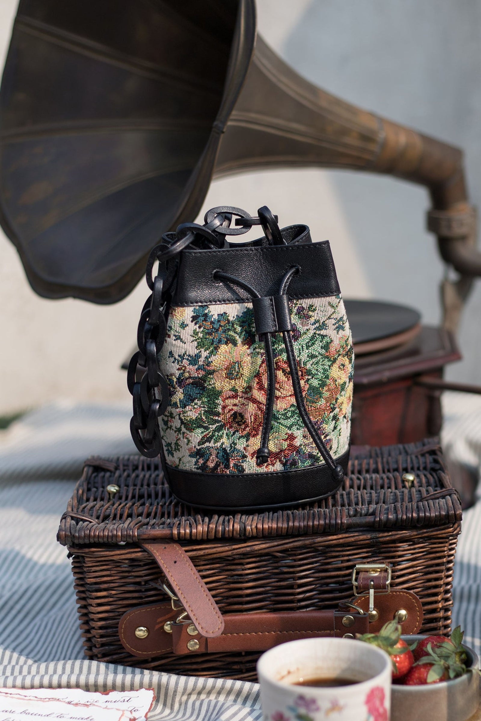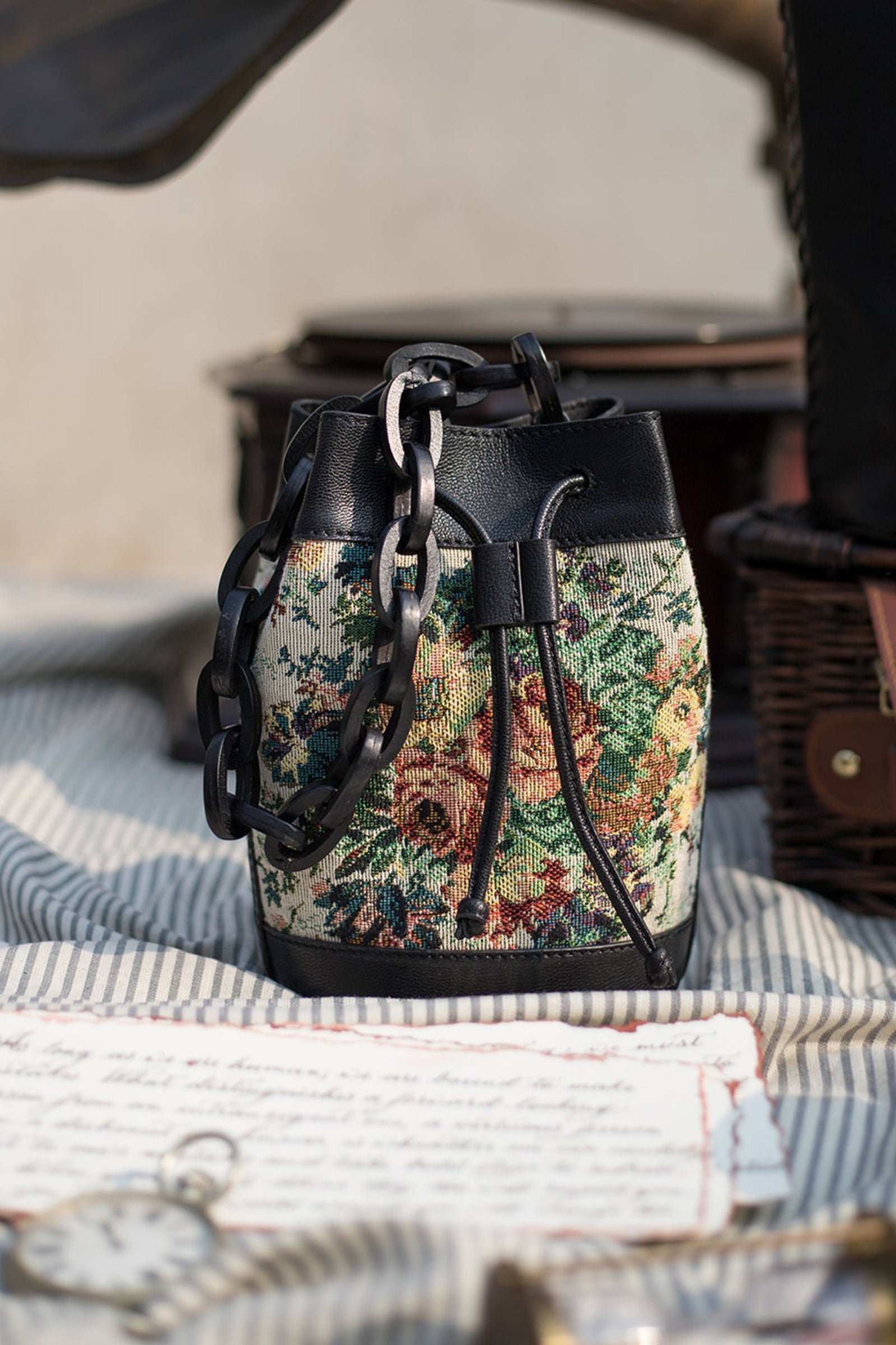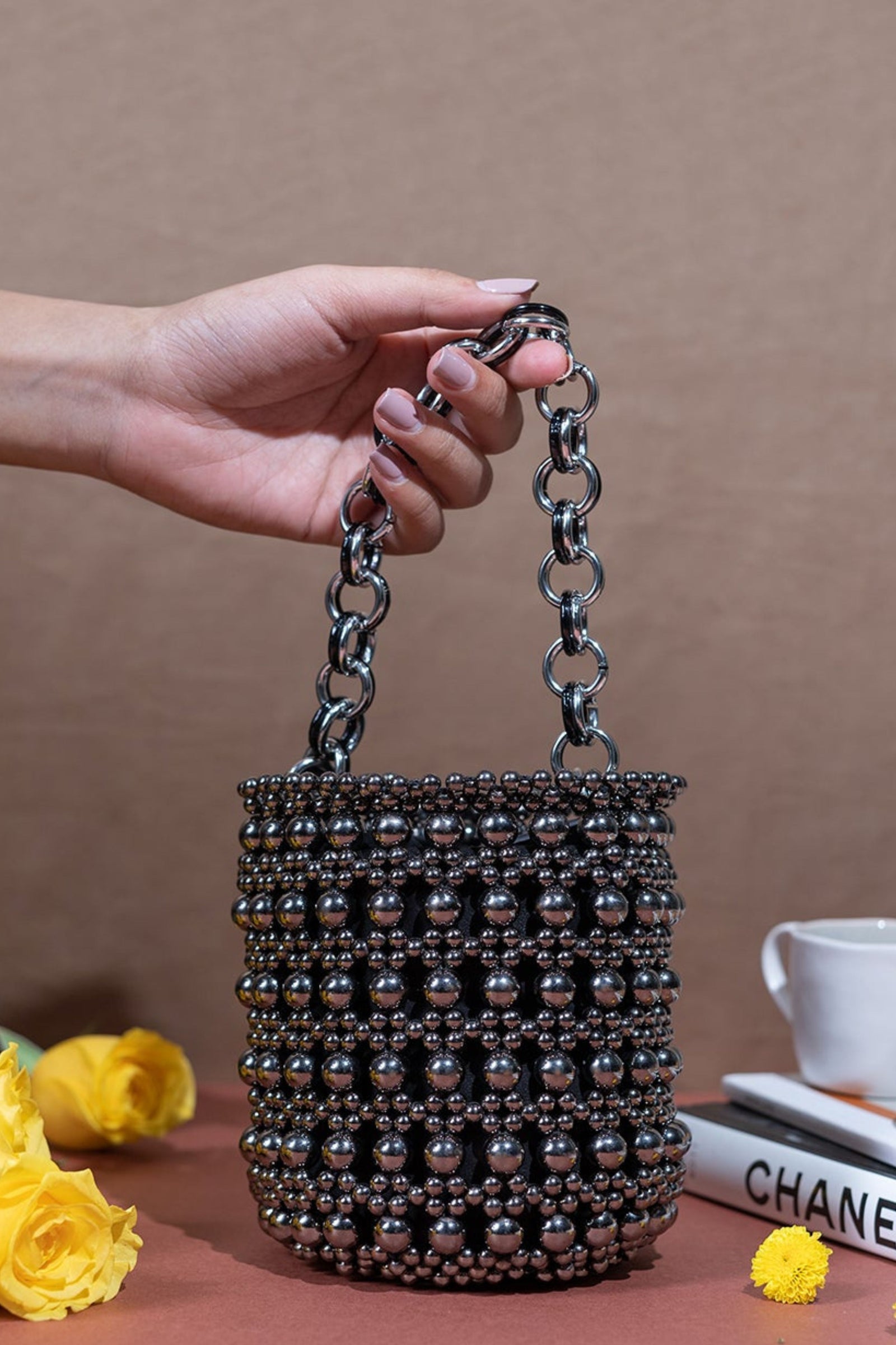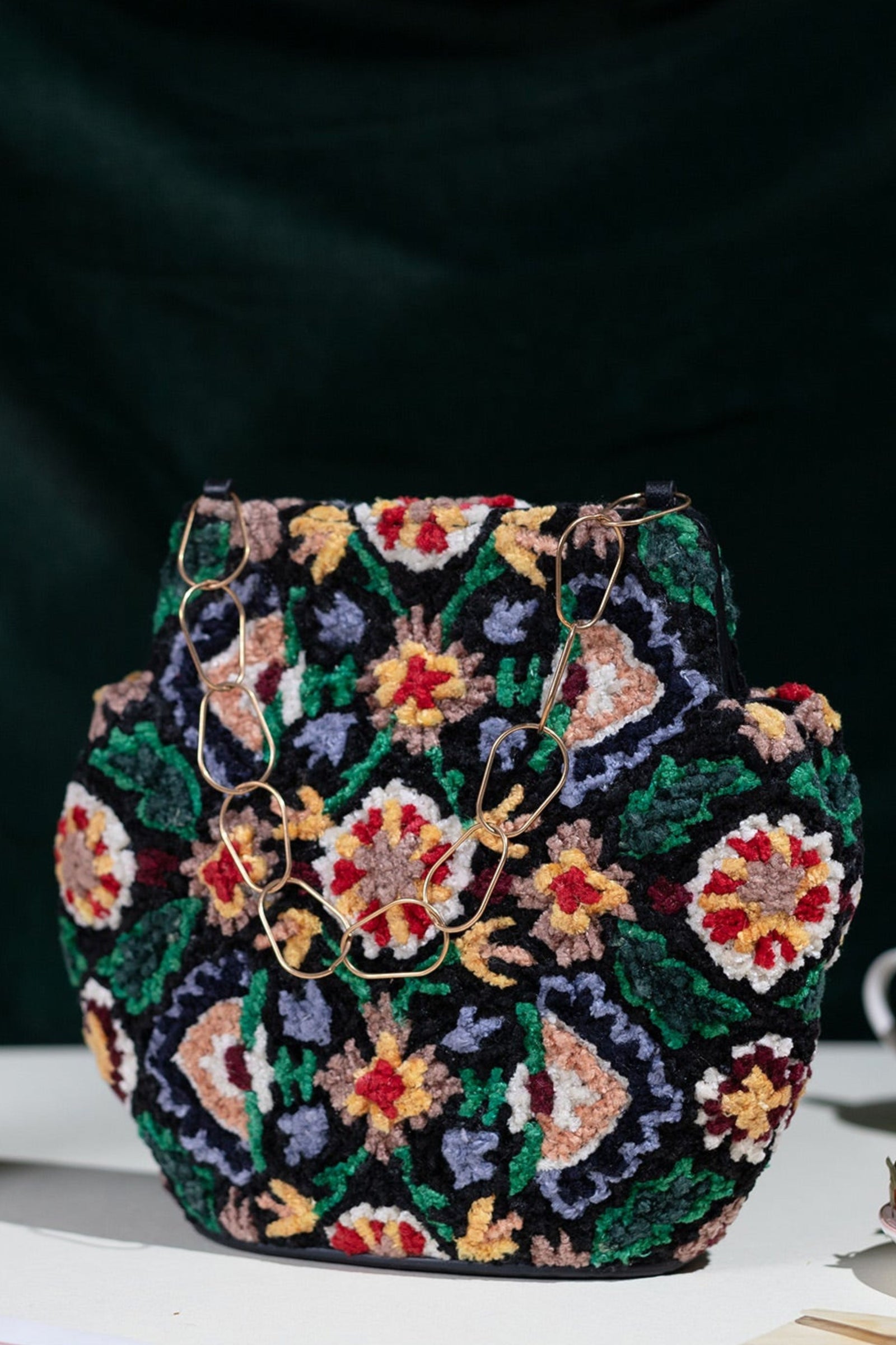 • Fall in love with this Ivory beauty Delicately handcrafted woven pearl ring handle Beautiful floral interiors Hand embroidered in hues of gold & ivory to create this statement piece Zip Closure