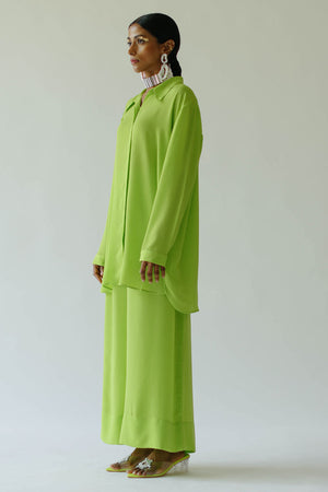 • Naomi green co-ord set. Slit shirt with wide collar neck, full sleeves with button cuffed and front concealed button closure. Back slit with button closure and gathers detailing, asymmetric hemline, paired with matching flared pants. Shirt length - 32".