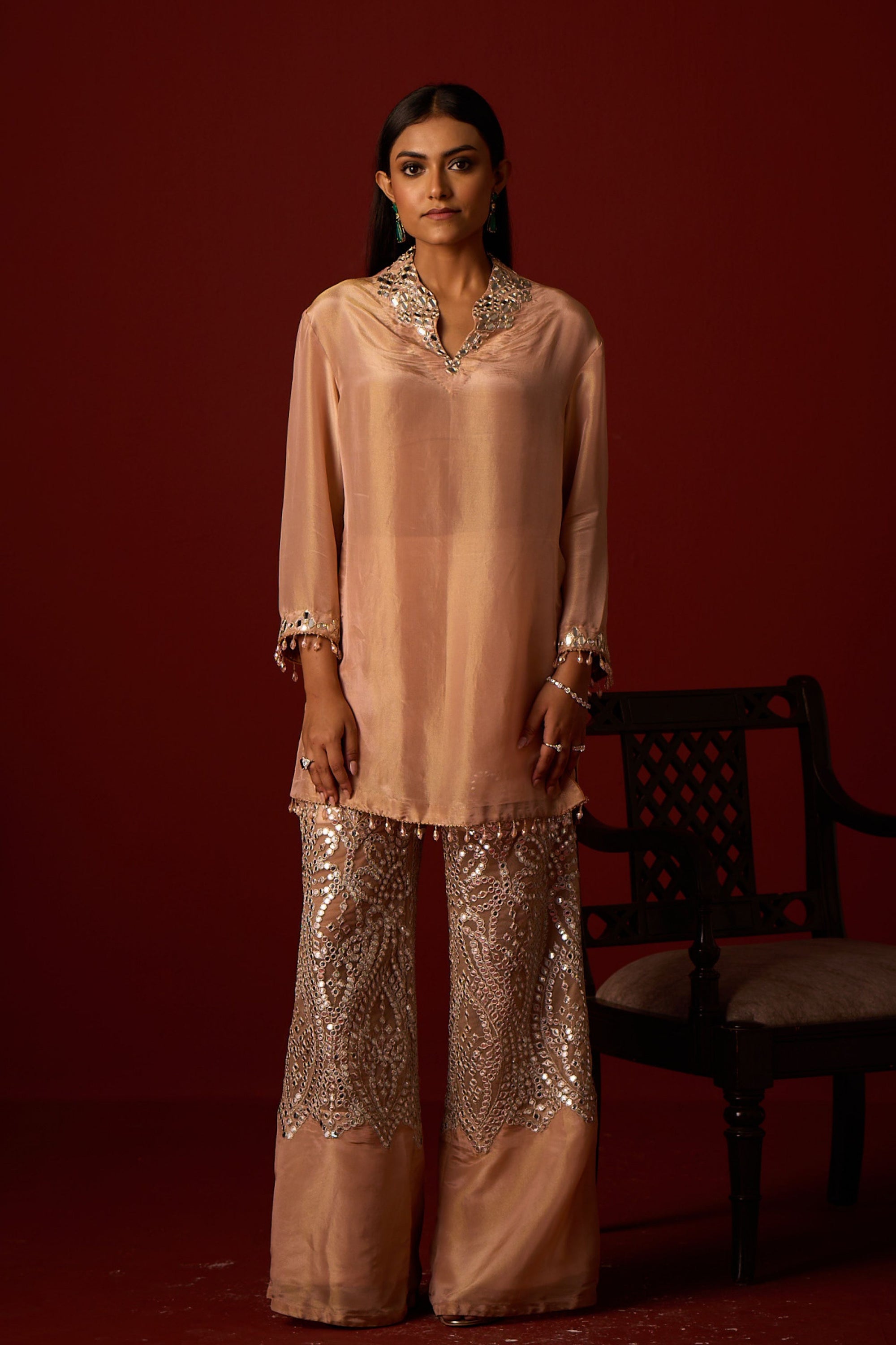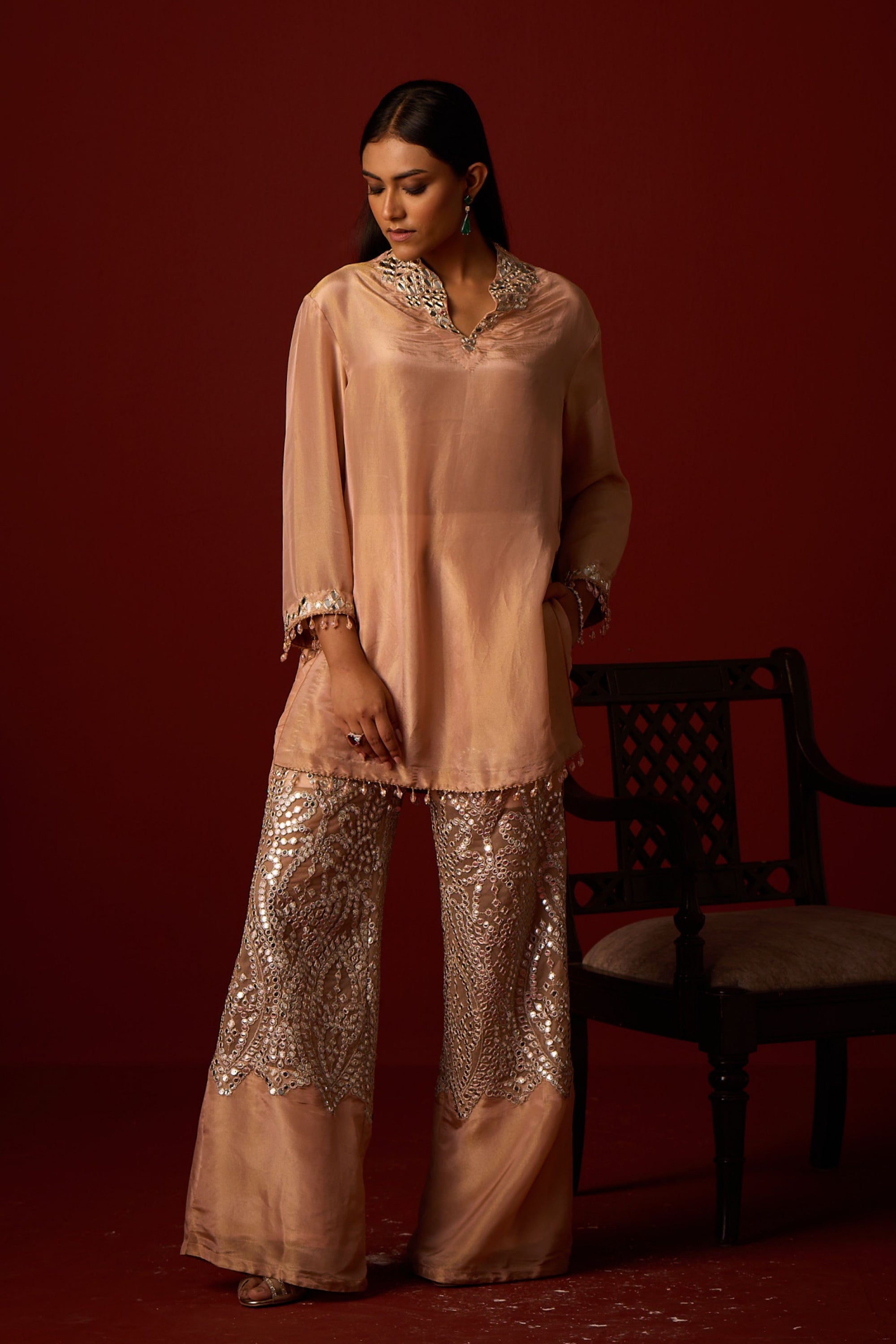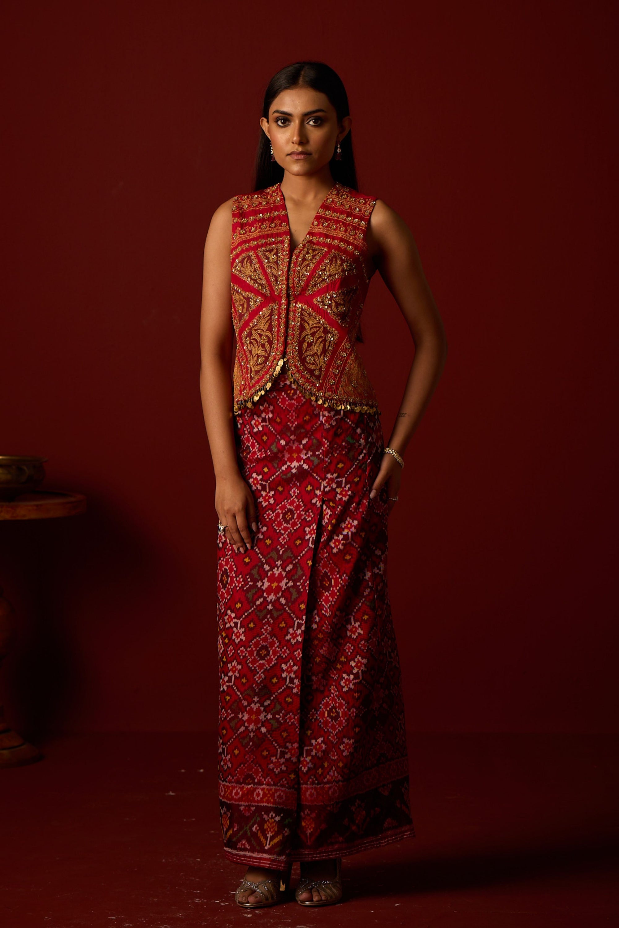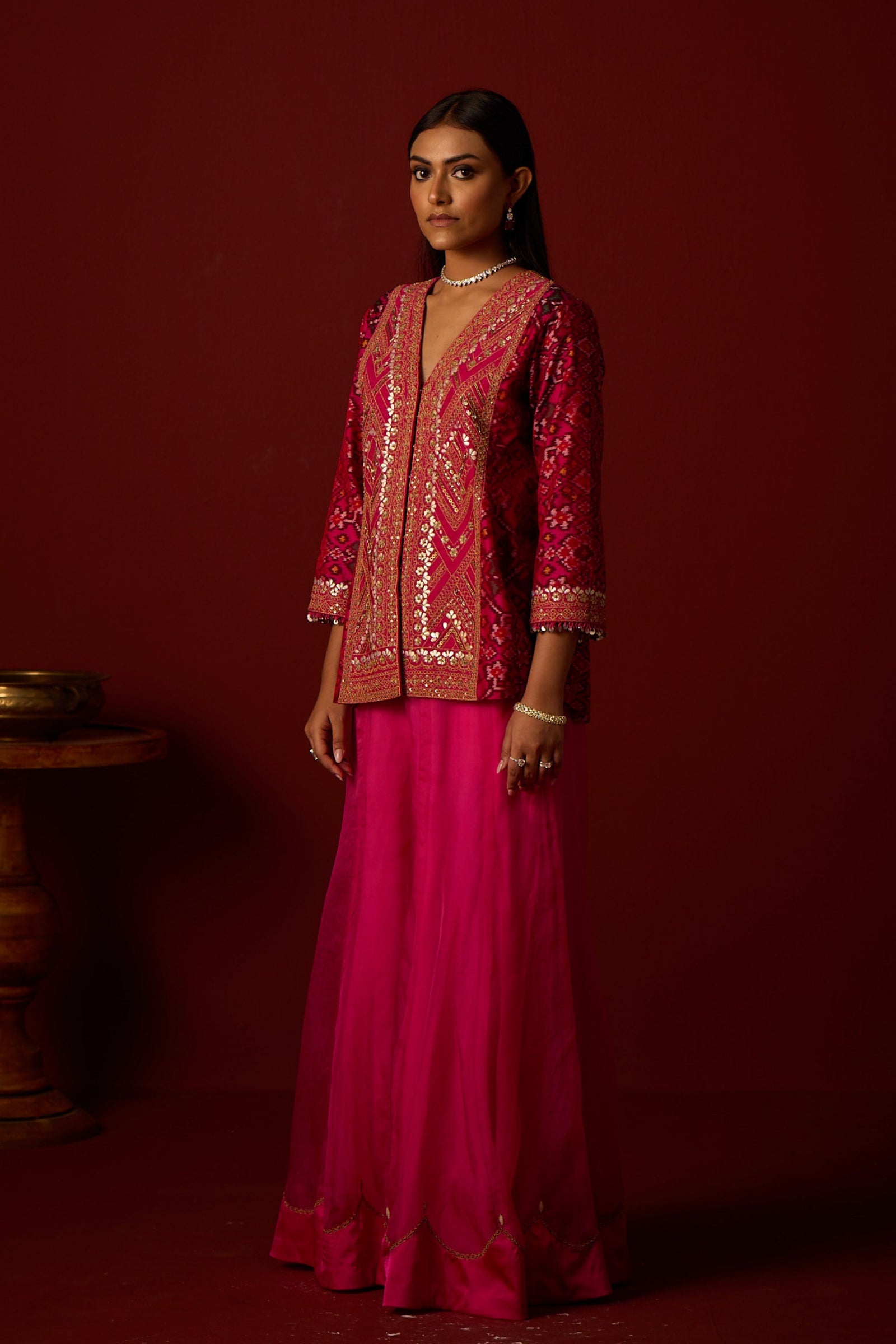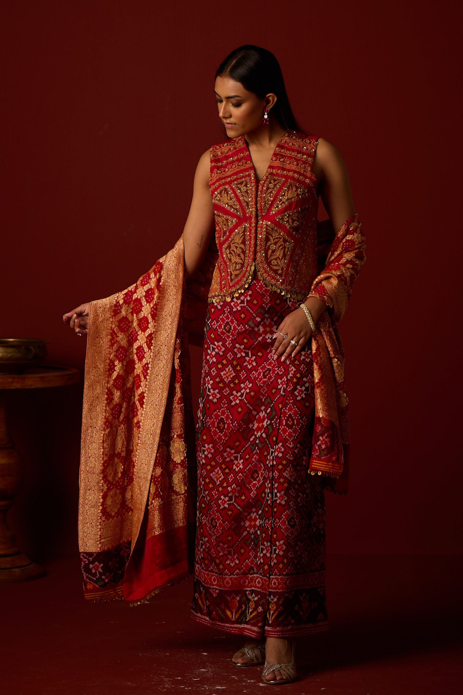 • This tulle duppata with patola weave silk ensemble is specially designed by our team. It is embellished with mirrorwork hand embroidery and crafted with great care and precision.