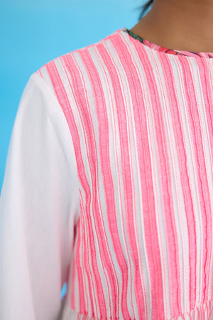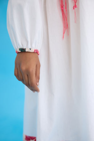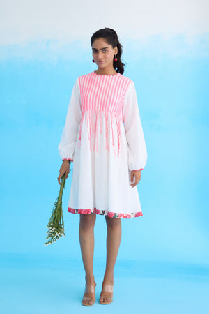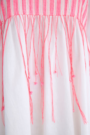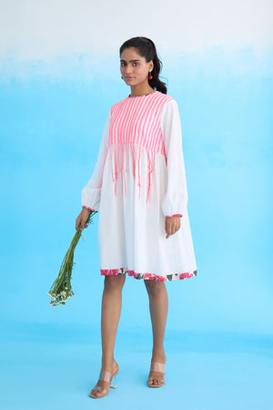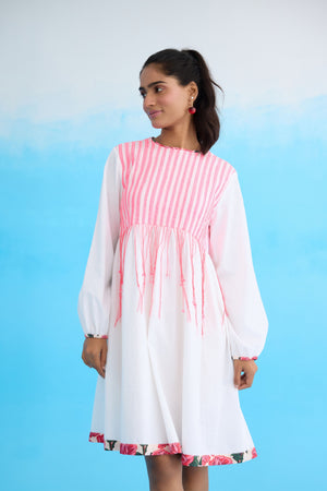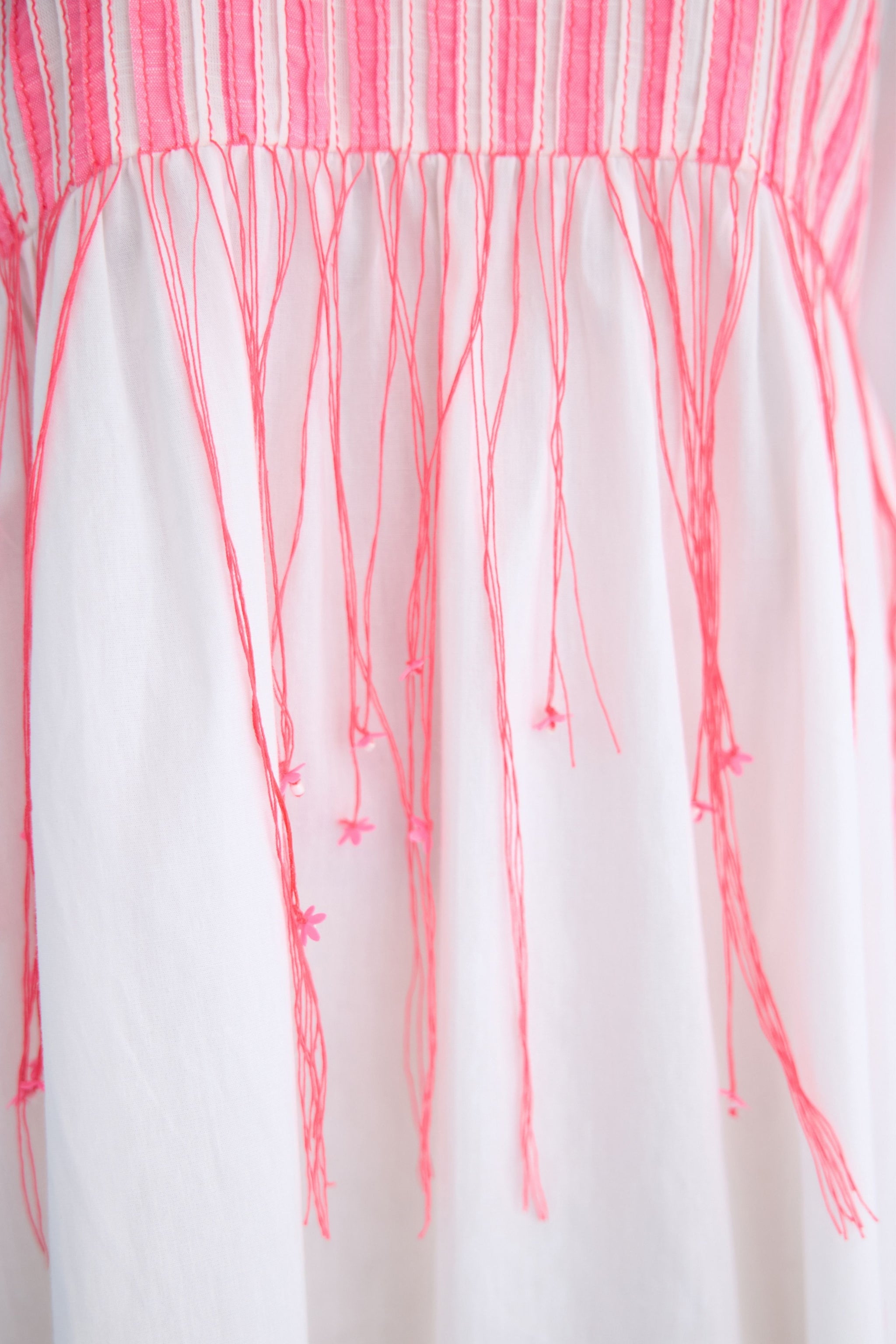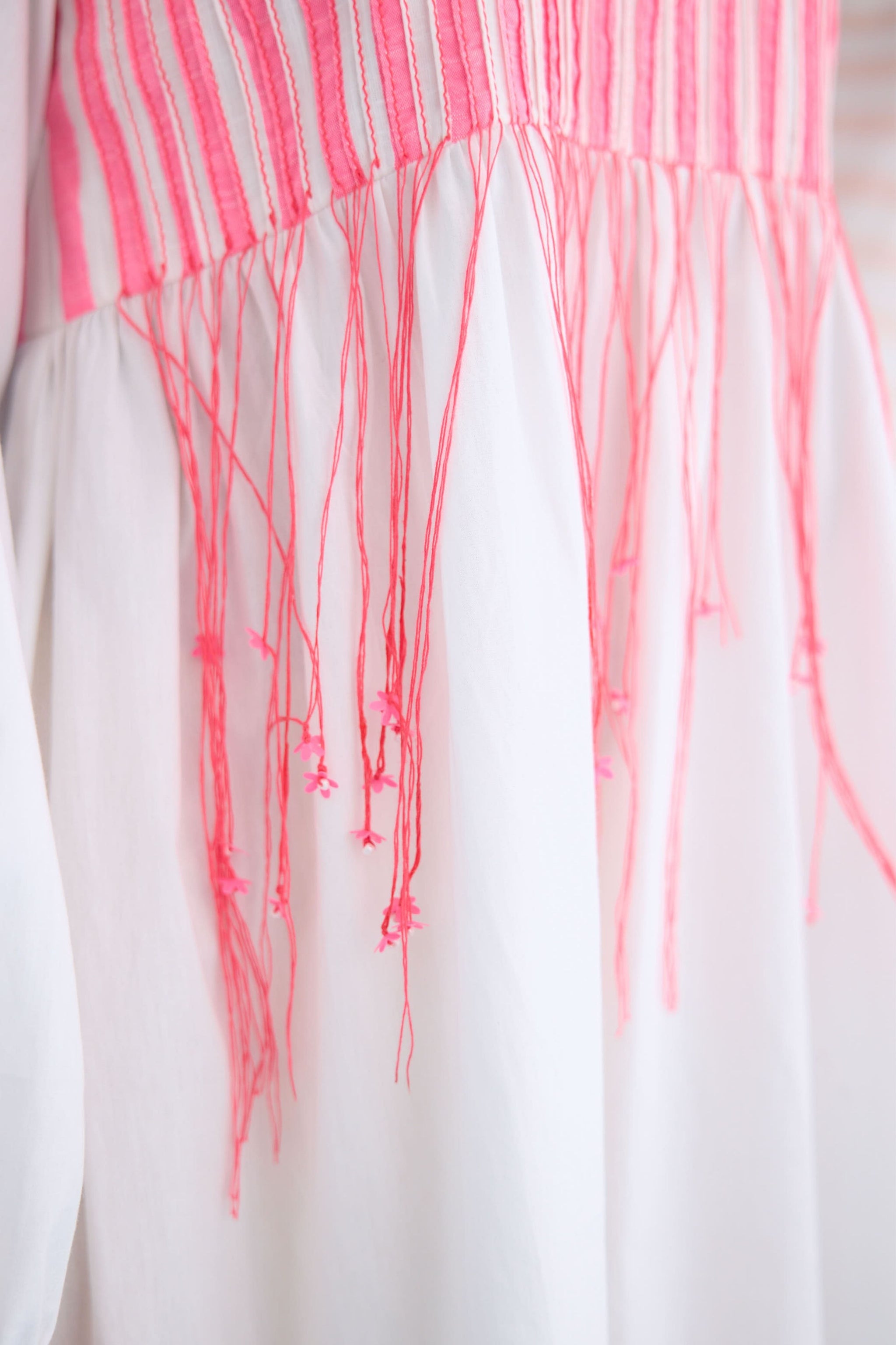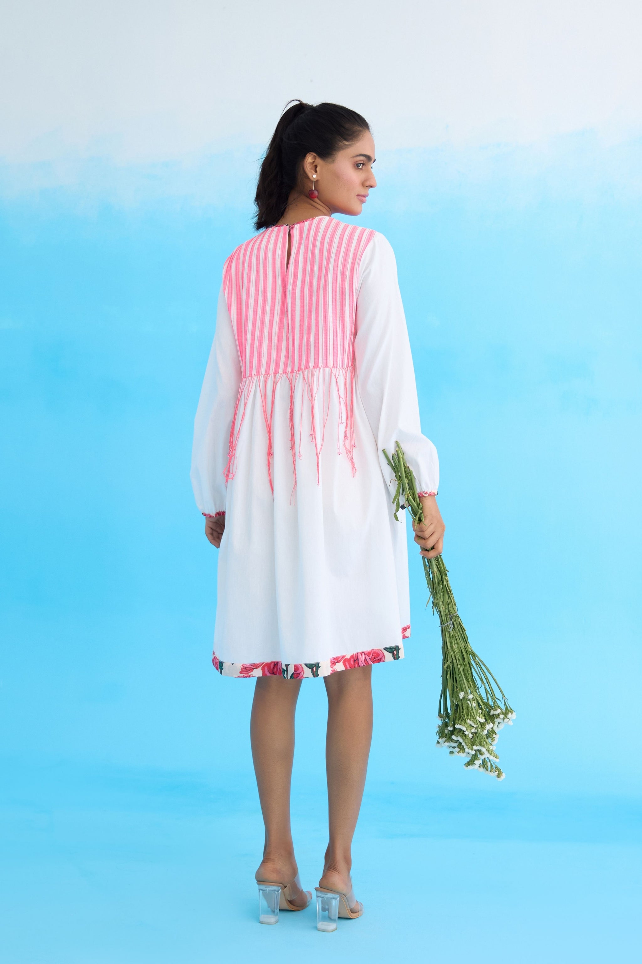 • White candy stripes pintuck shift dress with vintage rose print details at the bottom and thread tassels details in 100% cotton poplin.