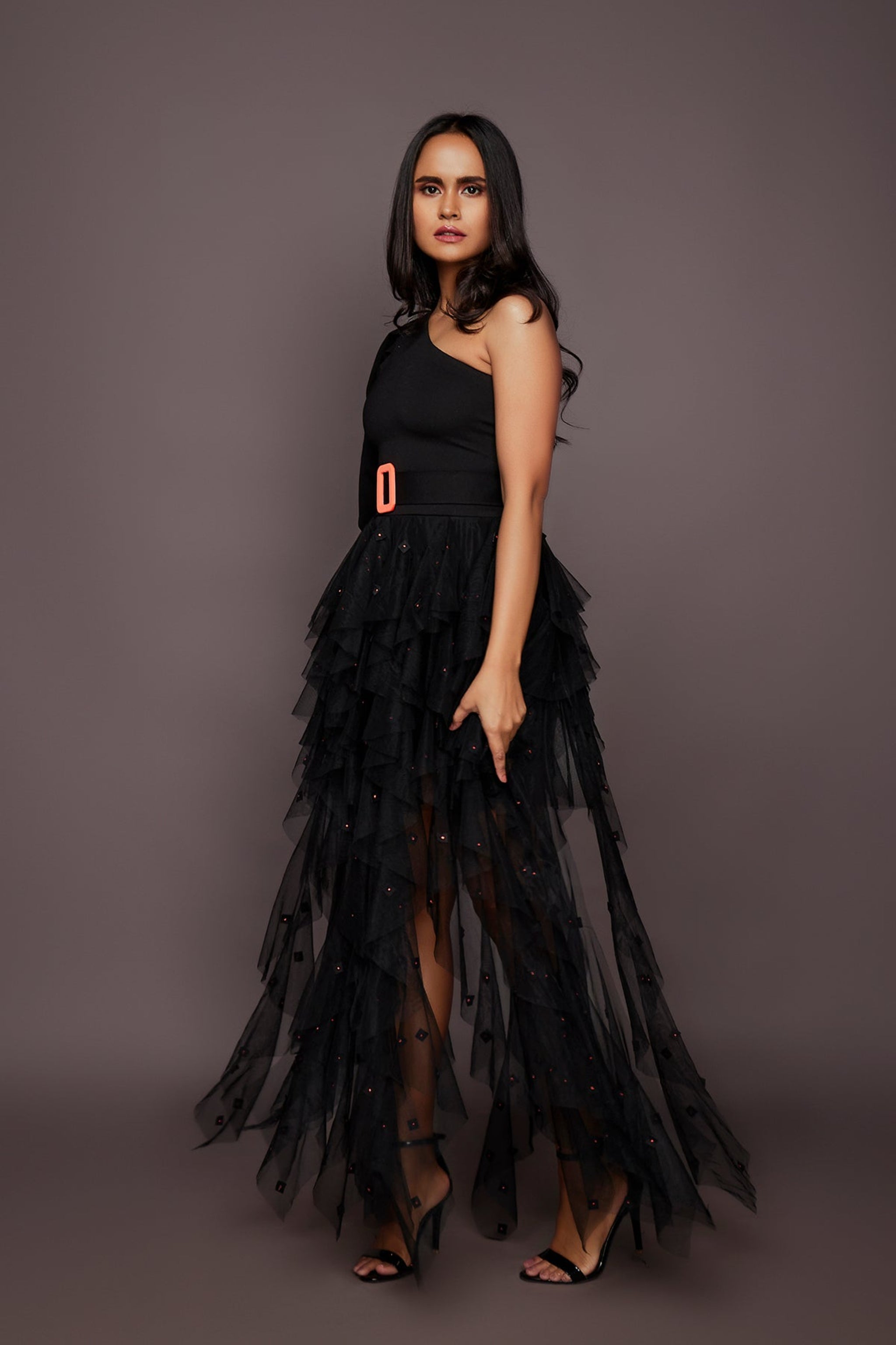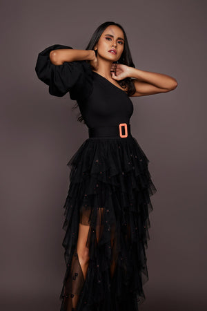 • One shoulder bodysuit with ruffled skirt with neon cutwork detailing & attached inner comes with a belt