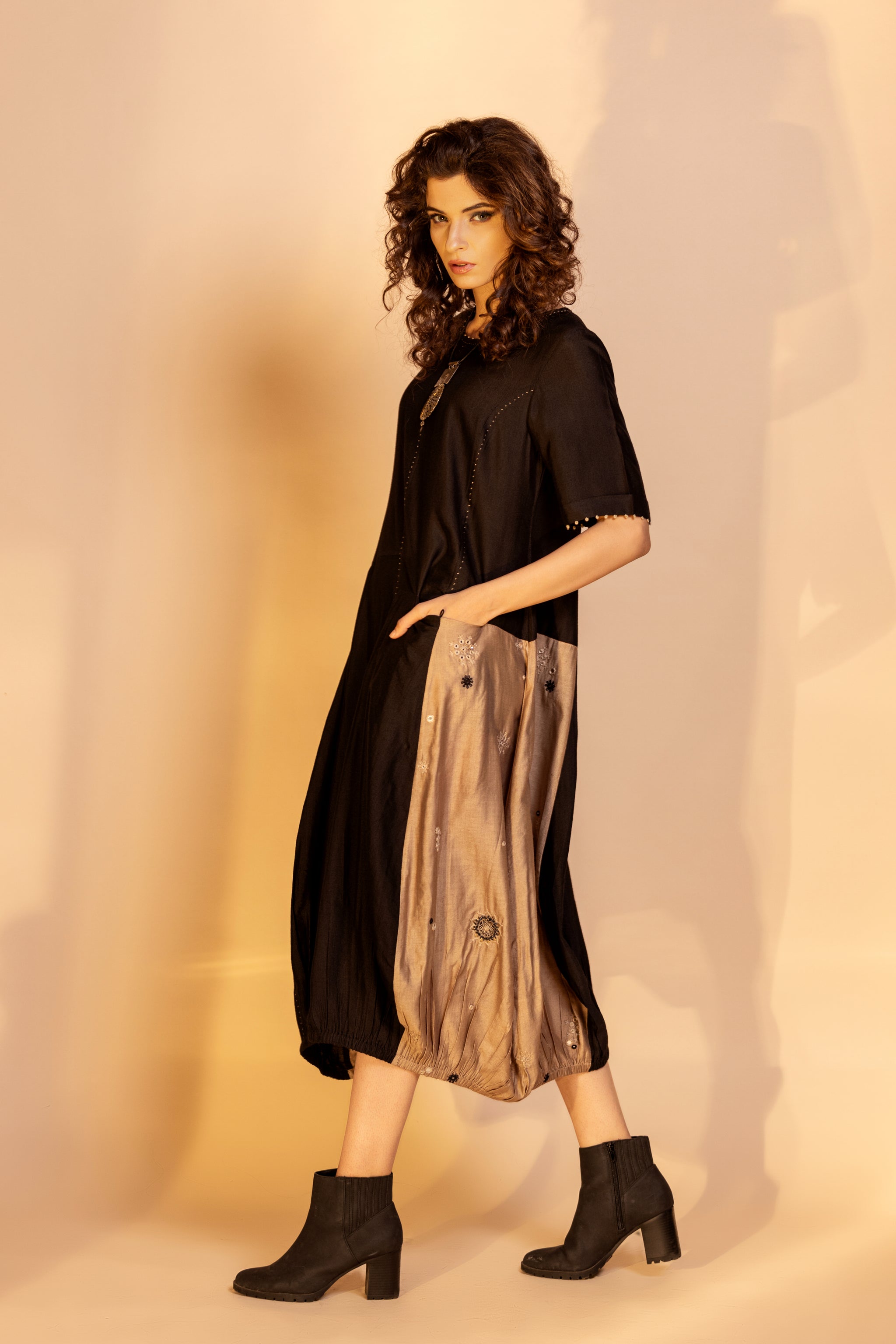 • A balloon-fitted, multi-panelled, long dress with ebullient colour blocking on side panels. Embellished with intricate embroidery and applique work with a mirror-and-thread motif, the U-neckline, pockets, and sleeve edge exhibit refined hand detailing. The hem is finished with a delicate hemming.