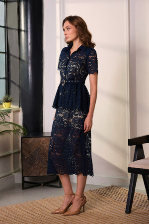 • Embrace effortless elegance with this relaxed-fit co-ord set. The peplum top features a front placket with gold metallic buttons, half sleeves finished with scallop detailing, a solid collar, and a seperate belt for versatile styling. Paired with a relaxed-fit midi skirt with an elasticated back waistband and a side zipper closure