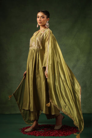 • This 2pc kurta set comes with heavily embroidered zardosi yoke and butis spread all over the kurta. The hem of the sleeves and pants are embellished with gold tikki hangings. Optional embroidered organza dupatta available on request.