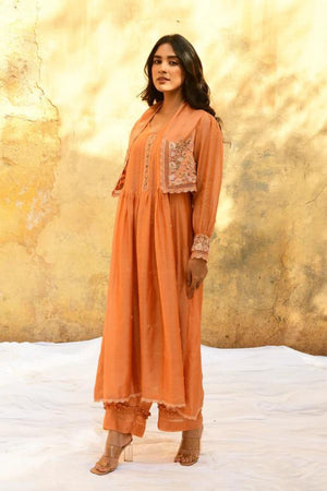 • This kurta set comes with an attached, short chic jacket with a profusion of bullion and lachha flowers, highlighted with pearls, beads and 3d organza buds. The cuff of the sleeves has the similar embroidery details with broad pleats on the yoke and an embroidered patti. The kurta also has a sprinkle of french knot geethas. Pant comes with pleating and frill details. Embroidered organza dupatta available on request.