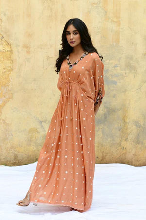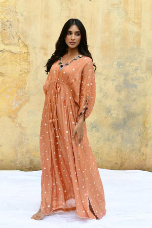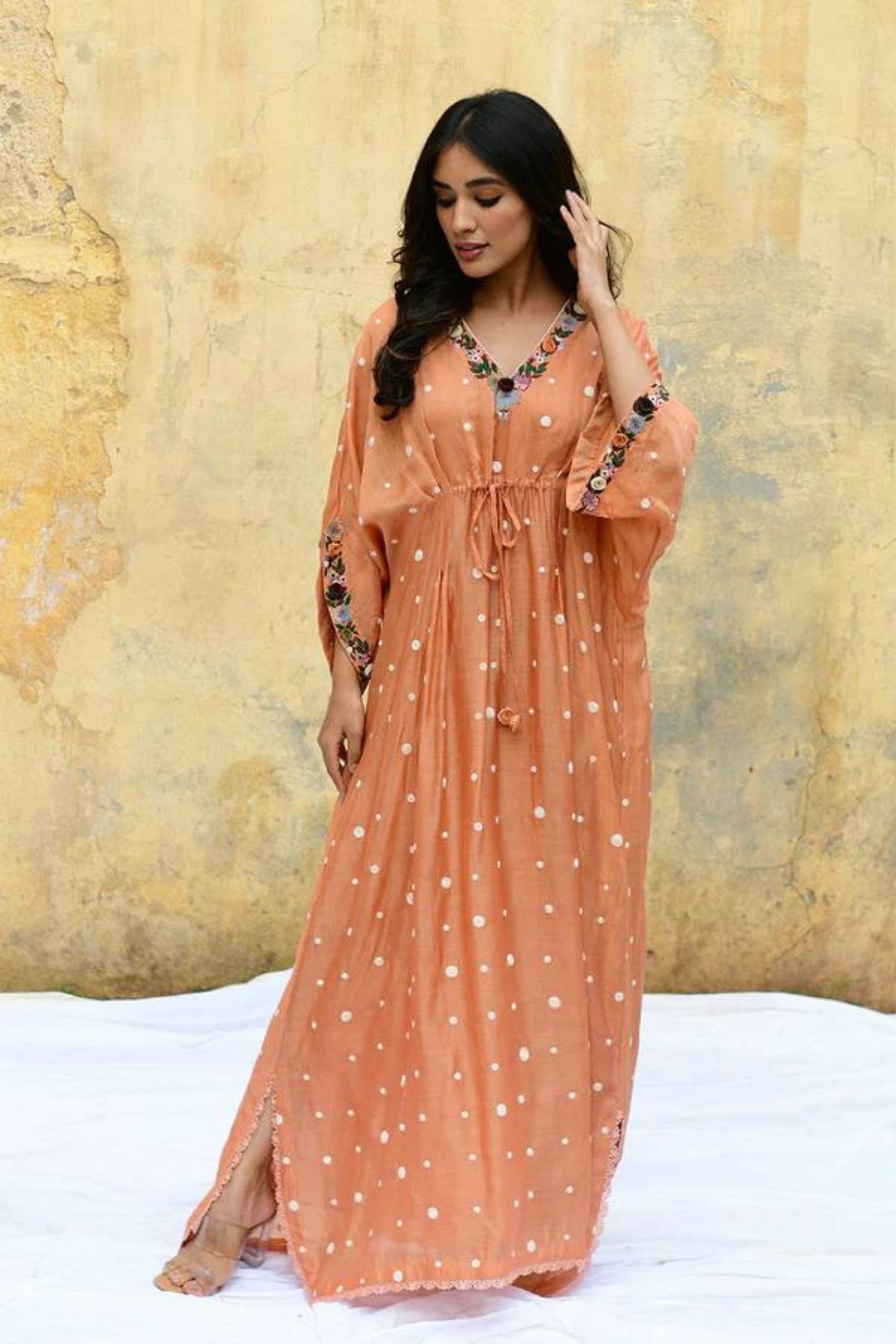 • The embroidered ankle length kaftan is a fusion of comfort and style, embroidered with floral applique motifs and resham, highlighted with 3d handcrafted rosettes. It comes with an additional slip.