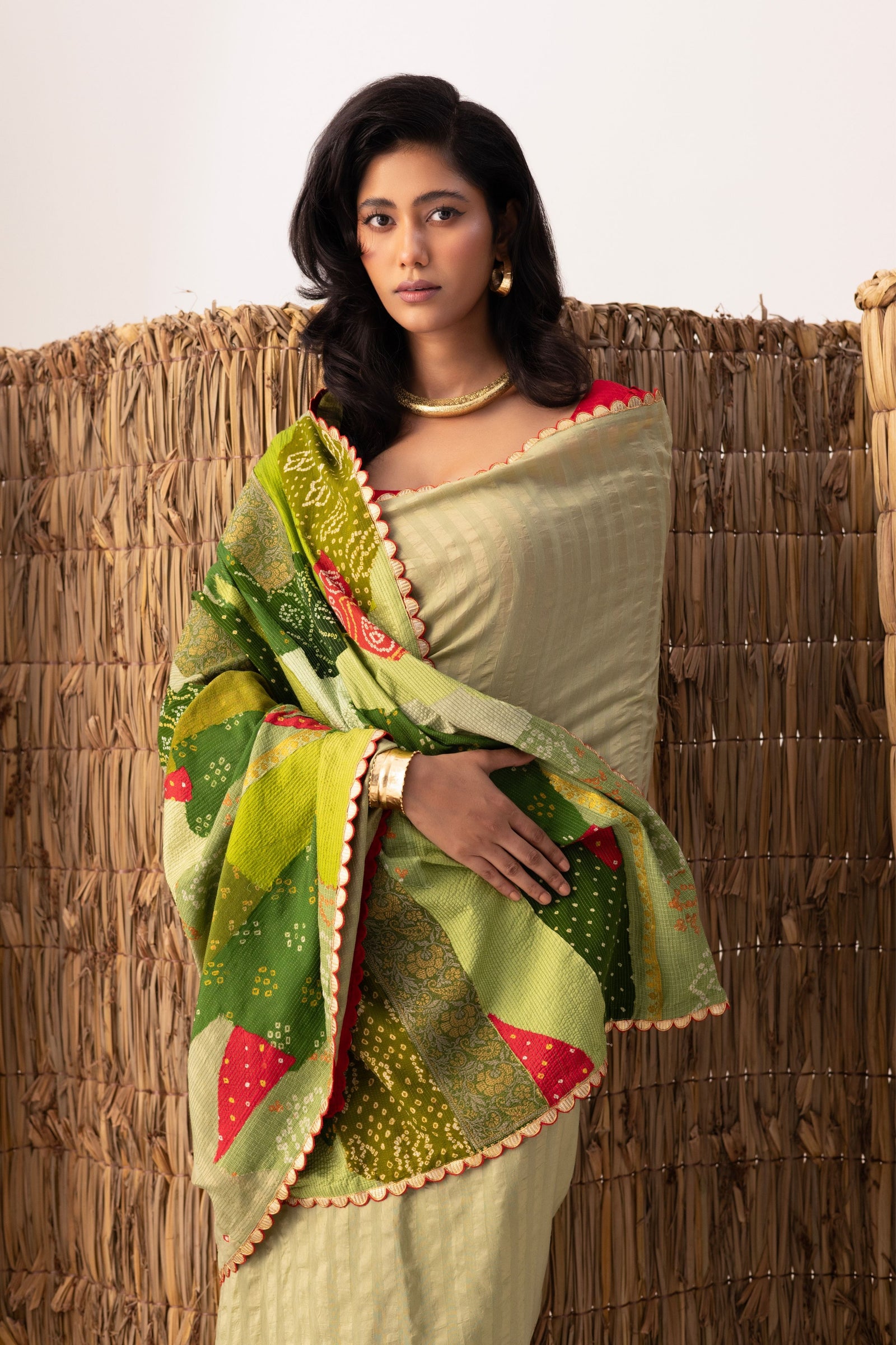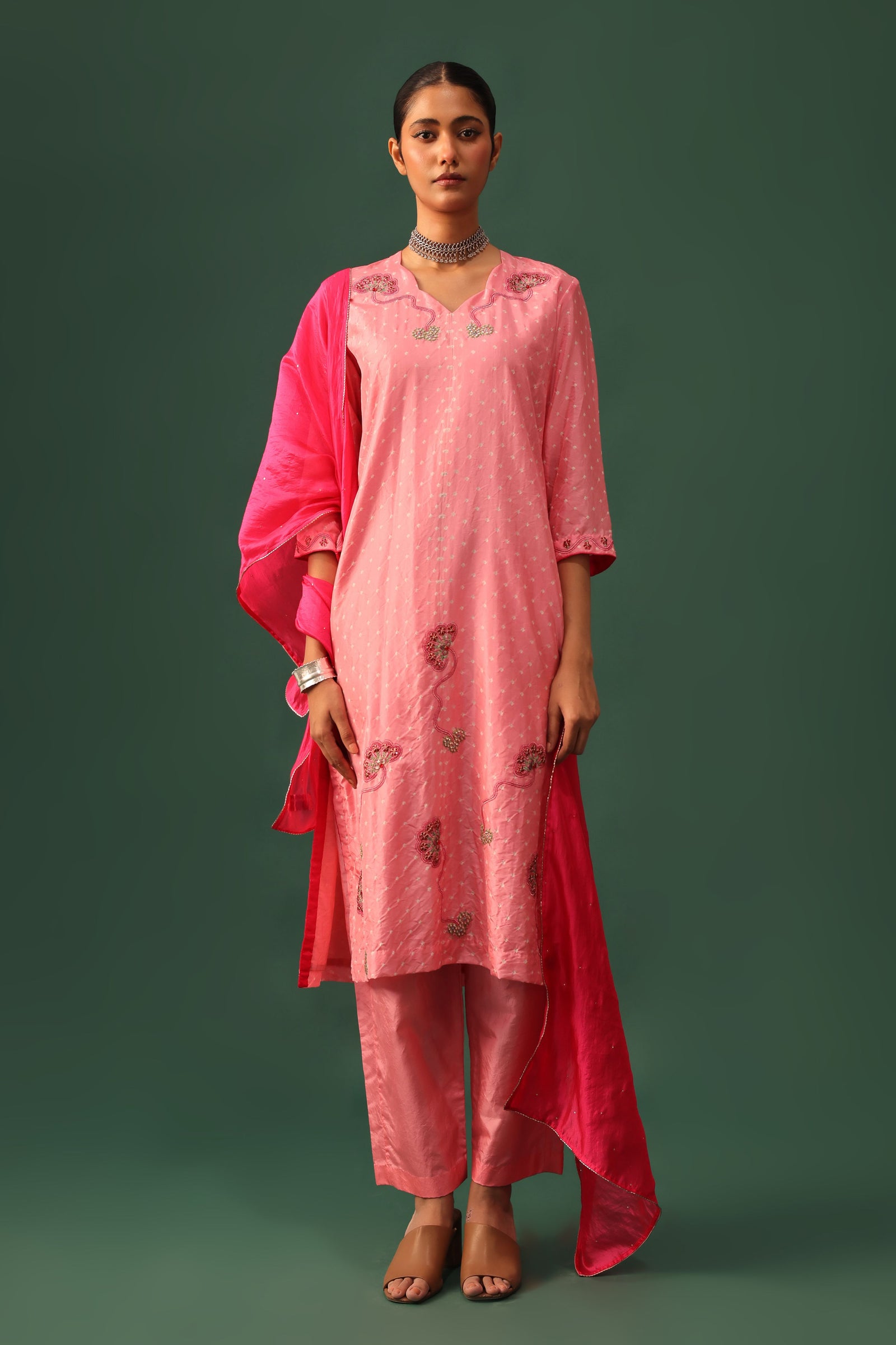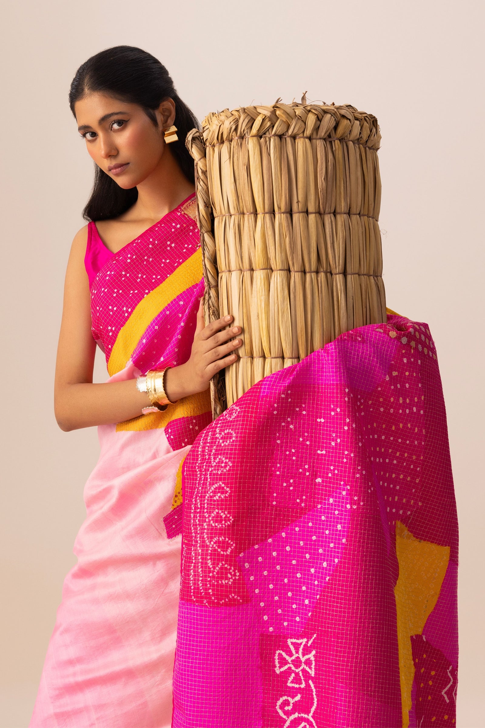 • This Bandhani on pure Organza saree with pattern on pallu comes in shades of peach and pink . The saree comes with a pure silk blouse piece in peach.