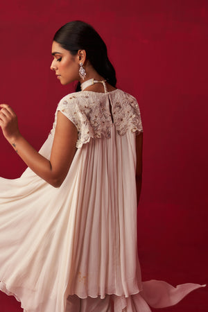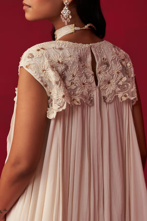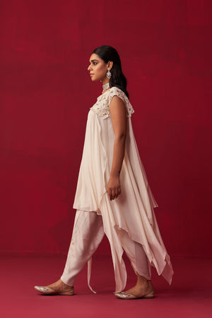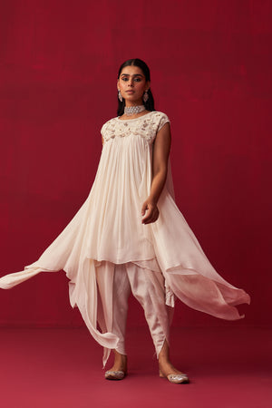 • Ivory georgette layered tunic with pixelated floral embroidered bodice, paired with dhoti pant