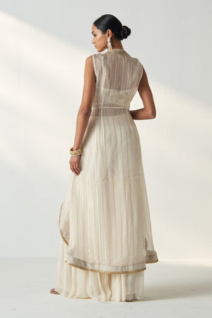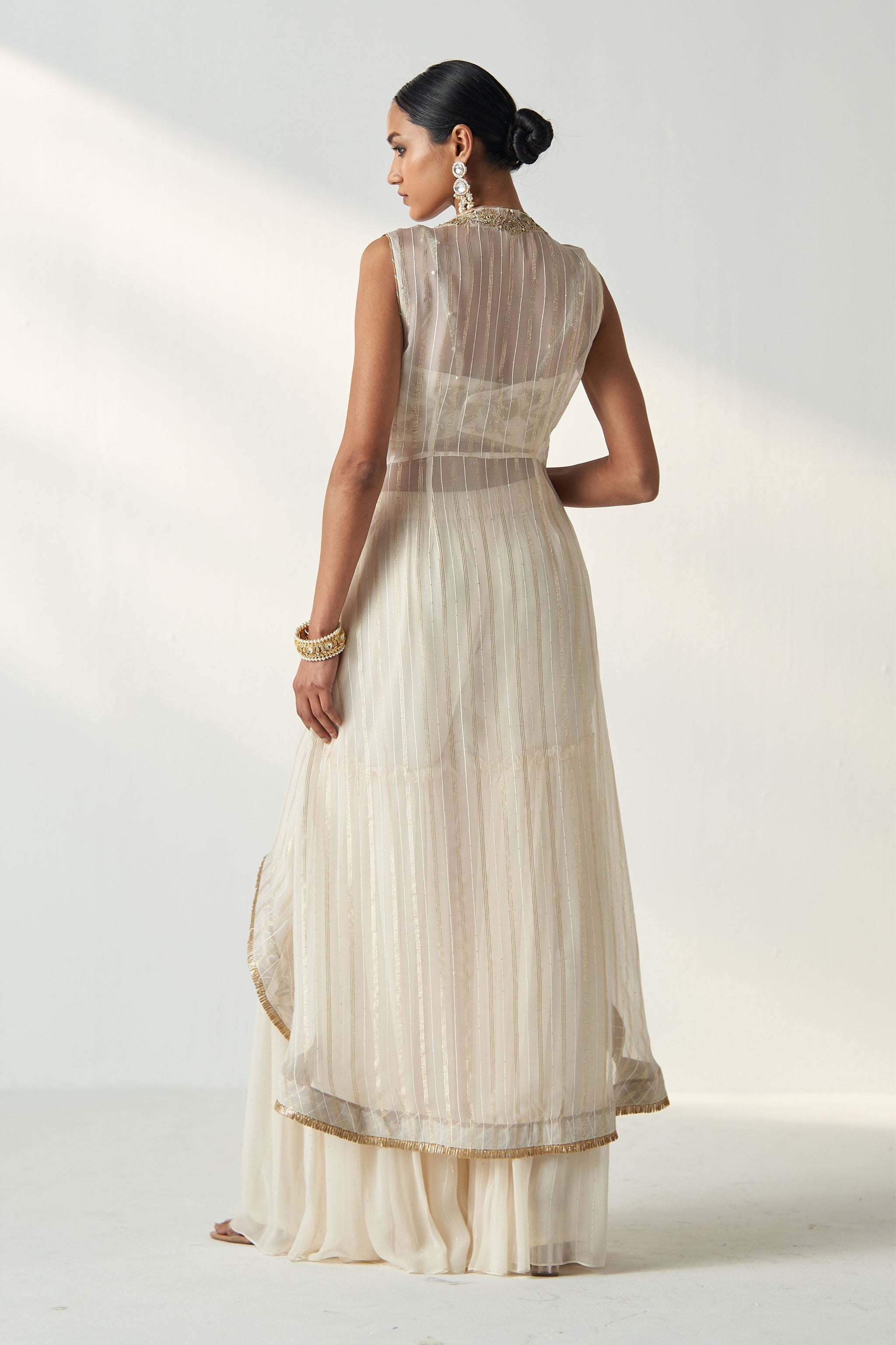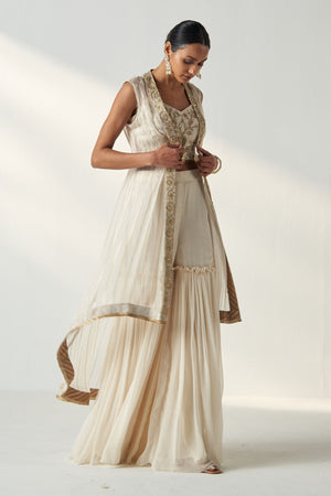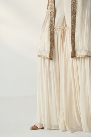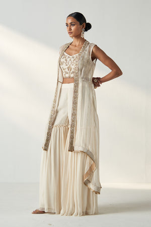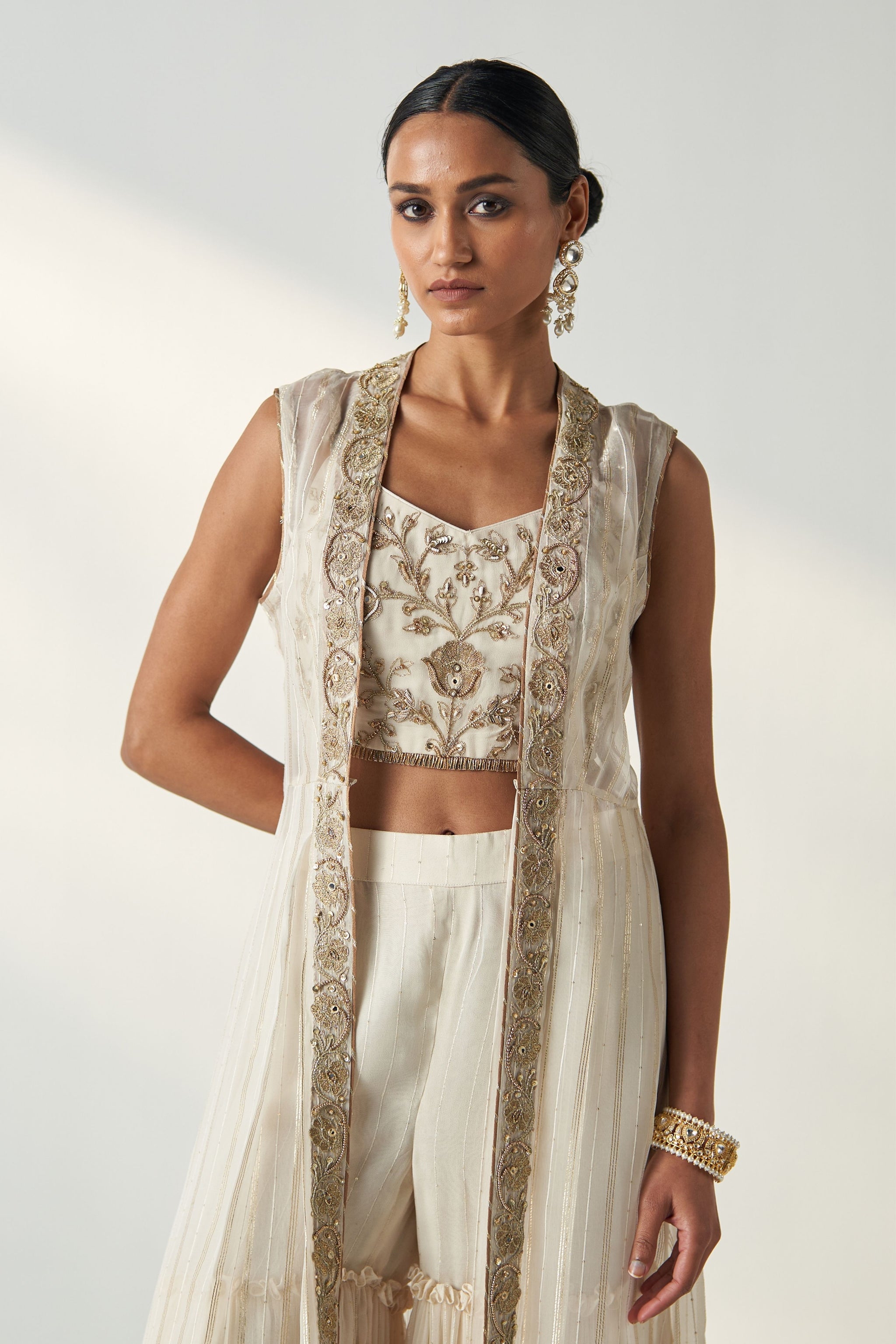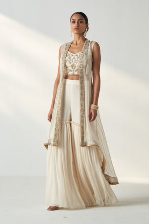 • This set includes organza lurex cape set with intricate embroidery, gharara pants, and embroidered bustier for ultimate elegance