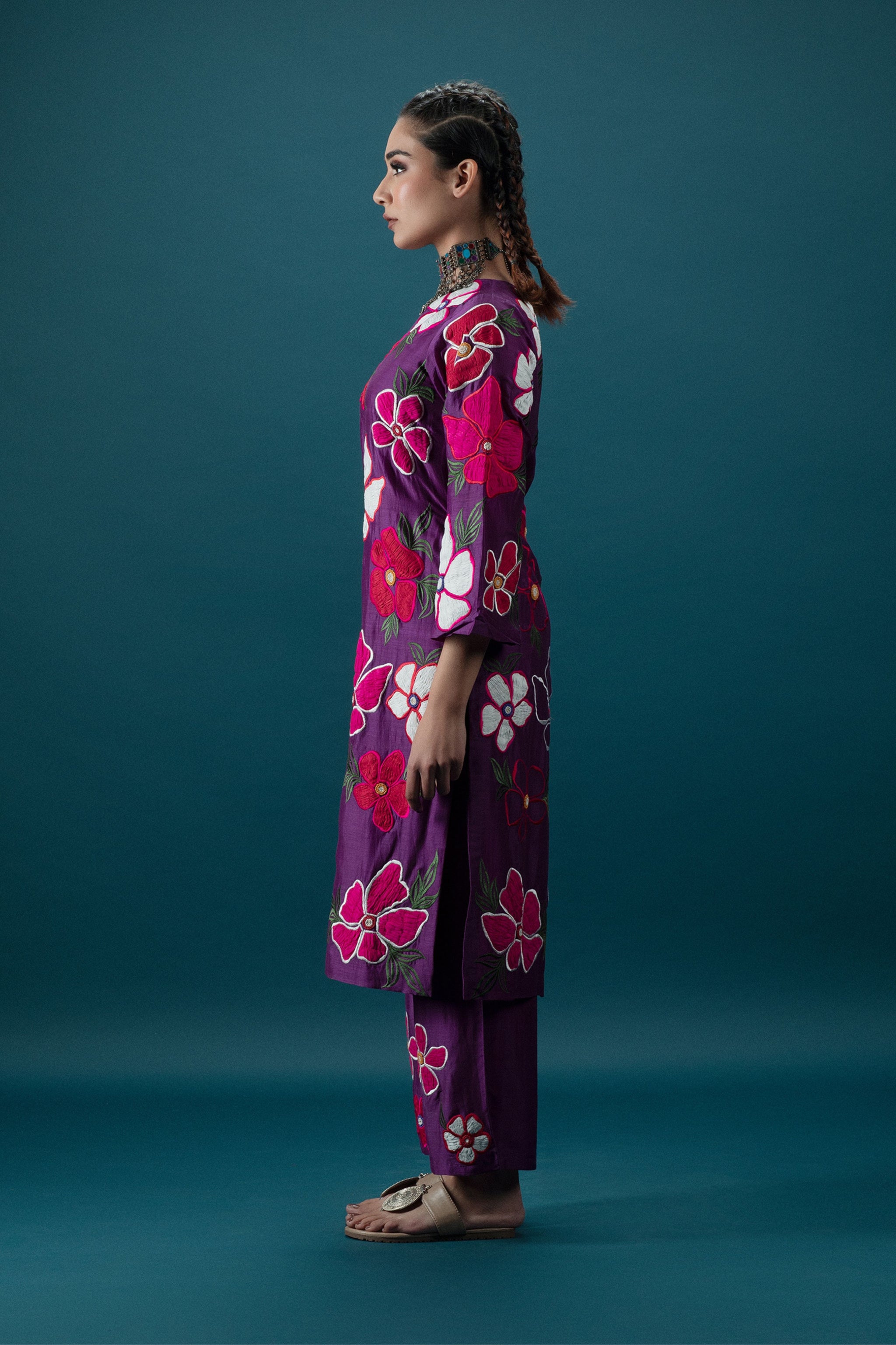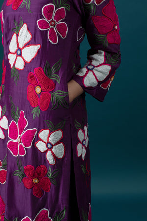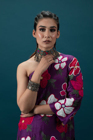 • Featuring chanderi purple one shoulder 3d floral embroidered kurta decorated with beads. It is paired with purple embroidered chanderi pants.