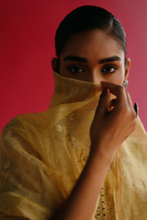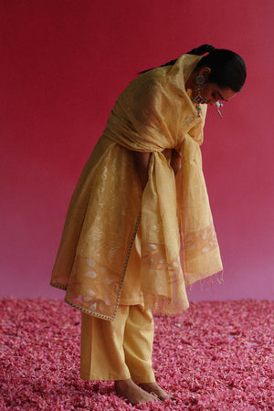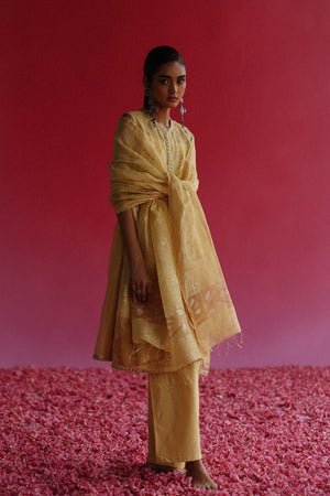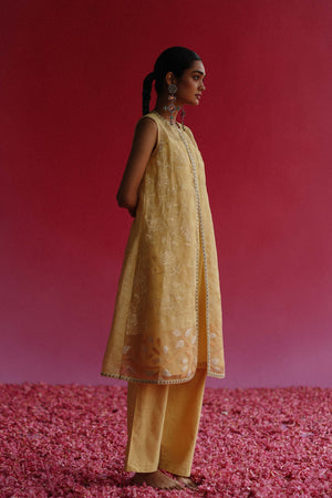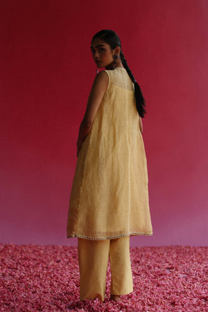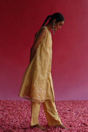 • A pure linen silk handloom sequin weave fabric delicately embroidered sleeveless jacket kurta with traditional zari jamdani weaving border on the daaman, and an all over zari work border. The jacket kurta comes with an inner slip made of pure khadi cotton