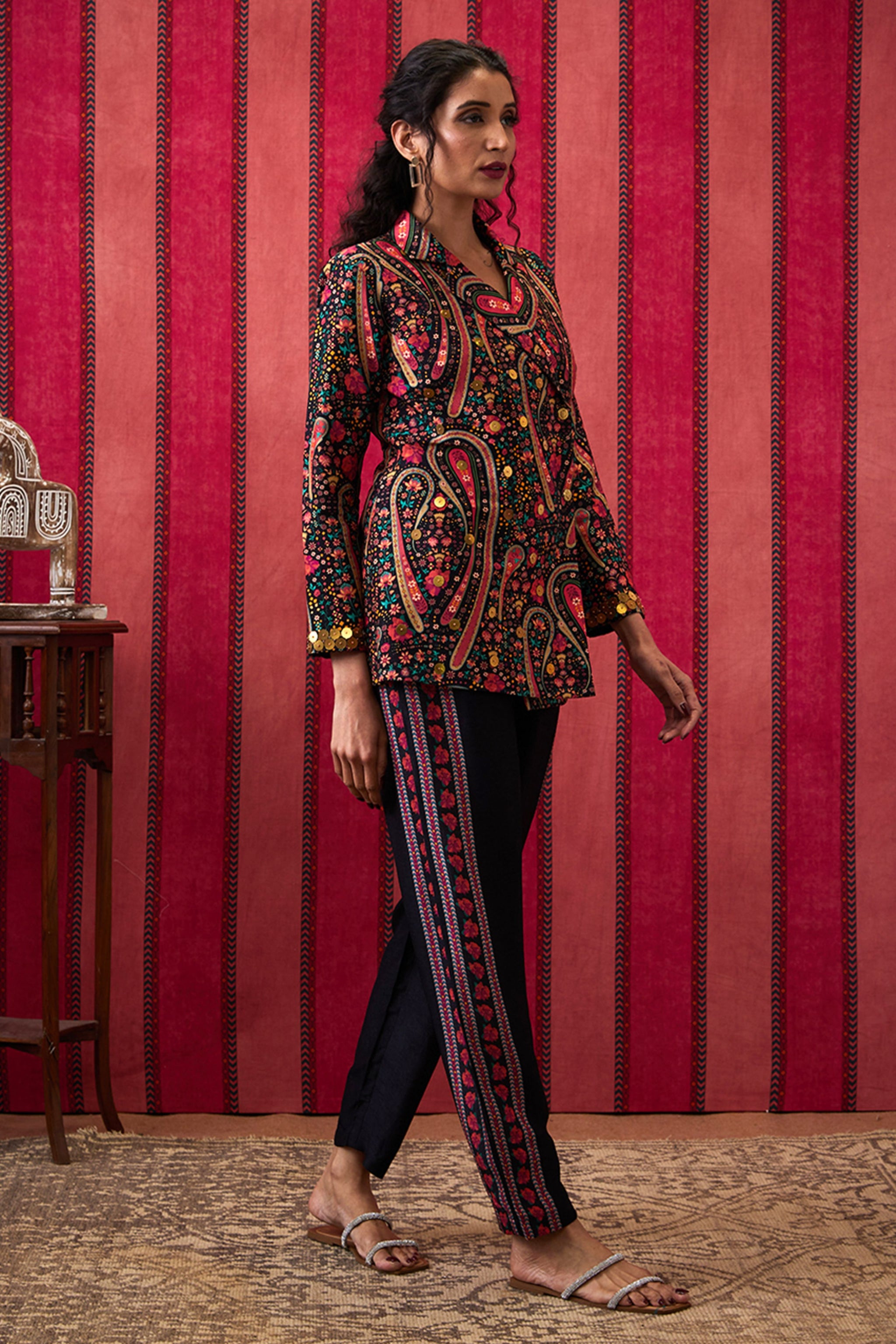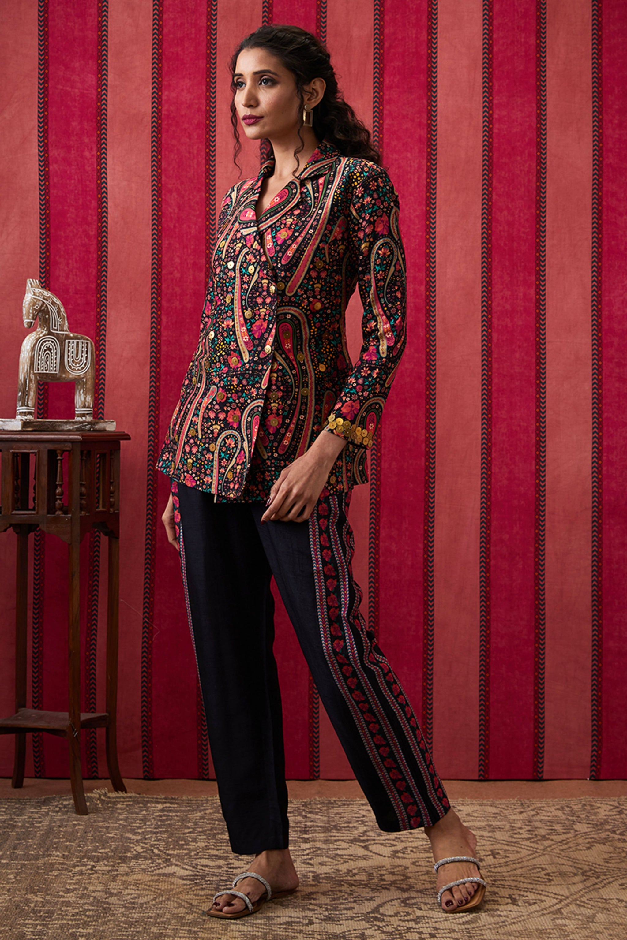 • Black Qala Embellished Blazer Top With Pants In Malaysian Silk.