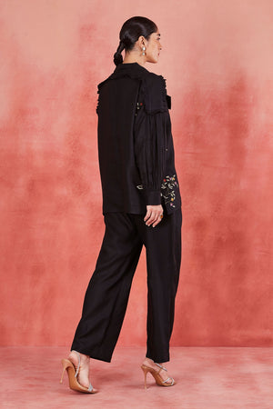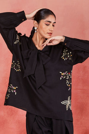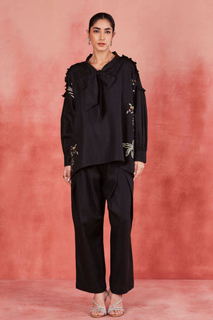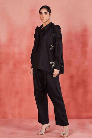 • This black pure linen co-ordinate set is a masterpiece of understated luxury. The shirt, with its elegant tie-knot collar, drapes gracefully with full gathered sleeves and delicate cuffs, accentuated by intricate gathered detailing on the shoulders. It is paired with matching pleated, loose-fit pants featuring side pockets, creating a harmonious flow. The shirt is adorned with exquisite multi-color silk thread floral motif embroidery. This handcrafted ensemble showcases unique charm and character. It may have slight irregularities in pattern, colour, or texture, celebrating the craftsmanship and individuality of each piece. Embrace these variations as a part of the product's story, crafted with care and attention to detail.