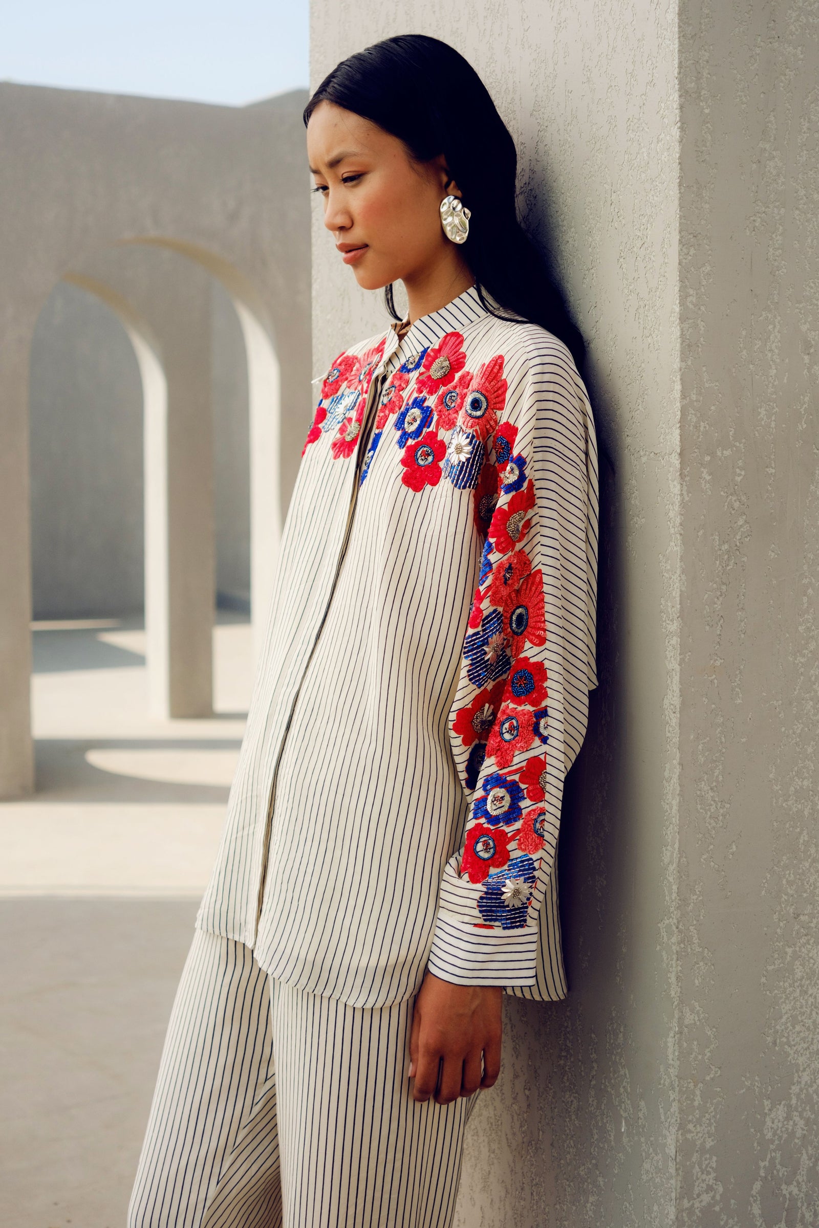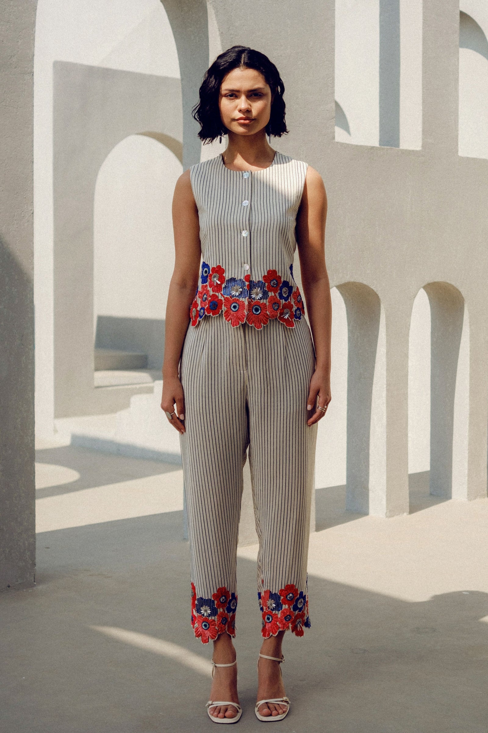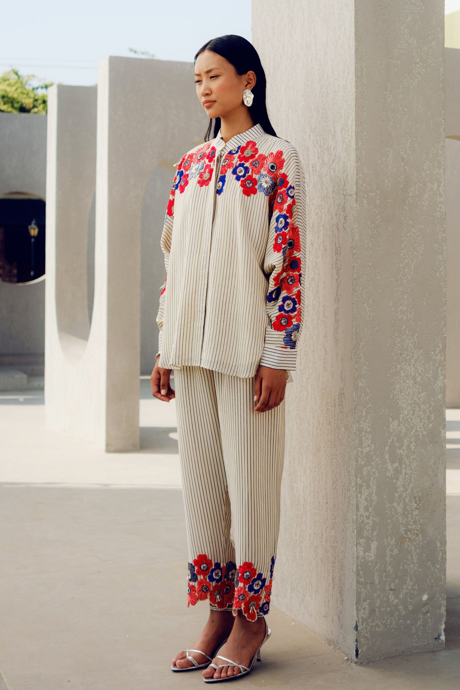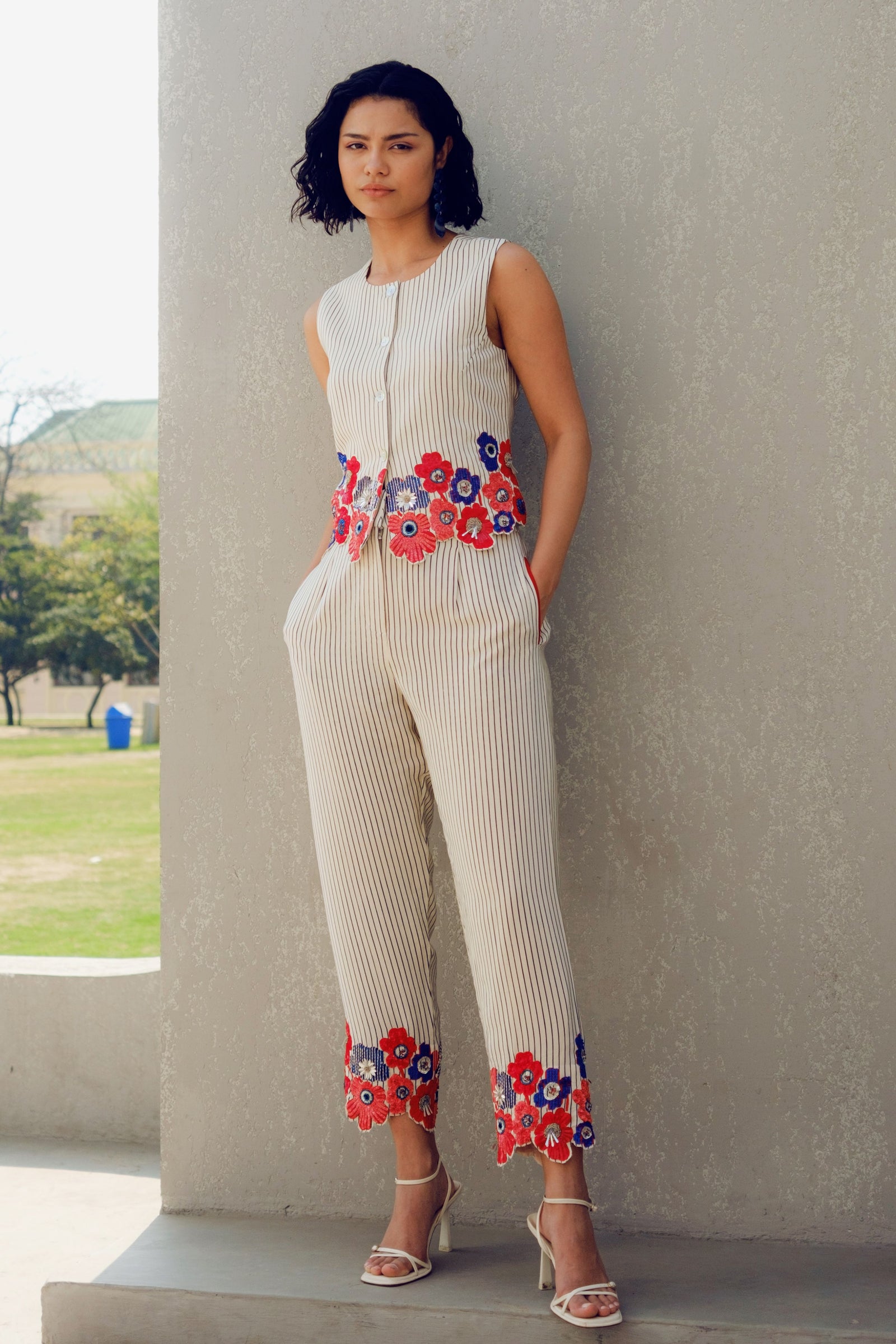 • The Red Margot waistcoat co-ord set is made of pure crepe. It features delicate floral embroidery and sequins detailing at the hemline of the shirt and trousers.
