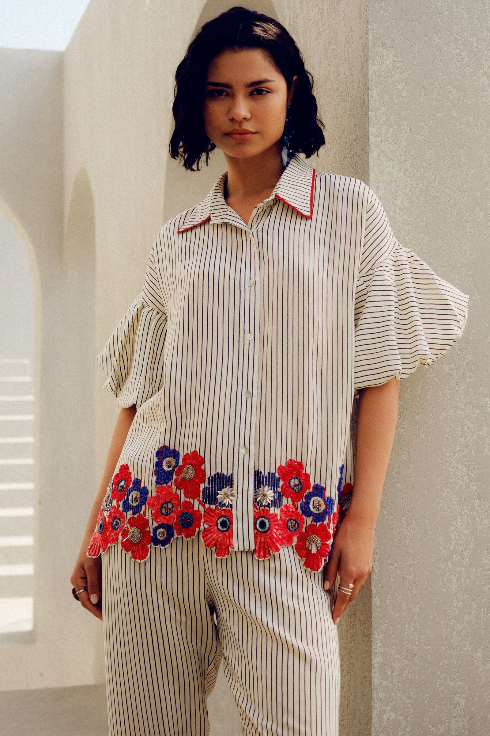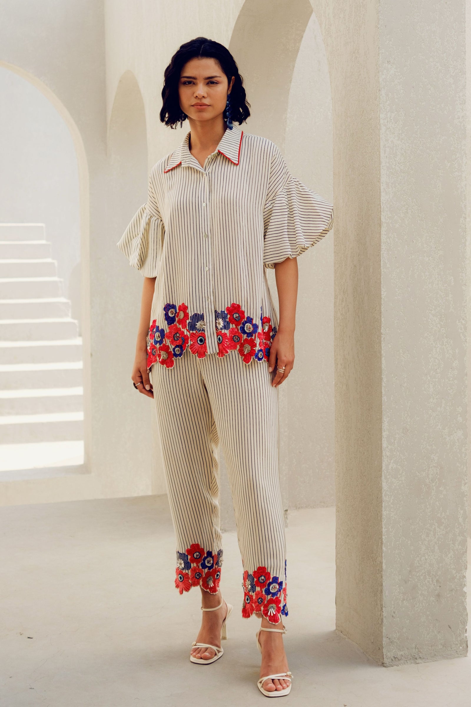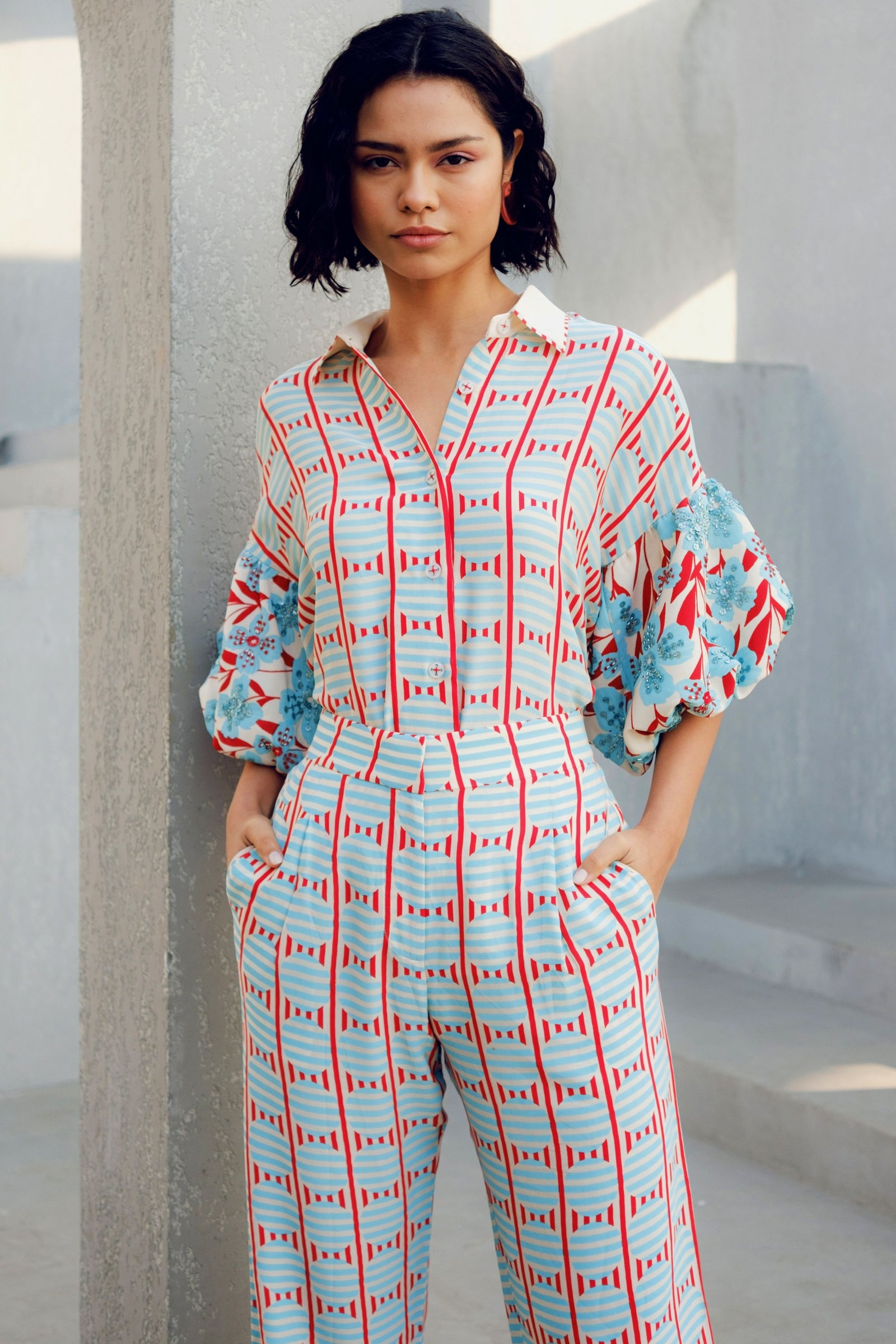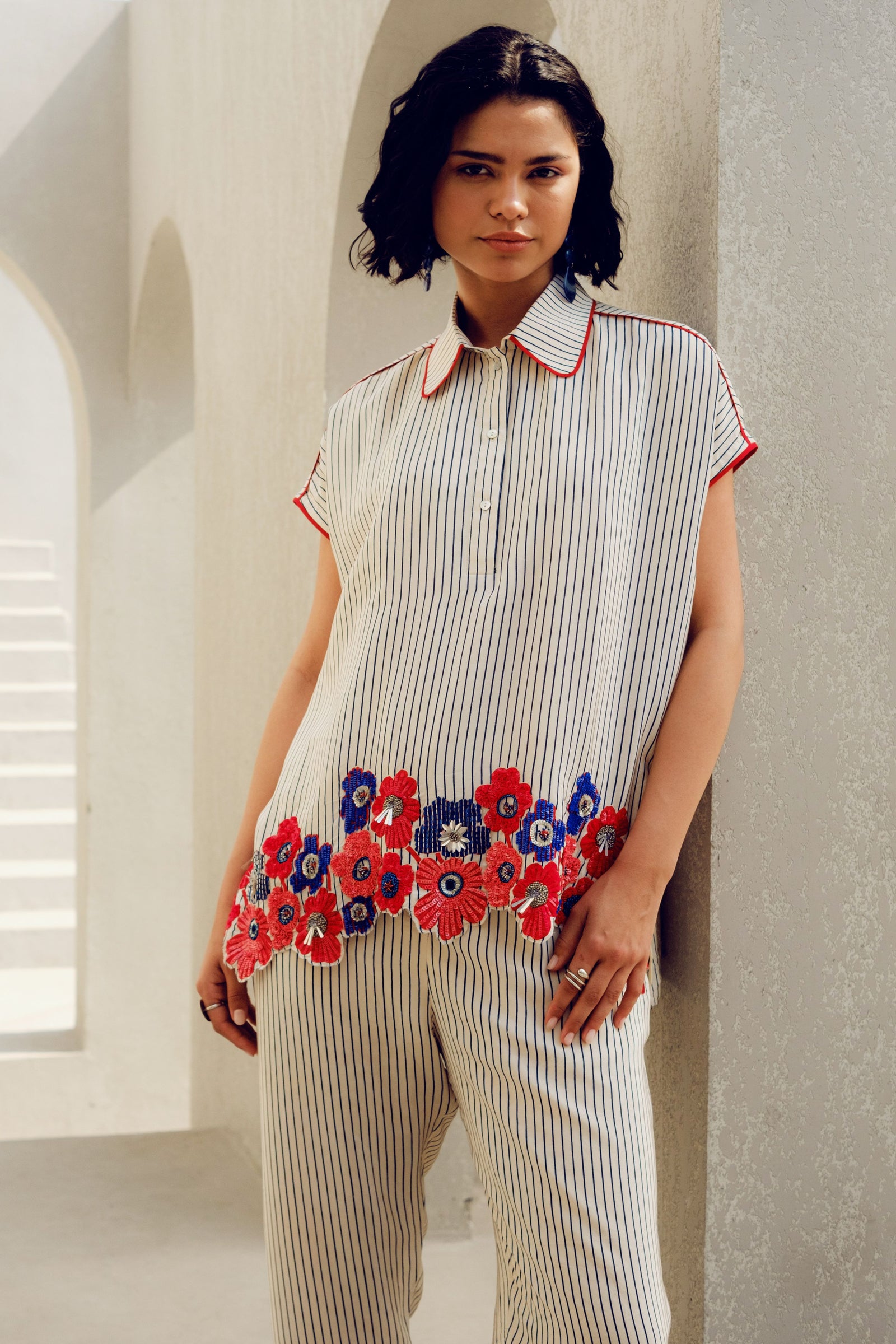 • The Red Margot waistcoat co-ord set is made of pure crepe. It features delicate floral embroidery and sequins detailing at the hemline of the shirt and trousers.
