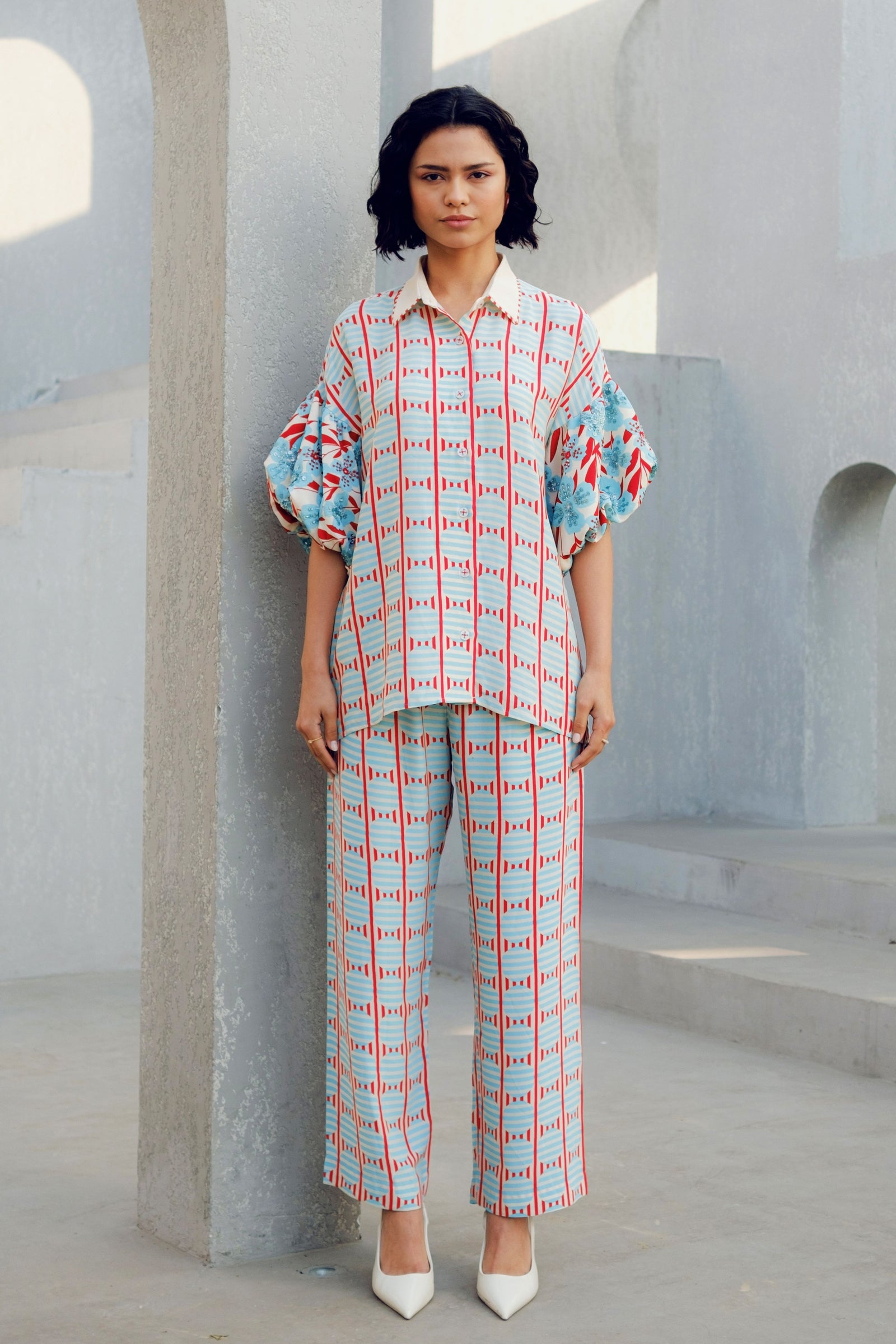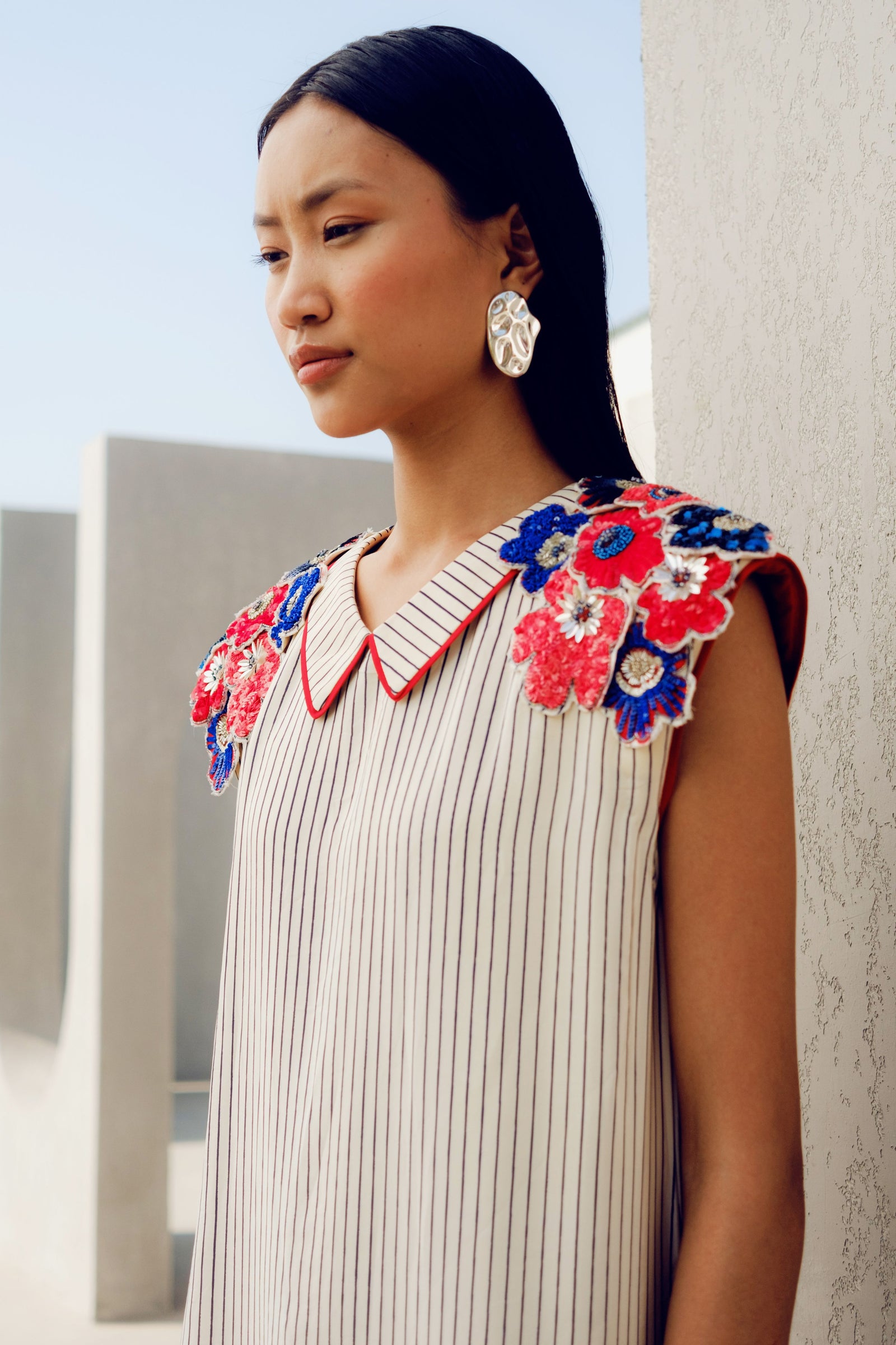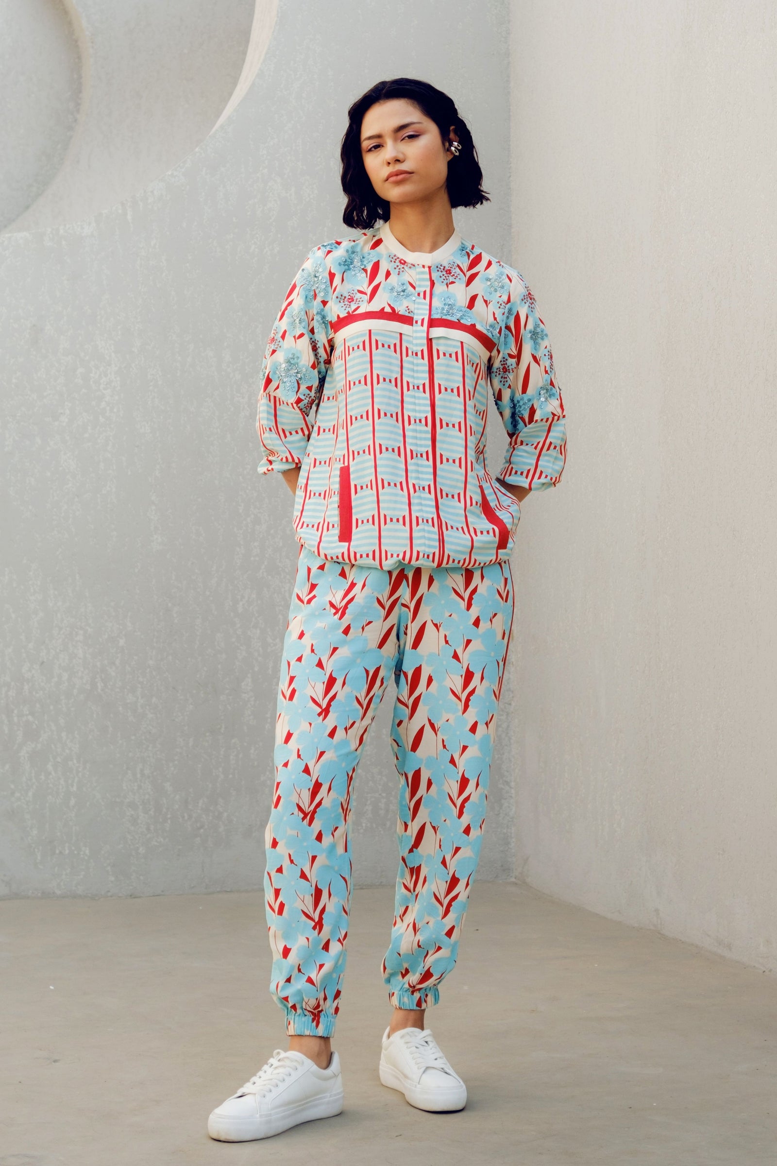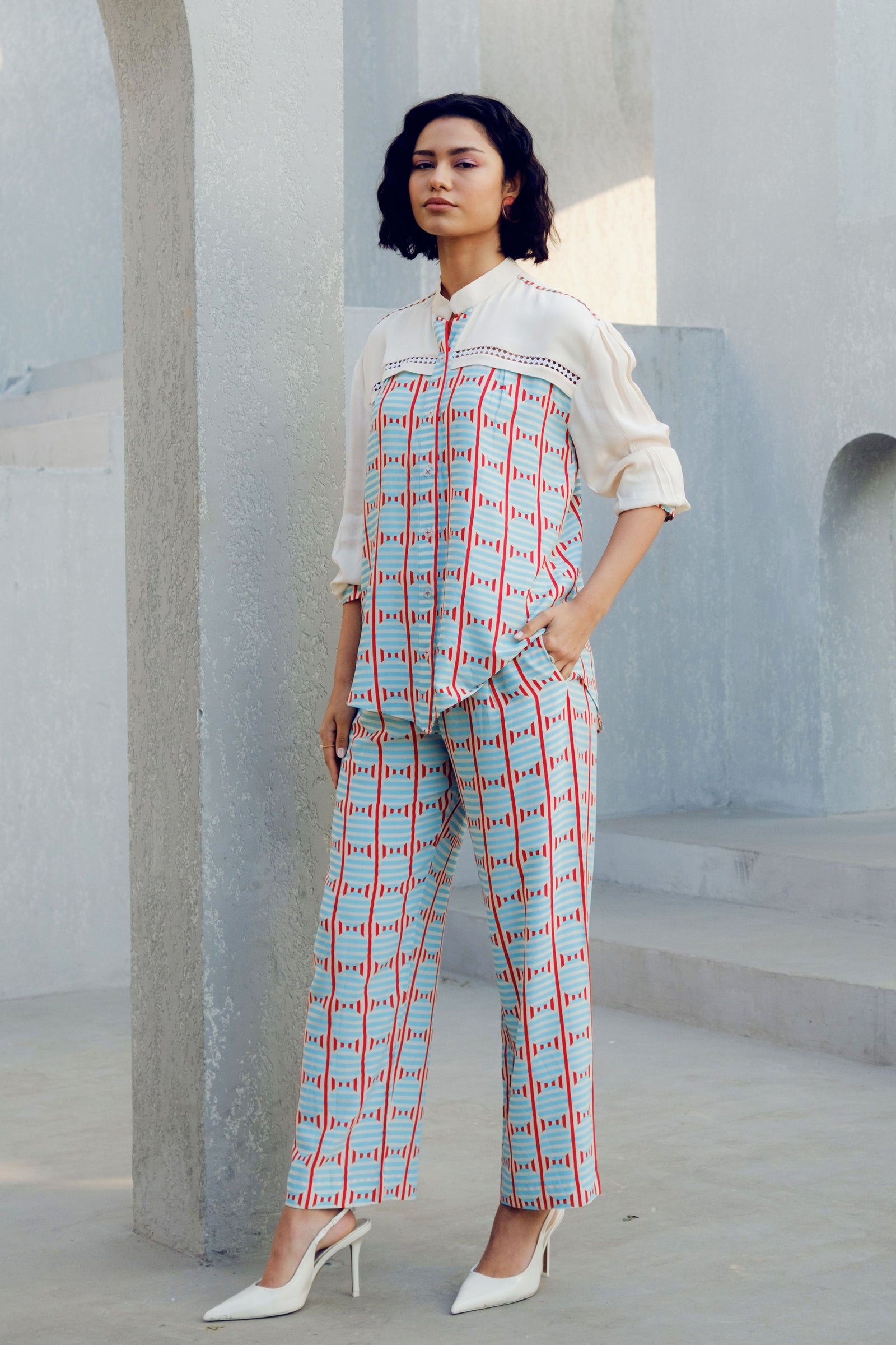 • The Red Margot waistcoat co-ord set is made of pure crepe. It features delicate floral embroidery and sequins detailing at the hemline of the shirt and trousers.